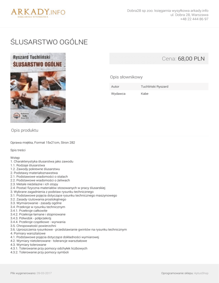 Dobra28 sp zoo. księgarnia wysyłkowa arkady.info ul. Dobra 28, Warszawa +48 22 444 86 97 ŚLUSARSTWO OGÓLNE Cena: 68,00 PLN Opis słownikowy Autor Tuchliński Ryszard Wydawca Kabe Opis produktu Oprawa miękka, Format 15x21cm, Stron 282 Spis treści Wstęp 1. Charakterystyka ślusarstwa jako zawodu 1.1. Rodzaje ślusarstwa 1.2. Zawody pokrewne ślusarstwu 2. Podstawy materiałoznawstwa 2.1. Podstawowe wiadomości o stalach 2.2. Podstawowe wiadomości o żeliwach 2.3. Metale nieżelazne i ich stopy 2.4. Postać fizyczna materiałów stosowanych w pracy ślusarskiej 3. Wybrane zagadnienia z podstaw rysunku technicznego 3.1. Podstawowe pojęcia dotyczące rysunku technicznego maszynowego 3.2. Zasady rzutowania prostokątnego 3.3. Wymiarowanie - zasady ogólne 3.4. Przekroje w rysunku technicznym 3.4.1. Przekroje całkowite 3.4.2. Przekroje łamane i stopniowane 3.4.3. Półwidok - półprzekrój 3.4.4. Przekroje cząstkowe - wyrwania 3.5. Chropowatość powierzchni 3.6. Uproszczenia rysunkowe - przedstawianie gwintów na rysunku technicznym 4. Pomiary warsztatowe 4.1. Podstawowe pojęcia dotyczące dokładności wymiarowej 4.2. Wymiary nietolerowane - tolerancje warsztatowe 4.3. Wymiary tolerowane 4.3.1. Tolerowanie przy pomocy odchyłek liczbowych 4.3.2. Tolerowanie przy pomocy symboli Plik wygenerowano: 09-03-2017 Oprogramowanie sklepu: AptusShop Dobra28 sp zoo. księgarnia wysyłkowa arkady.info ul. Dobra 28, Warszawa +48 22 444 86 97 4.4. Warsztatowe przyrządy pomiarowe 4.4.1. Podziałka Noniusza - pomiary suwmiarką 4.4.2. Podziałka Noniusza - pomiary przyrządami mikrometrycznymi 4.4.3. Inne rodzaje pomiarów warsztatowych 4.4.4. Podstawowe wiadomości o pomiarze twardości 5. Przedobróbkowe prace ślusarskie 5.1. Trasowanie metali 5.1.1. Stanowisko traserskie i jego wyposażenie 5.1.2. Zasady trasowania ślusarskiego 5.1.3 Technika trasowania płaszczyznowego 5.1.4. Technika trasowania przestrzennego 5.2. Cięcie, przecinanie i wycinanie metali 5.2.1. Cięcie, przecinanie i wycinanie ślusarskimi narzędziami ręcznymi 5.2.2. Elektronarzędzia do cięcia, przecinania i wycinania 5.2.3. Nożyce gilotynowe 5.2.4. Piły mechaniczne do metali 5.2.5. Wykorzystanie pras do przecinania i wycinania 5.2.6. Urządzenia specjalne do cięcia, przecinania i rozginania 6. Ślusarska obróbka plastyczna 6.1. Gięcie prętów, rur i kształtowników 6.1.1. Gięcie przy pomocy narzędzi ręcznych 6.1.2. Gięcie ręczne z wykorzystaniem technik pomocniczych 6.1.3. Giętarki stacjonarne matrycowe 6.1.4. Giętarki stacjonarne rolkowe 6.2. Skręcanie prętów i płaskowników 6.3. Zawijanie i gięcie narożne blach 6.4. Tłoczenie na zimno i wyoblanie 6.5. Prostowanie wyrobów metalowych 7. Obróbkowe prace ślusarskie 7.1. Piłowanie pilnikami ręcznymi 7.1.1. Piłowanie płaszczyzn pilnikami ręcznymi 7.1.2. Piłowanie powierzchni kształtowych pilnikami ręcznymi 7.1.3. Piłowanie według wzornika - ręczne dorabianie kluczy 7.2. Pilnikarki 7.2.1. Pilnikarki obrotowe 7.2.2. Pilnikarki tłokowe 7.2.3. Pilnikarki taśmowe 7.3. Szlifierki warsztatowe w pracach ślusarskich 7.4. Ślusarska obróbka otworów walcowych 7.4.1. Parametry skrawania dotyczące wiercenia 7.4.2. Wiertarki i ich podział 7.4.3. Uchwyty i narzędzia do prac wiertarskich 7.4.4. Typowe prace wiertarskie 7.5. Gwintowanie 7.5.1. Gwintowanie ręczne przy pomocy narzynek 7.5.2. Gwintowanie przy pomocy gwintownic ręcznych 7.5.3. Gwintowanie otworów gwintownikami 7.5.4. Gwintowanie przy pomocy elektronarzędzi 7.6. Skrobanie 7.7. Docieranie 7.8. Gładzenie i polerowanie 7.9. Frezowanie kopiujące kluczy 8. Inne rodzaje prac ślusarskich 8.1. Połączenia elementów metalowych 8.2. Połączenia lutowane 8.2.1. Lutowanie miękkie 8.2.2. Lutowanie twarde 8.3. Nitowanie 8.3.1. Nitowanie ręczne Plik wygenerowano: 09-03-2017 Oprogramowanie sklepu: AptusShop Dobra28 sp zoo. księgarnia wysyłkowa arkady.info ul. Dobra 28, Warszawa +48 22 444 86 97 8.3.2. Nitowanie maszynowe 9. Bhp w pracach ślusarskich Rok wydania 2014 Plik wygenerowano: 09-03-2017 Powered by TCPDF (www.tcpdf.org) Oprogramowanie sklepu: AptusShop