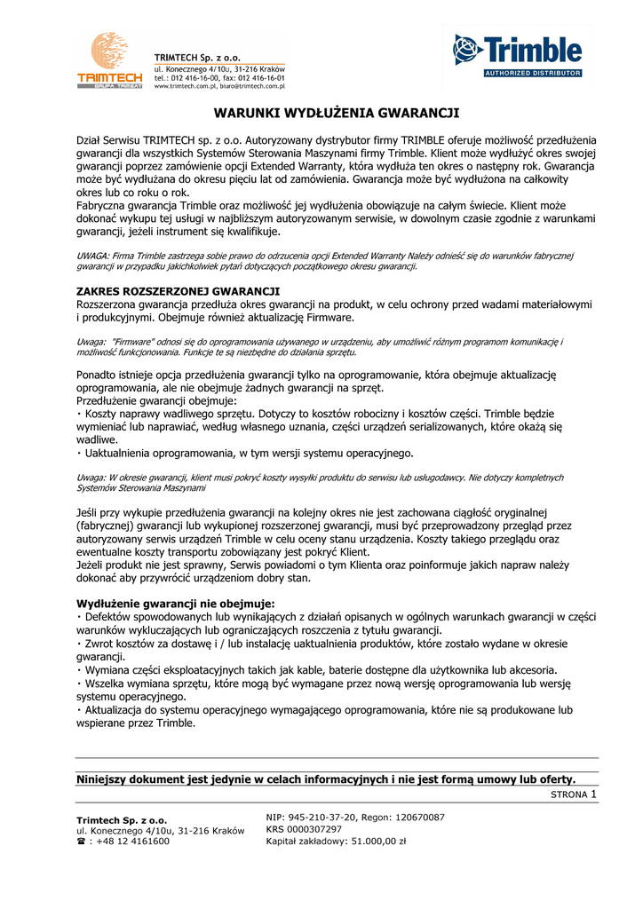 WARUNKI WYDŁUŻENIA GWARANCJI Dział Serwisu TRIMTECH sp. z o.o. Autoryzowany dystrybutor firmy TRIMBLE oferuje możliwość przedłużenia gwarancji dla wszystkich Systemów Sterowania Maszynami firmy Trimble. Klient może wydłużyć okres swojej gwarancji poprzez zamówienie opcji Extended Warranty, która wydłuża ten okres o następny rok. Gwarancja może być wydłużana do okresu pięciu lat od zamówienia. Gwarancja może być wydłużona na całkowity okres lub co roku o rok. Fabryczna gwarancja Trimble oraz możliwość jej wydłużenia obowiązuje na całym świecie. Klient może dokonać wykupu tej usługi w najbliższym autoryzowanym serwisie, w dowolnym czasie zgodnie z warunkami gwarancji, jeżeli instrument się kwalifikuje. UWAGA: Firma Trimble zastrzega sobie prawo do odrzucenia opcji Extended Warranty Należy odnieść się do warunków fabrycznej gwarancji w przypadku jakichkolwiek pytań dotyczących początkowego okresu gwarancji. ZAKRES ROZSZERZONEJ GWARANCJI Rozszerzona gwarancja przedłuża okres gwarancji na produkt, w celu ochrony przed wadami materiałowymi i produkcyjnymi. Obejmuje również aktualizację Firmware. Uwaga: "Firmware" odnosi się do oprogramowania używanego w urządzeniu, aby umożliwić różnym programom komunikację i możliwość funkcjonowania. Funkcje te są niezbędne do działania sprzętu. Ponadto istnieje opcja przedłużenia gwarancji tylko na oprogramowanie, która obejmuje aktualizację oprogramowania, ale nie obejmuje żadnych gwarancji na sprzęt. Przedłużenie gwarancji obejmuje: Koszty naprawy wadliwego sprzętu. Dotyczy to kosztów robocizny i kosztów części. Trimble będzie wymieniać lub naprawiać, według własnego uznania, części urządzeń serializowanych, które okażą się wadliwe. Uaktualnienia oprogramowania, w tym wersji systemu operacyjnego. Uwaga: W okresie gwarancji, klient musi pokryć koszty wysyłki produktu do serwisu lub usługodawcy. Nie dotyczy kompletnych Systemów Sterowania Maszynami Jeśli przy wykupie przedłużenia gwarancji na kolejny okres nie jest zachowana ciągłość oryginalnej (fabrycznej) gwarancji lub wykupionej rozszerzonej gwarancji, musi być przeprowadzony przegląd przez autoryzowany serwis urządzeń Trimble w celu oceny stanu urządzenia. Koszty takiego przeglądu oraz ewentualne koszty transportu zobowiązany jest pokryć Klient. Jeżeli produkt nie jest sprawny, Serwis powiadomi o tym Klienta oraz poinformuje jakich napraw należy dokonać aby przywrócić urządzeniom dobry stan. Wydłużenie gwarancji nie obejmuje: Defektów spowodowanych lub wynikających z działań opisanych w ogólnych warunkach gwarancji w części warunków wykluczających lub ograniczających roszczenia z tytułu gwarancji. Zwrot kosztów za dostawę i / lub instalację uaktualnienia produktów, które zostało wydane w okresie gwarancji. Wymiana części eksploatacyjnych takich jak kable, baterie dostępne dla użytkownika lub akcesoria. Wszelka wymiana sprzętu, które mogą być wymagane przez nową wersję oprogramowania lub wersję systemu operacyjnego. Aktualizacja do systemu operacyjnego wymagającego oprogramowania, które nie są produkowane lub wspierane przez Trimble. Niniejszy dokument jest jedynie w celach informacyjnych i nie jest formą umowy lub oferty. STRONA Trimtech Sp. z o.o. ul. Konecznego 4/10u, 31-216 Kraków : +48 12 4161600 NIP: 945-210-37-20, Regon: 120670087 KRS 0000307297 Kapitał zakładowy: 51.000,00 zł 1