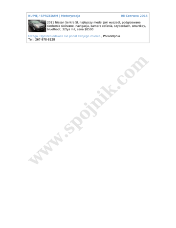 KUPIĘ / SPRZEDAM | Motoryzacja 08 Czerwca 2015 2011 Nissan Sentra Sl, najlepszy model jaki wyszedl, podgrzewane siedzenia skórzane, navigacja, kamera cofania, szyberdach, smartkey, bluethoot, 32tys mil, cena $8500 w w w .s po jn ik .c o m Uwaga. Ogoszeniodawca nie podał swojego imienia., Philadelphia Tel.: 267-978-8128
