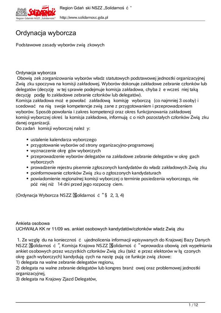 Region Gda ski NSZZ „Solidarno http://www.solidarnosc.gda.pl Ordynacja wyborcza Podstawowe zasady wyborów zwi zkowych Ordynacja wyborcza Obowi zek zorganizowania wyborów władz statutowych podstawowej jednostki organizacyjnej Zwi zku spoczywa na komisji zakładowej. Wyborów dokonuje zakładowe zebranie członków lub delegatów (decyzj w tej sprawie podejmuje komisja zakładowa, chyba e wcze niej tak decyzj podj ło zakładowe zebranie członków lub delegatów). Komisja zakładowa mo e powoła zakładow komisj wyborcz (co najmniej 3 osoby) i scedowa na ni swoje kompetencje zwi zane z przygotowaniem i przeprowadzeniem wyborów. Sposób powołania i zakres kompetencji oraz okres funkcjonowania zakładowej komisji wyborczej okre la komisja zakładowa, informuj c o nich pozostałych członków Zwi zku danej organizacji. Do zada komisji wyborczej nale y: ustalenie kalendarza wyborczego przygotowanie wyborów od strony organizacyjno-programowej wyznaczenie okr gów wyborczych przeprowadzenie wyborów delegatów na zakładowe zebranie delegatów w okr gach wyborczych prowadzenie rejestru pisemnie zgłoszonych kandydatów do władz zakładowych Zwi zku poinformowanie członków Zwi zku o zgłoszonych kandydaturach powiadomienie regionalnej komisji wyborczej o terminie posiedzenia wyborczego, nie pó niej ni 14 dni przed jego rozpocz ciem. (Ordynacja Wyborcza NSZZ „Solidarno § 2, 3, 4) Ankieta osobowa UCHWAŁA KK nr 11/09 ws. ankiet osobowych kandydatów/członków władz Zwi zku 1. Ze wzgl du na konieczno ujednolicenia informacji wpisywanych do Krajowej Bazy Danych NSZZ „Solidarno , Komisja Krajowa NSZZ „Solidarno wprowadza obowi zek wypełniania ankiet osobowych przez wszystkich członków Zwi zku (tak e przez elektorów w ł czonych okr gach wyborczych) kandyduj cych na nast puj ce funkcje zwi zkowe: 1) delegata na walne zebranie delegatów regionu, 2) delegata na walne zebranie delegatów lub kongres bran owej oraz problemowej jednostki organizacyjnej, 3) delegata na Krajowy Zjazd Delegatów, 1 / 12 Region Gda ski NSZZ „Solidarno http://www.solidarnosc.gda.pl 4) przewodnicz cego zarz du regionu, 5) przewodnicz cego rady sekcji bran owej oraz problemowej (regionalnej i krajowej), 6) przewodnicz cego rady sekretariatu bran owego oraz problemowego (regionalnego i krajowego), 7) przewodnicz cego Komisji Krajowej, 8) członka zarz du regionu, 9) członka rady sekcji bran owej (regionalnej i krajowej), 10) członka rady sekretariatu bran owego oraz problemowego (regionalnego i krajowego), 11) członka Komisji Krajowej. 12) członka komisji rewizyjnej wszystkich regionalnych i krajowych jednostek organizacyjnych Zwi zku. 2. Przekazanie ankiety osobowej kandydata, wypełnionej czytelnie, zgodnie ze stanem faktycznym i podpisanej, do odpowiedniej komisji mandatowo-wyborczej jest niezb dnym warunkiem do wpisania jego nazwiska na list kandydatów oraz zatwierdzenia dokonanego wyboru przez ‒ odpowiednio ‒ regionaln komisj wyborcz lub Krajow Komisj Wyborcz . 3. Spełnieniem warunku, o którym mowa w ust. 2, jest te potwierdzenie przez regionaln komisj wyborcz b d Krajow Komisj Wyborcz , e kandydat wypełnił ankiet i jest ona w zasobach regionalnej komisji wyborczej lub Krajowej Komisji Wyborczej. 4. Regionalna komisja wyborcza ma obowi zek przekaza niezwłocznie do Krajowej Komisji Wyborczej ankiety osobowe kandydatów na jedn z funkcji wymienionych w ust. 1. Nie ma wymogu ponownego wypełniania ankiety osobowej w przypadku, gdy kandyduje si na wi cej ni jedn funkcj , wymienion w ust. 1. W takim przypadku odpowiednio ‒ regionalna komisja wyborcza lub Krajowa Komisja Wyborcza potwierdza, o czym mowa w ust. 3, e kandydat spełnił warunki opisane w ust. 2. 5. Wzór ankiety osobowej stanowi zał cznik do niniejszej uchwały. 6. Jednocze nie Komisja Krajowa anuluje uchwał KK nr 65/2001 z dnia 18.09.2001 r. Klucz wyborczy Uchwała nr 14/2009 ZRG w sprawie wyborów zwi 2010‒2014 zkowych w Regionie Gda skim na kadencj Na podstawie Ordynacji Wyborczej NSZZ „Solidarno Zarz d Regionu uchwala poni sze zasady wyborcze obowi zuj ce w Regionie Gda skim: 1. Minimalna wielko naturalnego (samodzielnego) okr gu wyborczego przy wyborze delegatów na WZD Regionu wynosi 110 członków. a) delegaci s wybierani według nast puj cego klucza: b) od 110 do 220 członków ‒ 1 delegat, c) od 221 do 440 członków ‒ 2 delegatów, d) od 441 do 660 członków ‒ 3 delegatów, e) i dalej na ka de rozpocz te 220 członków 1 delegat. 2. Elektorów na zebranie wyborcze elektorów w okr gach ł czonych wybiera si wg klucza: 1 2 / 12 Region Gda ski NSZZ „Solidarno http://www.solidarnosc.gda.pl elektor na ka de rozpocz te 15 członków zwi zku (do 15 członków ‒ 1 elektor, od 16 do 30 członków ‒ 2 elektorów itd.). 3. Termin rejestracji przez RKW protokołów z wyboru elektorów na zebrania w okr gach ł czonych upływa z dniem 1 marca 2010 r. 4. Termin rejestracji przez RKW protokołów z wyboru delegatów na WZD Regionu upływa z dniem 15 kwietnia 2010 r. 5. W zwi zku z powy szymi ustaleniami organizacje zakładowe i mi dzyzakładowe licz ce 110 i wi cej członków stanowi naturalne (samodzielne) okr gi wyborcze przy wyborze delegatów na WZD Regionu. 6. Organizacje zakładowe i mi dzyzakładowe licz ce mniej ni 110 członków powinny utworzy okr gi ł czone. Przy tworzeniu ł czonych okr gów wyborczych zaleca si stosowanie poni szych zasad: a) w skład okr gu wyborczego ł czonego wchodz tylko te organizacje które dokonały wyboru i rejestracji elektorów, b) okr g ł czony powinien by okr giem co najmniej 2-mandatowym (obejmowa co najmniej 221 członków), c) okr g powinny tworzy komisje tej samej bran y, d) okr g powinny tworzy komisje z tego samego terenu (miasta, oddziału). 7. Komisje oddziałowe (wydziałowe) rejestrowane w regionie na podstawie §24 Statutu zobowi zane s do utworzenia wspólnego okr gu wyborczego. Zamiar utworzenia ł czonych okr gów wyborczych komisje powinny zgłosi do 