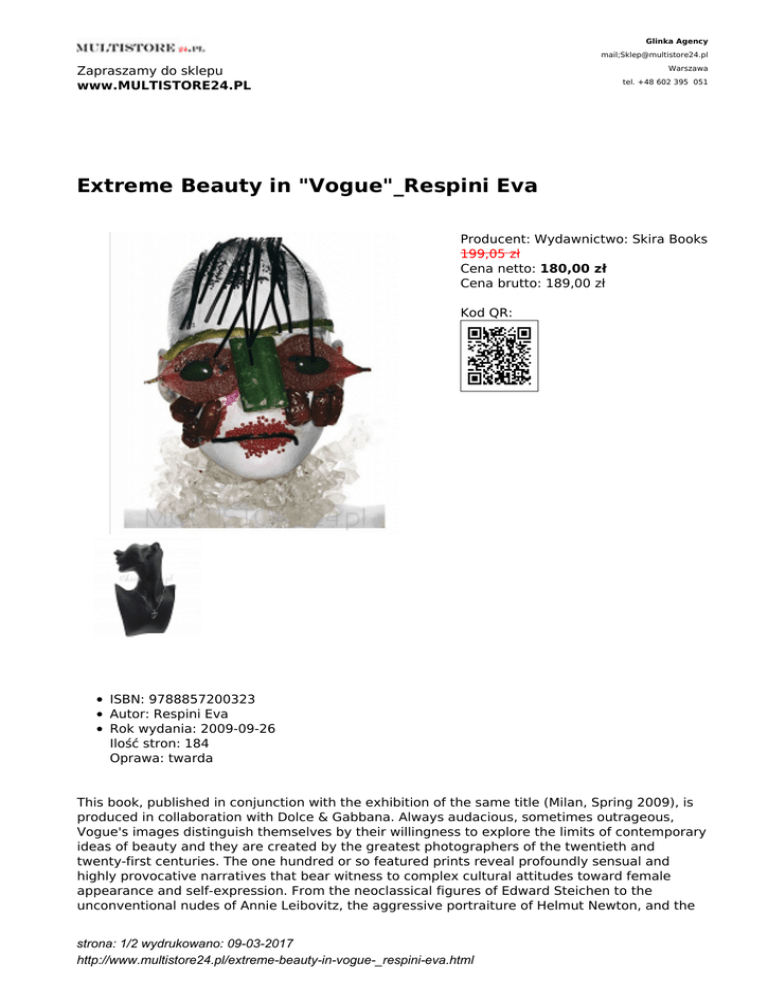 Glinka Agency mail;[email protected] Zapraszamy do sklepu www.MULTISTORE24.PL Warszawa tel. +48 602 395 051 Extreme Beauty in "Vogue"_Respini Eva Producent: Wydawnictwo: Skira Books 199,05 zł Cena netto: 180,00 zł Cena brutto: 189,00 zł Kod QR: ISBN: 9788857200323 Autor: Respini Eva Rok wydania: 2009-09-26 Ilość stron: 184 Oprawa: twarda This book, published in conjunction with the exhibition of the same title (Milan, Spring 2009), is produced in collaboration with Dolce & Gabbana. Always audacious, sometimes outrageous, Vogue's images distinguish themselves by their willingness to explore the limits of contemporary ideas of beauty and they are created by the greatest photographers of the twentieth and twenty-first centuries. The one hundred or so featured prints reveal profoundly sensual and highly provocative narratives that bear witness to complex cultural attitudes toward female appearance and self-expression. From the neoclassical figures of Edward Steichen to the unconventional nudes of Annie Leibovitz, the aggressive portraiture of Helmut Newton, and the strona: 1/2 wydrukowano: 09-03-2017 http://www.multistore24.pl/extreme-beauty-in-vogue-_respini-eva.html modernism of Steven Klein, the photographs in this volume consider the evolving female subject, in all her strength and contradiction. An entire section is devoted to Irving Penn, who transforms the face and body into images of extraordinary imaginative and aesthetic power. strona: 2/2 wydrukowano: 09-03-2017 http://www.multistore24.pl/extreme-beauty-in-vogue-_respini-eva.html