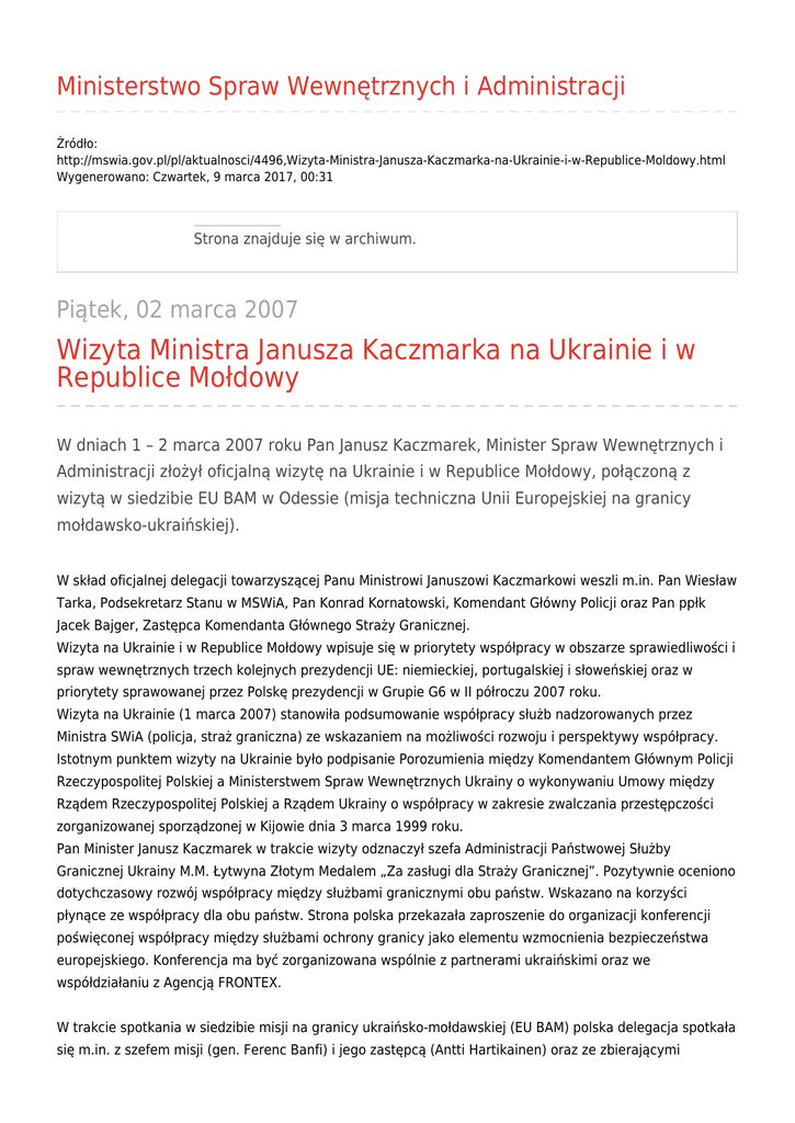 Ministerstwo Spraw Wewnętrznych i Administracji Źródło: http://mswia.gov.pl/pl/aktualnosci/4496,Wizyta-Ministra-Janusza-Kaczmarka-na-Ukrainie-i-w-Republice-Moldowy.html Wygenerowano: Czwartek, 9 marca 2017, 00:31 Strona znajduje się w archiwum. Piątek, 02 marca 2007 Wizyta Ministra Janusza Kaczmarka na Ukrainie i w Republice Mołdowy W dniach 1 – 2 marca 2007 roku Pan Janusz Kaczmarek, Minister Spraw Wewnętrznych i Administracji złożył oficjalną wizytę na Ukrainie i w Republice Mołdowy, połączoną z wizytą w siedzibie EU BAM w Odessie (misja techniczna Unii Europejskiej na granicy mołdawsko-ukraińskiej). W skład oficjalnej delegacji towarzyszącej Panu Ministrowi Januszowi Kaczmarkowi weszli m.in. Pan Wiesław Tarka, Podsekretarz Stanu w MSWiA, Pan Konrad Kornatowski, Komendant Główny Policji oraz Pan ppłk Jacek Bajger, Zastępca Komendanta Głównego Straży Granicznej. Wizyta na Ukrainie i w Republice Mołdowy wpisuje się w priorytety współpracy w obszarze sprawiedliwości i spraw wewnętrznych trzech kolejnych prezydencji UE: niemieckiej, portugalskiej i słoweńskiej oraz w priorytety sprawowanej przez Polskę prezydencji w Grupie G6 w II półroczu 2007 roku. Wizyta na Ukrainie (1 marca 2007) stanowiła podsumowanie współpracy służb nadzorowanych przez Ministra SWiA (policja, straż graniczna) ze wskazaniem na możliwości rozwoju i perspektywy współpracy. Istotnym punktem wizyty na Ukrainie było podpisanie Porozumienia między Komendantem Głównym Policji Rzeczypospolitej Polskiej a Ministerstwem Spraw Wewnętrznych Ukrainy o wykonywaniu Umowy między Rządem Rzeczypospolitej Polskiej a Rządem Ukrainy o współpracy w zakresie zwalczania przestępczości zorganizowanej sporządzonej w Kijowie dnia 3 marca 1999 roku. Pan Minister Janusz Kaczmarek w trakcie wizyty odznaczył szefa Administracji Państwowej Służby Granicznej Ukrainy M.M. Łytwyna Złotym Medalem „Za zasługi dla Straży Granicznej”. Pozytywnie oceniono dotychczasowy rozwój współpracy między służbami granicznymi obu państw. Wskazano na korzyści płynące ze współpracy dla obu państw. Strona polska przekazała zaproszenie do organizacji konferencji poświęconej współpracy między służbami ochrony granicy jako elementu wzmocnienia bezpieczeństwa europejskiego. Konferencja ma być zorganizowana wspólnie z partnerami ukraińskimi oraz we współdziałaniu z Agencją FRONTEX. W trakcie spotkania w siedzibie misji na granicy ukraińsko-mołdawskiej (EU BAM) polska delegacja spotkała się m.in. z szefem misji (gen. Ferenc Banfi) i jego zastępcą (Antti Hartikainen) oraz ze zbierającymi najwyższe oceny kierownictwa misji, uczestnikami polskiego kontyngentu. Szef misji zaprezentował polskiej delegacji zakres działania misji, wskazał istotniejsze kwestie w jej funkcjonowaniu. Realizacja wizyty Pana Ministra Janusza Kaczmarka w Republice Mołdowy (2 marca 2007) miała na celu wzmocnienie współpracy z tym państwem oraz zapoznanie się ze specyfiką problemów mołdawskich w zakresie obszaru spraw wewnętrznych. Polski Minister Spaw Wewnętrznych i Administracji wraz z całą delegacją został przyjęty przez Premiera Republiki Mołdowy Pana Vasile Tarleva oraz Wicepremiera i Ministra Administracji Publicznej (Pan Vitalie Vrabie). Bardzo intensywny program wizyty obejmował spotkania poświęcone współpracy naszych Państw w zakresie spraw wewnętrznych (spotkania z szefami milicji mołdawskiej, służby granicznej) oraz w zakresie rozwoju sieci informatycznych (stronie polskiej zaprezentowano m.in. mołdawski narodowy system dokumentacji populacji).