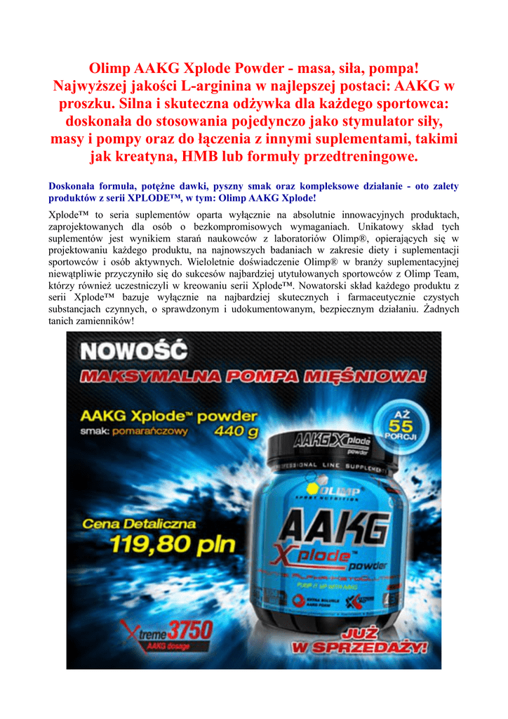 Olimp AAKG Xplode Powder - masa, siła, pompa! Najwyższej jakości L-arginina w najlepszej postaci: AAKG w proszku. Silna i skuteczna odżywka dla każdego sportowca: doskonała do stosowania pojedynczo jako stymulator siły, masy i pompy oraz do łączenia z innymi suplementami, takimi jak kreatyna, HMB lub formuły przedtreningowe. Doskonała formuła, potężne dawki, pyszny smak oraz kompleksowe działanie - oto zalety produktów z serii XPLODE™, w tym: Olimp AAKG Xplode! Xplode™ to seria suplementów oparta wyłącznie na absolutnie innowacyjnych produktach, zaprojektowanych dla osób o bezkompromisowych wymaganiach. Unikatowy skład tych suplementów jest wynikiem starań naukowców z laboratoriów Olimp®, opierających się w projektowaniu każdego produktu, na najnowszych badaniach w zakresie diety i suplementacji sportowców i osób aktywnych. Wieloletnie doświadczenie Olimp® w branży suplementacyjnej niewątpliwie przyczyniło się do sukcesów najbardziej utytułowanych sportowców z Olimp Team, którzy również uczestniczyli w kreowaniu serii Xplode™. Nowatorski skład każdego produktu z serii Xplode™ bazuje wyłącznie na najbardziej skutecznych i farmaceutycznie czystych substancjach czynnych, o sprawdzonym i udokumentowanym, bezpiecznym działaniu. Żadnych tanich zamienników! Xplode™ to seria produktów o bardzo dobrej rozpuszczalności i rewelacyjnych, intensywnie owocowych, aromatycznych smakach, które możesz dowolnie łączyć i komponować według własnego uznania. Wykorzystanie maksymalnej mikronizacji form sypkich jest składową perfekcyjnej przyswajalności substancji aktywnych każdego z produktów tej unikatowej serii. XPLODE™ - tylko maksymalna skuteczność działania. Kolejny, oczekiwany przez wielu element serii XPLODE już jest! AAKG XPLODE Powder® - nieograniczony anabolizm, wytrzymałość i przepotężna pompa mięśniowa! Silna i skuteczna odżywka na masę i siłę mięśni Olimp AAKG Xplode to doskonały preparat sportowy w proszku, który zawiera najwyższej jakości argininę AAKG. Bardzo dobra odżywka marki Olimp wykazuje zdolność rozszerzania naczyń krwionośnych powodując efekt napompowania mięśni i powstawania tlenku azotu. Pozytywnie wpływa na wydzielanie hormonu wzrostu oraz regenerację wątroby. Tania arginina AAKG Xplode to najwyższej jakości alfa ketoglutaran argininy - najlepiej wchłanialnej i najbardziej skuteczniejszej wersji popularnego aminokwasu. AAKG jest o wiele mniej wrażliwe na działanie kwaśnego środowiska układu trawiennego, dzięki temu możemy stosować mniejsze dawki w celu uzyskania podobnego efektu zwykłą odmianą L-Argininy. Czym jest AAKG XPLODE powder®? Najwyższej jakości suplement diety w formie wysoko przyswajalnego alfa-ketoglutaranu argininy (AAKG) uzupełniający dietę w L-argininę. Dzięki takiej postaci odżywka aminokwasowa Olimp AAKG Xplode wykazuje silne i skuteczne działanie. Jak działa AAKG XPLODE powder®? • • • • • • L-arginina: podstawowy substrat w biosyntezie tlenku azotu (NO), który wykazuje szerokie spektrum działania na śródbłonek naczyń krwionośnych, wywołując ich rozszerzenie i w efekcie gwałtownie zwiększa przepływ krwi przez mięśnie poprawia to zaopatrzenie mięśni w tlen i składniki odżywcze, a także nasila przepływ hormonów anabolicznych stymulujących mięśnie do wzrostu i wzmacniających efektywność nawet kilkugodzinnego wysiłku sportowego zwiększa sekrecję hormonu wzrostu i nasila anabolizm białek mięśniowych pośrednio wpływa na wzrost mięśni poprzez zwiększenie siły i wytrzymałości, a przez to objętości treningowej. może pozytywnie wpływać na poprawę życia intymnego i utrzymanie wysokiej sprawności seksualnej u mężczyzn badania pokazują, iż długoterminowe podawanie L-argininy dodatkowo poprawia stan układu krążenia, redukuje ciśnienie tętnicze oraz korzystnie moduluje ogólnoustrojową odporność organizmu Alfa-ketoglutaran (AKG): • cząsteczka wyjściowa do syntezy L-glutaminy i innych aminokwasów • zmniejsza spadki ich stężenia we krwi w trakcie intensywnego wysiłku i pomiędzy posiłkami. AAKG - doskonale sprzężona molekuła. Mega moc działania Olimp AAKG Xplode! Sprzęgnięcie w jedną cząsteczkę alfa-ketoglutaranu i L-argininy gwarantuje wysoką stymulację mięśni w trakcie ćwiczeń, zwiększając efektywność wysiłku oraz osiągnięcie maksymalnej regeneracji tkanki mięśniowej w okresie po treningu. Dodatkową zaletą jest wywoływane uczucie tzw. "pompy mięśniowej", czyli zwiększenia rozmiarów mięśni do granic możliwości, będącej następstwem wzmożonego przepływu krwi. • • • • • • Zalety AAKG Xplode Powder®: potężna dawka L-argininy w formie doskonale przyswajalnego alfa-ketoglutaranu Largininy (blisko 4 g na porcję), ekonomiczność – 1 opakowanie to aż 55 porcji - czyli 2 miesiące treningów błyskawiczna przyswajalność dzięki zastosowaniu proszkowej formy preparatu. Nie występuje opóźnienie typowe dla tabletek czy kapsułek. pełna dowolność w dozowaniu. Nie jesteś już ograniczony sztywnymi dawkami, odmierzasz z dużą dokładnością akurat tyle produktu, ile Ci w danej chwili potrzeba doskonała rozpuszczalność wyjątkowy smak Dawkowanie oraz sposób użycia odżywki aminokwasowej AAKG Xplode marki Olimp: 1 porcję (8 g proszku – 12 jednostek = 1/3 miarki lub 1 płaska łyżka stołowa) rozpuścić w 250 ml wody i pić 1 dziennie przed treningiem lub w celu poprawy jakości funkcji seksualnych - ok. 30 min. przed przewidywanym zbliżeniem płciowym. Spożyć zaraz po przygotowaniu. Opis i charakterystyka preparatu AAKG Xplode: • 1 porcja = 8 gram suplementu AAKG • Ilość porcji w opakowaniu: 55 • Zawartość opakowania: 440 gram odżywki Skład jednej porcji suplementu diety opartego o L-argininę w proszku - Olimp AAKG Xplode: Zawartość opakowania odżywki 1 porcja - 8 g Arginina Alpha-Ket