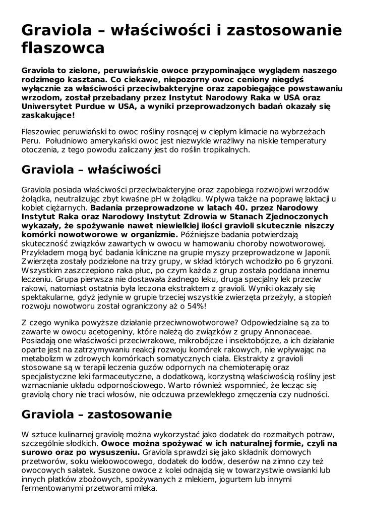 Graviola – właściwości i zastosowanie flaszowca Graviola to zielone, peruwiańskie owoce przypominające wyglądem naszego rodzimego kasztana. Co ciekawe, niepozorny owoc ceniony niegdyś wyłącznie za właściwości przeciwbakteryjne oraz zapobiegające powstawaniu wrzodom, został przebadany przez Instytut Narodowy Raka w USA oraz Uniwersytet Purdue w USA, a wyniki przeprowadzonych badań okazały się zaskakujące! Fleszowiec peruwiański to owoc rośliny rosnącej w ciepłym klimacie na wybrzeżach Peru. Południowo amerykański owoc jest niezwykle wrażliwy na niskie temperatury otoczenia, z tego powodu zaliczany jest do roślin tropikalnych. Graviola – właściwości Graviola posiada właściwości przeciwbakteryjne oraz zapobiega rozwojowi wrzodów żołądka, neutralizując zbyt kwaśne pH w żołądku. Wpływa także na poprawę laktacji u kobiet ciężarnych. Badania przeprowadzone w latach 40. przez Narodowy Instytut Raka oraz Narodowy Instytut Zdrowia w Stanach Zjednoczonych wykazały, że spożywanie nawet niewielkiej ilości gravioli skutecznie niszczy komórki nowotworowe w organizmie. Późniejsze badania potwierdzają skuteczność związków zawartych w owocu w hamowaniu choroby nowotworowej. Przykładem mogą być badania kliniczne na grupie myszy przeprowadzone w Japonii. Zwierzęta zostały podzielone na trzy grupy, w skład których wchodziło po 6 gryzoni. Wszystkim zaszczepiono raka płuc, po czym każda z grup została poddana innemu leczeniu. Grupa pierwsza nie dostawała żadnego leku, druga specjalny lek przeciw rakowi, natomiast ostatnia była leczona ekstraktem z gravioli. Wyniki okazały się spektakularne, gdyż jedynie w grupie trzeciej wszystkie zwierzęta przeżyły, a stopień rozwoju nowotworu został ograniczony aż o 54%! Z czego wynika powyższe działanie przeciwnowotworowe? Odpowiedzialne są za to zawarte w owocu acetogeniny, które należą do związków z grupy Annonaceae. Posiadają one właściwości przeciwrakowe, mikrobójcze i insektobójcze, a ich działanie oparte jest na zatrzymywaniu reakcji rozwoju komórek rakowych, nie wpływając na metabolizm w zdrowych komórkach somatycznych ciała. Ekstrakty z gravioli stosowane są w terapii leczenia guzów odpornych na chemioterapię oraz specjalistyczne leki farmaceutyczne, a dodatkową, korzystną właściwością rośliny jest wzmacnianie układu odpornościowego. Warto również wspomnieć, że lecząc się graviolą chory nie traci włosów, nie odczuwa przewlekłego zmęczenia czy nudności. Graviola – zastosowanie W sztuce kulinarnej graviolę można wykorzystać jako dodatek do rozmaitych potraw, szczególnie słodkich. Owoce można spożywać w ich naturalnej formie, czyli na surowo oraz po wysuszeniu. Graviola sprawdzi się jako składnik domowych przetworów, soku wieloowocowego, dodatek do lodów, deserów na zimno czy też owocowych sałatek. Suszone owoce z kolei odnajdą się w towarzystwie owsianki lub innych płatków zbożowych, spożywanych z mlekiem, jogurtem lub innymi fermentowanymi przetworami mleka. Niepozorny, mały zielony owoc posiada niezwykle cenne właściwości przeciwnowotworowe. W sklepach z ekologiczną żywnością lub w aptekach zielarskich możemy zaopatrzyć się w dostępne soki, suszone owoce lub ekstrakty z owocu gravioli. Korzystny wpływ na organizm możemy zaobserwować już przy niewielkich ilościach spożywaniu przetworów. Kup graviolę z rabatem 3% już teraz ! (wpisz bonavita w polu „kod specjalny” w koszyku) Author: Martyna Jaros Link do artykułu: http://bonavita.pl/graviola-wlasciwosci-i-zastosowanie-flaszowca
