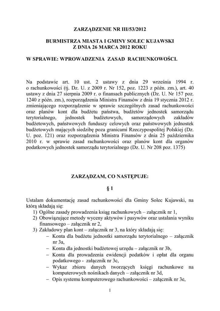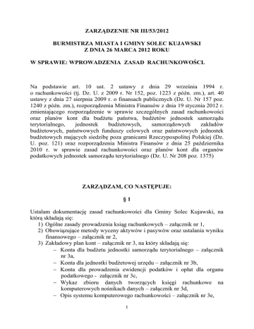 ZARZĄDZENIE NR III/53/2012 BURMISTRZA MIASTA I GMINY SOLEC KUJAWSKI Z DNIA 26 MARCA 2012 ROKU W SPRAWIE: WPROWADZENIA ZASAD RACHUNKOWOŚCI. Na podstawie art. 10 ust. 2 ustawy z dnia 29 września 1994 r. o rachunkowości (tj. Dz. U. z 2009 r. Nr 152, poz. 1223 z późn. zm.), art. 40 ustawy z dnia 27 sierpnia 2009 r. o finansach publicznych (Dz. U. Nr 157 poz. 1240 z późn. zm.), rozporządzenia Ministra Finansów z dnia 19 stycznia 2012 r. zmieniającego rozporządzenie w sprawie szczególnych zasad rachunkowości oraz planów kont dla budżetu państwa, budżetów jednostek samorządu terytorialnego, jednostek budżetowych, samorządowych zakładów budżetowych, państwowych funduszy celowych oraz państwowych jednostek budżetowych mających siedzibę poza granicami Rzeczypospolitej Polskiej (Dz. U. poz. 121) oraz rozporządzenia Ministra Finansów z dnia 25 października 2010 r. w sprawie zasad rachunkowości oraz planów kont dla organów podatkowych jednostek samorządu terytorialnego (Dz. U. Nr 208 poz. 1375) ZARZĄDZAM, CO NASTĘPUJE: §1 Ustalam dokumentację zasad rachunkowości dla Gminy Solec Kujawski, na którą składają się: 1) Ogólne zasady prowadzenia ksiąg rachunkowych – załącznik nr 1, 2) Obowiązujące metody wyceny aktywów i pasywów oraz ustalania wyniku finansowego – załącznik nr 2, 3) Zakładowy plan kont – załącznik nr 3, na który składają się: Konta dla budżetu jednostki samorządu terytorialnego – załącznik nr 3a, Konta dla jednostki budżetowej urzędu – załącznik nr 3b, Konta dla prowadzenia ewidencji podatków i opłat dla organu podatkowego - załącznik nr 3c, Wykaz zbioru danych tworzących księgi rachunkowe na komputerowych nośnikach danych – załącznik nr 3d, Opis systemu komputerowego rachunkowości – załącznik nr 3e, 1 Wykaz obszarów tematycznych wydatków strukturalnych – załącznik nr 3 f. 4) System ochrony danych w jednostce – załącznik nr 4. 5) Zasady rachunkowości zadań finansowanych z wykorzystaniem środków pomocowych realizowanych przez gminę – załącznik nr 5. §2 Wykonanie zarządzenia powierzam Skarbnikowi Miasta i Gminy. §3 Tracą moc zarządzenia: 1. Zarządzenie Nr II/78/2008 Burmistrza Miasta i Gminy Solec Kujawski z dnia 31 października 2008 roku w sprawie zasad rachunkowości zadań finansowanych z wykorzystaniem środków pomocowych w gminie. 2. Zarządzenie Nr III/21/2010 Burmistrza Miasta i Gminy Solec Kujawski z dnia 31 grudnia 2010 roku w sprawie wprowadzenia zasad rachunkowości. §4 Zarządzenie wchodzi w życie z dniem 1 marca 2012 roku. 2 Załącznik nr 1 - Ogólne zasady prowadzenia ksiąg rachunkowych. 1. Miejsce prowadzenia ksiąg rachunkowych. Księgi rachunkowe w Urzędzie Miasta i Gminy w Solcu Kujawskim prowadzone są w siedzibie w Urzędzie Miasta i Gminy w Solcu Kujawskim ul. 23 Stycznia 7, 86-050 Solec Kujawski. 2. Określenie roku obrotowego oraz okresów sprawozdawczych. 1) Rokiem obrotowym jest okres roku budżetowego, czyli rok kalendarzowy od 1 stycznia do 31 grudnia. 2) Sprawozdania budżetowe sporządza na podstawie przepisów rozporządzenia Ministra Finansów z dnia 3 lutego 2010 r. w sprawie sprawozdawczości budżetowej (Dz. U. Nr 20, poz. 103) w następujących terminach: Za okresy miesięczne sporządza się sprawozdania: Rb-27S i Rb-28S. Za okresy kwartalne sporządza się sprawozdania: Rb-50, Rb-NDS, Rb-27ZZ. Za okresy kwartalne (za 4 kwartały): Rb-NDS, Rb-27ZZ, Rb-50 Za okresy półroczne: Rb-30S, Rb-34S Za rok składa się sprawozdania: Rb-27S, Rb-28S, Rb-30S, Rb-34S, Rb-50, Rb-PDP, Rb-ST, Rb-WSa. Sprawozdania finansowe sporządza się na podstawie rozporządzenia Ministra Finansów z dnia 4 marca 2010 r. w sprawie sprawozdań jednostek sektora finansów publicznych w zakresie operacji finansowych (Dz. U. Nr 43, poz. 247) sporządza się w następujących terminach: Za okresy kwartalne sporządza się sprawozdania: Rb-N, Rb-Z, Rb-ZN, Za rok składa się sprawozdania: Rb-UN, Rb-UZ. Na podstawie rozporządzenia Ministra Finansów z dnia 19 stycznia 2012 r. zmieniające rozporządzenie w sprawie szczególnych zasad rachunkowości oraz planów kont dla budżetu państwa, budżetów jednostek samorządu terytorialnego, jednostek budżetowych, samorządowych zakładów budżetowych, państwowych funduszy celowych oraz państwowych jednostek budżetowych mających siedzibę poza granicami Rzeczypospolitej Polskiej (Dz. U. poz. 121) sporządza się roczne sprawozdania finansowe obejmujące: bilans jednostki budżetowej, rachunek zysków i strat (wariant porównawczy), zestawienie zmian w funduszu jednostki. 3) W jednostce samorządu terytorialnego sporządza się: łączne sprawozdania budżetowe: Rb-27S, Rb-28S, Rb-30S, Rb-34S, Rb-50, Rb-N, Rb- Z, Rb-NDS, Rb-WSa, Rb-UZ, Rb-UN, Rb-ST, Rb-ZN, Rb-27ZZ. bilans z wykonania budżetu, 3 łączny bilans jednostek budżetowych obejmujący bilans urzędu jako jednostki budżetowej i bilanse jednostkowe jednostek budżetowych, łączny bilans zakładów budżetowych sporządzany na podstawie jednostkowych bilansów zakładów budżetowych, łączny rachunek zysków i strat jednostek budżetowych obejmujący rachunek zysków i strat urzędu jako jednostki budżetowej i jednostkowe rachunki zysków i strat jednostek budżetowych, łączny rachunek zysków i strat zakładów budżetowych sporządzany na podstawie jednostkowych rachunków zysków i strat zakładów budżetowych, łączne zestawienie zmian w funduszu jednostki budżetowej obejmujące zestawienie zmian w funduszu urzędu jako jednostki budżetowej i jednostkowe zestawienia zmian w funduszach poszczególnych jednostek budżetowych, łączne zestawienie zmian w funduszu zakładów budżetowych sporządzane na podstawie jednostkowych zestawień zmian w funduszach zakładów budżetowych, skonsolidowany bilans. 4) Ostateczne zamknięcie i otwarcie ksiąg rachunkowych jednostki i placówki kontynuującej działalność powinno nastąpić do dnia 30 kwie