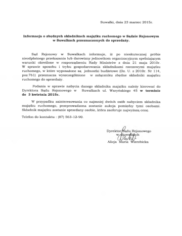 Suwałki, dnia 23 marzec 2015r. Informacja o zbędnych składnikach majątku ruchomego w Sądzie Rejonowym w Suwałkach przeznaczonych do sprzedaży. Sąd Rejonowy w Suwałkach informuje, iż po nieskutecznej próbie nieodpłatnego przekazania lub darowizny jednostkom organizacyjnym spełniającym warunki określone w rozporządzeniu Rady Ministrów z dnia 21 maja 2010r. W sprawie sposobu i trybu gospodarowania składnikami rzeczowymi majątku ruchomego, w które wyposażone są jednostki budżetowe (Dz. U. z 2010r. Nr 114, poz.761) przeznacza wyszczególnione w załączniku zbędne składniki majątku ruchomego do sprzedaży. Podania w sprawie nabycia danego składnika majątku należy kierować do Dyrektora Sądu Rejonowego w Suwałkach ul. Waryńskiego 45 w terminie do 3 kwietnia 2015r. W przypadku zainteresowania co najmniej dwóch osób nabyciem składnika majątku ruchomego, przeprowadzona zostanie aukcja pomiędzy tymi osobami. Składnik majątku zostanie sprzedany osobie, która zaoferuje najwyższą cenę. Telefon do kontaktu : (87) 563-12-90. Dyrek nowego Alicja Maria Wierzbicka Załącznik do protokołu oceny przydatności z dnia 13 marca 2015r. Nr NAZWA ŚRODKA TRWAŁEGO Data zakupi KOD Nr inwent. Stan techniczny Wycena 5 zł 1 Biurko 2004.05.31 0100100106240 1-8-1-808-55 pęknięta płyta 2 Biurko 2004.05.31 0100100109440 1-8-1-808-74 odklejona okleina 5 zł. 3 Biurko 2004.05.31 0100100110650 1-8-1-808-82 zbędne 20 zł 4 Biurko 2004.05.31 0100100110780 1-8-1-808-83 zbędne 20 zł 5 Biurko 2004.05.31 0100100110790 1-8-1-808-84 zbędne 20 zł 6 Biurko 2004.05.31 0100100111020 1-8-1-808-86 zbędne 7 20 zł. Biurko 2004.05.31 0100100124830 1-8-1-808-134 zbędne 20 zł 8 Krzesło 2004.05.31 0100101101050 1-8-11-808-23 porwana tapicerka 20 zł 9 Krzesło 2004.05.31 0100101101070 1-8-11-808-24 porwana tapicerka 5 zł. 10 Krzesło 2004.05.31 0100101101380 1-8-11-808-25 porwana tapicerka 5 zł. 11 Krzesło 2004.05.31 0100101101390 1-8-11-808-26 porwana tapicerka 8 zł. 12 Krzesło 2004.05.31 0100101102520 1-8-11-808-45 porwana tapicerka 9 zł. 13 Krzesło 2004.05.31 0100101102530 1-8-11-808-46 porwana tapicerka 10 zł. 14 Kzesło 2004 05.31 0100101102540 1-8-11-808-47 porwana tapicerka 10 zł. 15 Krzesło 2004.05.31 0100101103540 1-8-11-808-58 porwana tapicerka 10 zł. 16 krzesło 2004.05.31 0100101103560 1-8-11-808-59 porwana tapicerka 10 zł. 17 Krzesło 2004.05.31 0100101105300 1-8-11-808-74 porwana tapicerka 10 zł. 18 krzesło 2004.05.31 0100101105350 1-8-11-808-77 porwana tapicerka 10 zł. 19 Krzesło Bis 2004.05.31 0100101106860 1-8-11-808-93 porwana tapicerka 10 zł. 20 Krzesło Bis 2004.05.31 0100101107000 1-8-11-808-97 porwana tapicerka 10 zł. 21 Krzesło obrotowe REMAB 2004.05.31 0100101122710 1-8-11-808-201 uszkodzony układ pneumatyczny 10 zł. 22 Krzesło obrotowe nowe 2004.05.31 0100101124750 1-8-11-808-240 uszkodzony układ pneumatyczny 10 zł. 10 zł. 23 Krzesło Perfect GTP C-4 2006.11.23 0100101135840 1-8-11-808-280 uszkodzony układ pneumatyczny 24 Krzesło Perfect GTP C-4 2006.11.23 0100101135940 1-8-11-808-290 uszkodzony układ pneumatyczny 10 zł. 25 Krzesło Perfect GTP C-4 2006.11.23 0100101135960 1-8-11-808-292 uszkodzony układ pneumatyczny 10 zł. 10 zł. 26 Krzesło Perfect GTP C-4 2006.11.23 0100101135970 1-8-11-808-293 uszkodzony układ pneumatyczny 27 Krzesło ISO BLACK CU-4 2006.12.08 0100101136070 1-8-11-808-303 uszkodzony układ pneumatyczny 10 zł. 28 Krzesło obrotowe XL PRO 2013.12.31 0100101162870 1-8-11-808-382 uszkodzony układ pneumatyczny 10 zł. 29 Stolik 2004.05.31 0100100201370 1-8-2-808-5 pęknięta płyta 5 zł. 30 Stolik okolicznościowy 2004.05.31 0100100202010 1-8-2-808-6 zbędny 31 Stolik 10 zł. 2004 05.31 0100100207510 1-8-2-808-39 zbędny 10 zł. 32 Stół - ława 2004.05.31 0100100212120 I-8-2-S08-79 zbędny 10 zł. 33 Stolik 2004.05.31 0100100225480 1-8-2-808-121 połamany 5 zł. Stolik pod komputer Stolik pod komputer 0100100302790 1-8-3-808-8 zbędny 10 zł. 0100100306930 1-8-3-808-10 zbędny 10 zł. 10 zł. 36 Stolik pod komputer 0100100311490 1-8-3-808-19 zbędny 37 Stolik pod maszynę 0100100323010 1-8-3-808-31 zbędny 10 zł. połamana płyta 5 zł. 0100100400960 Przystawka Kontener 45 Szafa ZW-05 »fka gospodarcza Szafa aktowa 49 Szafka gospodarcza 50 Szafka 52 Szafa aktowa TT 54 55 Szafka gospodarcza 56 Szafa aktowa 57 63 65 Szafa aktowa Szafa ~66 Szafka gospodarcza Szafa ubraniowa 71 TT Szafa aktowa Szafa Ubraniowa 2004.05.31 2004 05.31 1-8-4-808-6 0100100401290 ł-8-4-808-7 pęknięta płyta 5 zł. 0100100402030 I-8-4-808-9 pęknięta płyta 5 zł. 0100100402550 1-8-4-808-14 zbędny 10 zł. 0100100402900 I-8-4-808-20 pęknięta płyta 5 zł. 0100100500940 I-8-5-808-4 połamany 5 zł. 0100100502350 1-8-5-808-10 połamany 5 zł. 0100100700470 I-8-7-808-3 zbędna 30 zł. 0100100700780 1-8-7-808-6 zbędna 30 zł. 0100100700860 1-8-7-808-13 zbędna 30 zł. 0100100700880 1-8-7-808-15 zbędna 30 zł. 0100100700990 I-8-7-808-20 zbędna 30 zł. 0100100701410 I-8-7-808-23 zbędna 30 zł. "0100100701810 I-8-7-808-26 zbędna 30 zł. 0100100701850 ł-8-7-808-28 zbędna 30 zł. 0100100701870 I-8-7-808-29 zbędna 30 zł. 0100100702040 1-8-7-808-31 zbędna 30 zł. 0100100702050 I-8-7-808-32 zbędna 30 zł 0100100702920 I-8-7-808-44 zbędna 30 zł. 0100100702930 I-8-7-808-45 zbędna 30 zł. 0100100702940 I-8-7-808-46 zbędna 30 zł. 0100100702950 I-8-7-808-47 zbędna 30 zł. 0100100702960 1-8-7-808-48 zbędna 30 zł. 30 zł. 0100100702980 I-8-7-808-50 zbędna 0100100702990 1-8-7-808-51 zbędna 30 zł. 0100100705120 I-8-7-808-88 zbędna 30 zł. 0100100705140 I-8-7-808-90 zbędna 30 zł. 0100100705190 I-8-7-808-93 zbędna 30 zł. 0100100705600 I-8-7-808-98 zbędna 30 zł. 0100100708170 1-8-7-808-144 zbędna 30 zł. 0100100710740 1-8-7-808-183 zbędna 30 zł. 0100100710760 1-8-7-808-185 zbędna 30 zł. 0100100710770 1-8-7-808-186 zbędna 30 zł. 0100100710900 1-8-7-808-187 zbędna 30 zł. 0100100710910 1-8-7-808-188 zbędna 30 zł. 73 