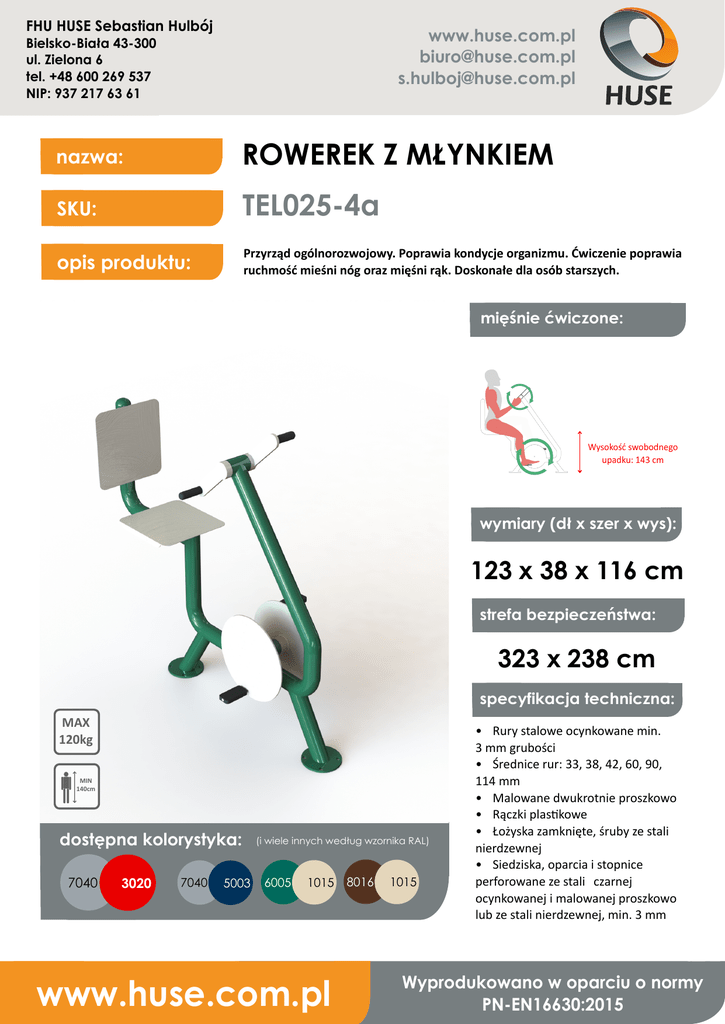 FHU HUSE Sebastian Hulbój www.huse.com.pl [email protected] [email protected] Bielsko-Biała 43-300 ul. Zielona 6 tel. +48 600 269 537 NIP: 937 217 63 61 nazwa: ROWEREK Z MŁYNKIEM SKU: TEL025-4a opis produktu: Przyrząd ogólnorozwojowy. Poprawia kondycje organizmu. Ćwiczenie poprawia ruchmość mieśni nóg oraz mięśni rąk. Doskonałe dla osób starszych. mięśnie ćwiczone: Wysokość swobodnego upadku: 143 cm wymiary (dł x szer x wys): 123 x 38 x 116 cm strefa bezpieczeństwa: 323 x 238 cm specyfikacja techniczna: MAX 120kg MIN 140cm dostępna kolorystyka: 7040 3020 7040 5003 (i wiele innych według wzornika RAL) 6005 1015 www.huse.com.pl 8016 1015 • Rury stalowe ocynkowane min. 3 mm grubości • Średnice rur: 33, 38, 42, 60, 90, 114 mm • Malowane dwukrotnie proszkowo • Rączki plas�kowe • Łożyska zamknięte, śruby ze stali nierdzewnej • Siedziska, oparcia i stopnice perforowane ze stali czarnej ocynkowanej i malowanej proszkowo lub ze stali nierdzewnej, min. 3 mm Wyprodukowano w oparciu o normy PN-EN16630:2015