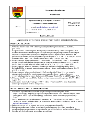 Starostwo Powiatowe w Rawiczu Wydział Geodezji, Kartografii, Katastru i Gospodarki Nieruchomościami GN – 3 e-mail: [email protected] ZAŁĄCZNIKI: wniosek GN-3/1 tel. 65 546 51 15, 65 546 51 17, 65 546 51 18 tel./fax 65 546 51 16 KARTA USŁUGI Uzgodnienie usytuowania projektowanych sieci uzbrojenia terenu. PODSTAWA PRAWNA: 1. Ustawa z dnia 17 maja 1989 r. Prawo geodezyjne i kartograficzne (Dz.U. z 2016 r., poz. 1629). 2. Rozporządzenie Ministra Spraw Wewnętrznych i Administracji z dnia 9 listopada 2011 r. w sprawie standardów technicznych wykonywania geodezyjnych pomiarów sytuacyjnych i wysokościowych oraz opracowywania i przekazywania wyników tych pomiarów do państwowego zasobu geodezyjnego i kartograficznego (Dz. U. Z 2011 r., nr 263, poz. 1572). 3. Ustawa z dnia 7 lipca 1994 r. Prawo budowlane (Dz.U. z 2016 r., poz. 290). 4. Rozporządzenie Ministra Gospodarki Przestrzennej i Budownictwa z dnia 21 lutego 1995 roku w sprawie rodzaju i zakresu opracowań geodezyjno-kartograficznych oraz czynności geodezyjnych obowiązujących w budownictwie (Dz. U. z 1995 r., nr 25, poz. 133). 5. Rozporządzenie Ministra Transportu, Budownictwa i Gospodarki Morskiej z dnia 25 kwietnia 2012 r. w sprawie szczegółowego zakresu i formy projektu budowlanego (Dz. U. z 2012 r., nr 462) 6. Rozporządzenie Ministra Administracji i Cyfryzacji z dnia 9 lipca 2014 r. w sprawie udostępniania materiałów państwowego zasobu geodezyjnego i kartograficznego, wydawania licencji oraz wzoru Dokumentu Obliczenia Opłaty.(Dz. U. z 2014 r., poz. 917). 7. Ustawa z dnia 14 czerwca 1960 r. Kodeks postępowania administracyjnego (Dz. U. z 2016 r., poz. 23). 8. Zarządzenie Starosty Rawickiego Nr 45/14 z dnia 19 sierpnia 2014 r. oraz Regulamin stanowiący załącznik nr 1 do zarządzenia. WYKAZ POTRZEBNYCH DOKUMENTÓW: 1. Wniosek o uzgodnienie usytuowania projektowanych sieci uzbrojenia terenu. 2. Projekt zawierający propozycję usytuowania projektowanych sieci zamieszczoną na planie sytuacyjnym lub na kopii aktualnej mapy zasadniczej (mapa do celów projektowych) – 2 egz. 3. Wykaz współrzędnych projektowanych obiektów X i Y (układ geodezyjny 2000/18) wraz z kodami w postaci wydruku dołączyć do wniosku oraz w pliku tekstowym przesłać na pocztę: [email protected]. 4. Pełnomocnictwo, gdy w imieniu inwestora występuje przedstawiciel. 5. Dodatkowe dokumenty będące w posiadaniu wnioskodawcy: decyzja o warunkach zabudowy i zagospodarowania terenu, aktualne warunki techniczne podłączenia obiektu do istniejących sieci uzbrojenia terenu, inne uzgodnienia. WYSOKOŚĆ OPŁAT: Lp. 1. Nazwa materiału zasobu Uzgodnienie usytuowania projektowanej sieci uzbrojenia terenu Jednostka rozliczeniowa Stawka podstawowa Projektowana sieć uzbrojenia terenu jednego rodzaju 150,0 zł Współczynniki korygujące LR,PD,AJ 1. LR przyjmuje wartość: 1) 1,0 – do Ljr nie większej niż 1 (przedmiotem uzgodnienia jest jeden rodzaj projektowanej sieci uzbrojenia terenu), 2) 0,7 – do Ljr większej niż 1 (przedmiotem uzgodnienia jest więcej niż jeden rodzaj projektowanej sieci uzbrojenia terenu). 2. PD przyjmuje wartość: 1) 1,0 – w przypadku, gdy przedmiotem wniosku o uzgodnienie są sieci uzbrojenia terenu nie będące przyłączami, 2) 0,7 – w przypadku, gdy przedmiotem wniosku o uzgodnienie są przyłącza. 3. AJ przyjmuje wartość 1,0. UWAGA! Zgodnie z art. 40d ust. 3 ustawy Prawo geodezyjne i kartograficzne opłatę pobiera się przed udostępnieniem materiałów zasobu lub przed wykonaniem czynności, o których mowa w art. 40b ust. 1. DOKŁADNE OKREŚLENIE MIEJSCA WYKONANIA USŁUGI: Starostwo Powiatowe w Rawiczu Wydział Geodezji, Kartografii, Katastru i Gospodarki Nieruchomościami Powiatowy Ośrodek Dokumentacji Geodezyjnej i Kartograficznej 63-900 Rawicz, Rynek 17, pokój nr 3 (parter) tel., 65 546 51 18 godziny pracy PODGiK: poniedziałek: 800-1600, wtorek- piątek: 700-1500 e-mail: [email protected] OKREŚLENIE CZASU REALIZACJI: wnioski załatwia się w terminie 14 dni, a wymagające postępowania wyjaśniającego nie później niż w ciągu 1 miesiąca; INFORMACJA O TRYBIE ODWOŁAWCZYM: nie dotyczy UWAGI: Warunkiem przedstawienia wniosku na naradzie koordynacyjnej jest wniesienie opłaty za uzgodnienie i dostarczenie dowodu wpłaty/przelewu. Wnioski przyjmowane są zgodnie z terminarzem narad koordynacyjnych dostępnym na tablicy ogłoszeń w Starostwie Powiatowym. Na tablicy ogłoszeń znajduje się informacja z wykazem spraw będących przedmiotem najbliższej narady.