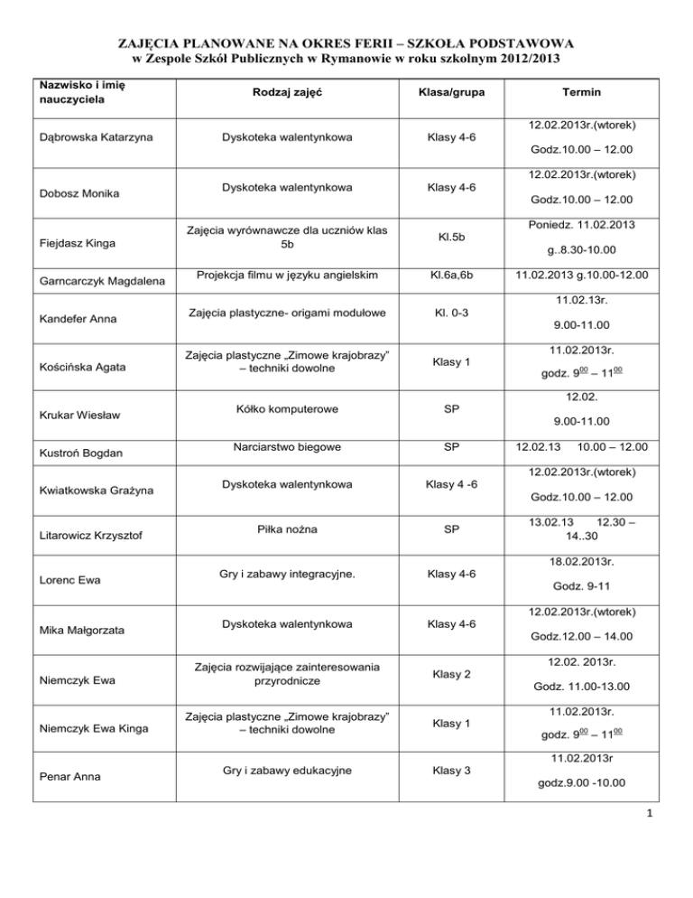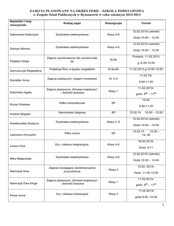 ZAJĘCIA PLANOWANE NA OKRES FERII – SZKOŁA PODSTAWOWA w Zespole Szkół Publicznych w Rymanowie w roku szkolnym 2012/2013 Nazwisko i imię nauczyciela Rodzaj zajęć Klasa/grupa Dyskoteka walentynkowa Klasy 4-6 Termin 12.02.2013r.(wtorek) Dąbrowska Katarzyna Godz.10.00 – 12.00 12.02.2013r.(wtorek) Dobosz Monika Fiejdasz Kinga Garncarczyk Magdalena Dyskoteka walentynkowa Klasy 4-6 Godz.10.00 – 12.00 Poniedz. 11.02.2013 Zajęcia wyrównawcze dla uczniów klas 5b Kl.5b Projekcja filmu w języku angielskim Kl.6a,6b Zajęcia plastyczne- origami modułowe Kl. 0-3 g..8.30-10.00 11.02.2013 g.10.00-12.00 11.02.13r. Kandefer Anna Kościńska Agata 9.00-11.00 Zajęcia plastyczne „Zimowe krajobrazy” – techniki dowolne Klasy 1 Kółko komputerowe SP 11.02.2013r. godz. 9 00 00 – 11 12.02. Krukar Wiesław Kustroń Bogdan 9.00-11.00 Narciarstwo biegowe SP Dyskoteka walentynkowa Klasy 4 -6 12.02.13 10.00 – 12.00 12.02.2013r.(wtorek) Kwiatkowska Grażyna Litarowicz Krzysztof Godz.10.00 – 12.00 Piłka nożna SP Gry i zabawy integracyjne. Klasy 4-6 13.02.13 12.30 – 14..30 18.02.2013r. Lorenc Ewa Godz. 9-11 12.02.2013r.(wtorek) Mika Małgorzata Niemczyk Ewa Niemczyk Ewa Kinga Dyskoteka walentynkowa Klasy 4-6 Godz.12.00 – 14.00 12.02. 2013r. Zajęcia rozwijające zainteresowania przyrodnicze Klasy 2 Zajęcia plastyczne „Zimowe krajobrazy” – techniki dowolne Klasy 1 Gry i zabawy edukacyjne Klasy 3 Godz. 11.00-13.00 11.02.2013r. godz. 9 00 00 – 11 11.02.2013r Penar Anna godz.9.00 -10.00 1 Penar Stanisław Radzięciak Barbara Zielony wtorek w zimie- wizyta harcerzy ze szczepu z Krościenka Wyżnego w drużynie im Zawiszy Czarnego. Harcerska , miejska gra terenowa. 12 DH + goście Zajęcia rozwijające zainteresowania przyrodnicze Klasy 2 Zajęcia plastyczne- origami modułowe Kl. 1-3 12.02. -- godz. 10.0014.00 12.02 2013r. Godz. 11.00-13.00 11.02.13r. Serafin Lidia Godz. 9.00-11.00 11.02.13r. Smerecka Małgorzata Szepieniec Kamil Tomkiewicz Marta Ziemiańska Urszula Zajęcia plastyczne- origami modułowe. Kl. 1-3 Godz. 9.00-11.00 Koszykówka 12.02.13 13.00 - 14.00 19.02.13 13.00 - 14.00 SP Godzina z ciekawą książką- baśnie i legendy polskie, scenki dramowe. Klasy 3 SP Zajęcia plastyczne „Zimowe krajobrazy” – techniki dowolne Klasy 1 15,02.13r ( piątek} godz. 10.00– 12.00 11.02.2013r. godz. 9 00 00 – 11 2