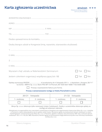 Karta zgłoszenia uczestnictwa envicon Międzynarodowy Kongres Ochrony Środowiska JEDNOSTKA ZGŁASZAJĄCA .................................................................................................................. ADRES ................................................................................................................................................ NIP ............................................................ E-MAIL ........................................................................... TEL. ........................................................... FAX ................................................................................ Osoba upoważniona do kontaktu ................................................................................................. Osoby biorące udział w Kongresie (imię, nazwisko, stanowisko służbowe): 1. ....................................................................................................................................................... E-MAIL .............................................................................................................................................. 2. ....................................................................................................................................................... E-MAIL .............................................................................................................................................. Wyrażam chęć udziału w Niderlandzkim Seminarium Tak Nie Jestem członkiem organizacji współpracującej (str.18) Tak Nie Opłatę wynoszącą RAZEM …………………… zł przekażemy do 4 listopada 2011 r. z dopiskiem „Kongres 26/11” na konto: ABRYS Sp. z o.o. Bank PKO BP I O/Poznań, 69 1020 4027 0000 1102 0336 0286 Proszę o wystawienie faktury pro forma. Proszę o zarezerwowanie noclegu w Hotelu Poznańskim w dniu: 20/21 listopada 1- osobowy 2- osobowy 21/22 listopada 1- osobowy 2- osobowy Abrys Sp. z o.o. dokonuje tylko rezerwacji miejsc hotelowych. Każdy z uczestników dokonuje opłaty za noclegi we własnym zakresie. Oświadczamy, że zapoznaliśmy się z warunkami uczestnictwa w Kongresie oraz organizowania imprez przez Abrys Sp. z o.o. z siedzibą w Poznaniu, a także zobowiązujemy się do zapłaty całości kwoty. Wyrażamy zgodę na przetwarzanie danych osobowych w celach marketingowych i promocyjnych przez Abrys Sp. z o.o. w Poznaniu, zgodnie z Ustawą z dnia 29 sierpnia 1997 roku o ochronie danych osobowych (Dz. U. nr 133, poz. 883). Wyrażamy również zgodę na otrzymywanie drogą elektroniczną ofert oraz informacji handlowych od Abrys Sp. z o.o. 16 Główny księgowy Dyrektor/Prezes envicon Międzynarodowy Kongres Ochrony Środowiska Informacje organizacyjne 1. Termin Kongresu: 21-22 listopada 2011 r. 2. Miejsce Kongresu: Międzynarodowe Targi Poznańskie, pawilon 15 poziom B, Poznań ul. Głogowska 14. 3. Biuro Kongresu czynne będzie od godziny 9:00 w dniu 21.11.2011 r. do zakończenia Kongresu. 4. Opłata za udział w Kongresie wynosi 1190 zł + VAT (1463,70 zł) i obejmuje: komplet materiałów kongresowych i promocyjnych oraz pakiet Wydawnictw Komunalnych, wyżywienie oraz udział w Uroczystej Gali Kongresu, kartę wielokrotnego wstępu na targi POLEKO 2011, katalog wystawców oraz koszty organizacyjne. Dla członków organizacji współpracujących (str.18) koszt udziału jest niższy o 200 zł netto i wynosi 990 zł + VAT (1217,70 zł). UWAGA! Dla osób, które wzięły udział w przynajmniej 3 konferencjach, organizowanych przez Abrys w ramach Cyklu Konferencji związanych z gospodarką odpadami, (wykaz konferencji na stronie www.abrys.pl) – udział w XV Międzynarodowym Kongresie Ochrony Środowiska ENVICON jest bezpłatny. Opłatę prosimy przekazać na konto: ABRYS Sp. z o.o. PKO BP S.A. I O/Poznań 69 1020 4027 0000 1102 0336 0286 z dopiskiem; „Kongres 26/11” do dnia 4 listopada 2011 r. 5. Warunkiem wpisania na listę uczestników jest przesłanie karty zgłoszenia wraz z potwierdzeniem przelewu na numer faksu 61 655 81 01 lub 61 655 81 10. O przyjęciu do udziału w Kongresie ENVICON zostaną Państwo poinformowani e-mailem. 6. Zakwaterowanie. Do Państwa dyspozycji zarezerwowaliśmy miejsca w Hotelu Poznańskim***. Abrys Sp. z o.o. zapewnia tylko rezerwację miejsc hotelowych. Każdy z uczestników dokonuje opłaty za noclegi we własnym zakresie. Doba hotelowa rozpoczyna się o godz. 14.00 w dniu przyjazdu, a kończy o godz. 12.00 w dniu wyjazdu. Ilość miejsc noclegowych jest ograniczona. Przed hotelem znajduje się parking. Hotel Poznański*** ul. Krańcowa 4, 62-030 Luboń k. Poznania, tel. +48 61 649 99 88, www.hotelpoznanski.pl Koszt noclegu • pokój 1-osobowy – 200 PLN/doba ze śniadaniem • pokój 2-osobowy – 230 PLN/doba ze śniadaniem Rezerwacje dokonane po 4 listopada 2011 r. nie gwarantują noclegu w powyższej cenie. Abrys Sp. z o.o. zapewnia przejazdy autobusem z Hotelu Poznańskiego*** na Kongres ENVICON oraz Galę. Prosimy o zaznaczenie na karcie zgłoszenia znakiem X daty noclegu oraz rodzaj pokoju. 7. Anulacji zgłoszenia można dokonać faksem lub mailem do dnia 4 listopada 2011 r. UWAGA: Rezygnacja po tym terminie zobowiązuje do dokonania opłaty za udział w Kongresie ENVICON oraz za zarezerwowane noclegi. Niedokonanie wpłaty nie jest równoznaczne z rezygnacją z udziału. Zamiast zgłoszonej osoby w Kongresie może wziąć udział inny pracownik firmy. 8. Uwaga! W przypadku nieskorzystania z zarezerwowanej usługi hotelowej uczestnik obciążony zostanie przez Abrys Sp. z o.o. ustalonymi przez hotel kosztami rezygnacji z zarezerwowanego noclegu. 9. Organizatorzy zastrzegają sobie prawo do zmian w programie. 10. Organizatorzy nie ponoszą odpowiedzialności za opóźnienia w realizacji, niewykonanie przez nich bądź niewykorzystanie przez uczestników jakiegokolwiek punktu programu imprezy zgodnie z „Warunkami udziału w XV Międzynarodowym K