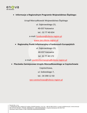 Informacje o Regionalnym Programie Województwa Śląskiego: Urząd Marszałkowski Województwa Śląskiego ul. Dąbrowskiego 23, 40-037 Katowice tel.: 32 77 40 654 e-mail: [email protected] www.rpo.silesia-region.pl Regionalny Punkt Informacyjny o Funduszach Europejskich ul. Dąbrowskiego 23, 40-037 Katowice tel. 32 77 40 172 e-mail: [email protected] Placówka Zamiejscowa Urzędu Marszałkowskiego w Częstochowie Częstochowa, ul. Sobieskiego 7, tel.: 34 390 12 50 [email protected] Budynek Starostwa Powiatowego w Rybniku Rybnik, ul. 3 Maja 31 I piętro, pokój nr 224 tel.: 32 422 22 53 [email protected] Budynek Starostwa Powiatowego w Bielsku-Białej Bielsko-Biała, ul. Piastowska 40 tel.: 33 485 32 80 [email protected] Śląskie Centrum Przedsiębiorczości ul. Katowicka 47, 41–500 Chorzów fax: 32 743 91 61 e-mail: [email protected] www.scp-slask.pl Informacja o Programie Operacyjnym Kapitał Ludzki (PO KL): Regionalny Punkt Informacyjny o Funduszach Europejskich ul. Dąbrowskiego 23, 40-037 Katowice tel.: 32 77 40 172 Urząd Marszałkowski Województwa Śląskiego ul. Dąbrowskiego 23 40-037 Katowice tel.: 32 77 40 125 e-mail: [email protected] www.efs.silesia-region.pl Wojewódzki Urząd Pracy w Katowicach ul. Kościuszki 30, II piętro pok. nr 211 40-048 Katowice tel.: 32 757 33 11 e-mail: [email protected] www.efs.wup-katowice.pl Regionalne Ośrodki Europejskiego Funduszu Społecznego: Regionalny Ośrodek EFS w Bielsku-Białej ul. Cieszyńska 367; 43-382 Bielsko-Biała tel. 33 49 60 201 e-mail: [email protected] www.bielsko-biala.roefs.pl Regionalny Ośrodek EFS w Częstochowie Al. Najświętszej Maryi Panny 24, lok. 1, 42-202 Częstochowa tel. (34) 360 56 87 e-mail: [email protected] www.czestochowa.roefs.pl Regionalny Ośrodek EFS w Katowicach ul. Powstańców 17; 40-039 Katowice tel. 32 72 85 906 e-mail: [email protected] www.katowice.roefs.pl Regionalny Ośrodek EFS w Rybniku ul. Jankowicka 23/25; 44-200 Rybnik tel. 32 756 95 37 e-mail: [email protected] www.rybnik.roefs.pl Krajowy System Usług dla Małych i Średnich Przedsiębiorstw (nadzorowany przez Polską Agencję Rozwoju Przedsiębiorczości) Regionalny Punkt Kontaktowy (EWT): Urząd Marszałkowski Województwa Śląskiego ul. Ligonia 46, 40-037 Katowice Regionalny Punkt Kontaktowy: 1. Bielsko-Biała ul. Piastowska 40, Tel.: +48 (33) 485 32 83 2. Katowice ul. Henryka Dąbrowskiego 23, 40-037 Katowice tel.+48 32 77 40 310 3. Wspólny Sekretariat Techniczny Programu Współpracy Transgranicznej CZ-PL Jeremenkova 40B 779-00 Olomouc Informacje nt. pomocy dla rolnictwa, produkcji rolno-spożywczej, rybołówstwa oraz przetwórstwa ryb (PROW): Agencja Restrukturyzacji i Modernizacji Rolnictwa ul. Sobieskiego 7, 42-200 Częstochowa tel.: 34 378 28 00 www.arimr.gov.pl Urząd Marszałkowski Województwa Śląskiego ul. Dąbrowskiego 23 40-037 Katowice tel.: 32 774 05 02 e-mail: [email protected] Informacje nt. Programu Infrastruktura i Środowisko ( wyłącznie I i II oś priorytetowej): Wojewódzki Fundusz Ochrony Środowiska i Gospodarki Wodnej w Katowicach tel.: 32 60 32 313 fax: 032 251 04 06 e-mail: [email protected] [email protected] Informacje nt. Programu Innowacyjna Gospodarka: Górnośląska Agencja Rozwoju Regionalnego S.A. ul. Powstańców 17, 40-039 Katowice tel.: 32 72 85 905, 72 85 918, 72 85 907 email: [email protected] Punkt Informacyjny o Funduszach Europejskich przy Polskiej Agencji Informacji i Inwestycji Zagranicznych S.A. e-mail: [email protected] www.paiz.gov.pl/fundusze www.paiz.gov.pl/pife Krajowa Sieć Obszarów Wiejskich (koordynowana przez Ministerstwo Rolnictwa i Rozwoju Wsi w ramach Programu Rozwoju Obszarów Wiejskich PROW) www.minrol.gov.pl Regionalne Centra Informacji Europejskiej (sieć koordynowana przez UKIE) http://ksow.pl/ Sieć Enterprise Europe Network (powstała na bazie EuroInfo Centre i Innovation Relay Centres, nadzorowana przez Polską Agencję Rozwoju Przedsiębiorczości) http://een.org.pl