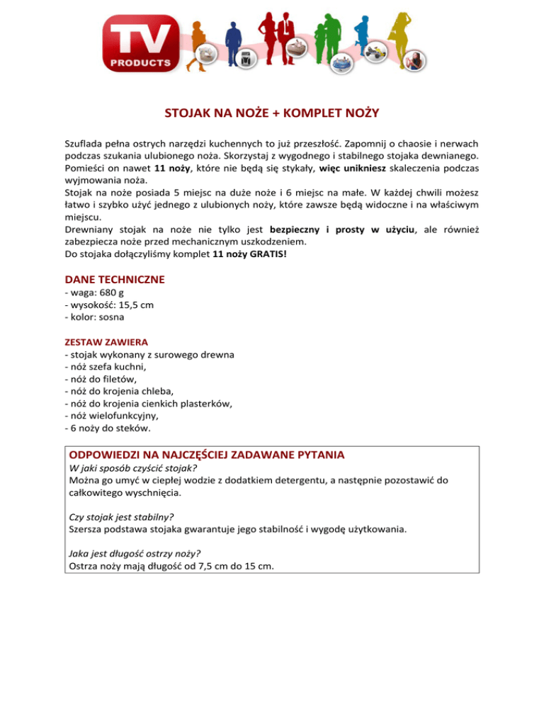 STOJAK NA NOŻE + KOMPLET NOŻY Szuflada pełna ostrych narzędzi kuchennych to już przeszłość. Zapomnij o chaosie i nerwach podczas szukania ulubionego noża. Skorzystaj z wygodnego i stabilnego stojaka dewnianego. Pomieści on nawet 11 noży, które nie będą się stykały, więc unikniesz skaleczenia podczas wyjmowania noża. Stojak na noże posiada 5 miejsc na duże noże i 6 miejsc na małe. W każdej chwili możesz łatwo i szybko użyć jednego z ulubionych noży, które zawsze będą widoczne i na właściwym miejscu. Drewniany stojak na noże nie tylko jest bezpieczny i prosty w użyciu, ale również zabezpiecza noże przed mechanicznym uszkodzeniem. Do stojaka dołączyliśmy komplet 11 noży GRATIS! DANE TECHNICZNE - waga: 680 g - wysokość: 15,5 cm - kolor: sosna ZESTAW ZAWIERA - stojak wykonany z surowego drewna - nóż szefa kuchni, - nóż do filetów, - nóż do krojenia chleba, - nóż do krojenia cienkich plasterków, - nóż wielofunkcyjny, - 6 noży do steków. ODPOWIEDZI NA NAJCZĘŚCIEJ ZADAWANE PYTANIA W jaki sposób czyścić stojak? Można go umyć w ciepłej wodzie z dodatkiem detergentu, a następnie pozostawić do całkowitego wyschnięcia. Czy stojak jest stabilny? Szersza podstawa stojaka gwarantuje jego stabilność i wygodę użytkowania. Jaka jest długość ostrzy noży? Ostrza noży mają długość od 7,5 cm do 15 cm.