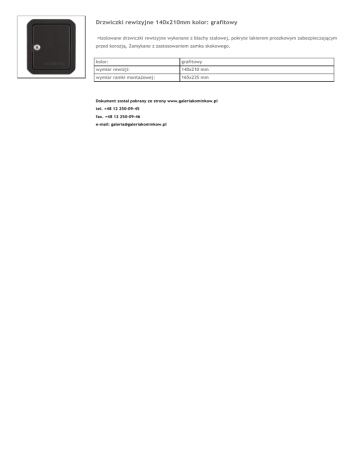 Drzwiczki rewizyjne 140x210mm kolor: grafitowy Izolowane drzwiczki rewizyjne wykonane z blachy stalowej, pokryte lakierem proszkowym zabezpieczającym przed korozją. Zamykane z zastosowaniem zamka skokowego. kolor: grafitowy wymiar rewizji: 140x210 mm wymiar ramki montażowej: 165x235 mm Dokument został pobrany ze strony www.galeriakominkow.pl tel. +48 12 250-09-45 fax. +48 12 250-09-46 e-mail: [email protected]