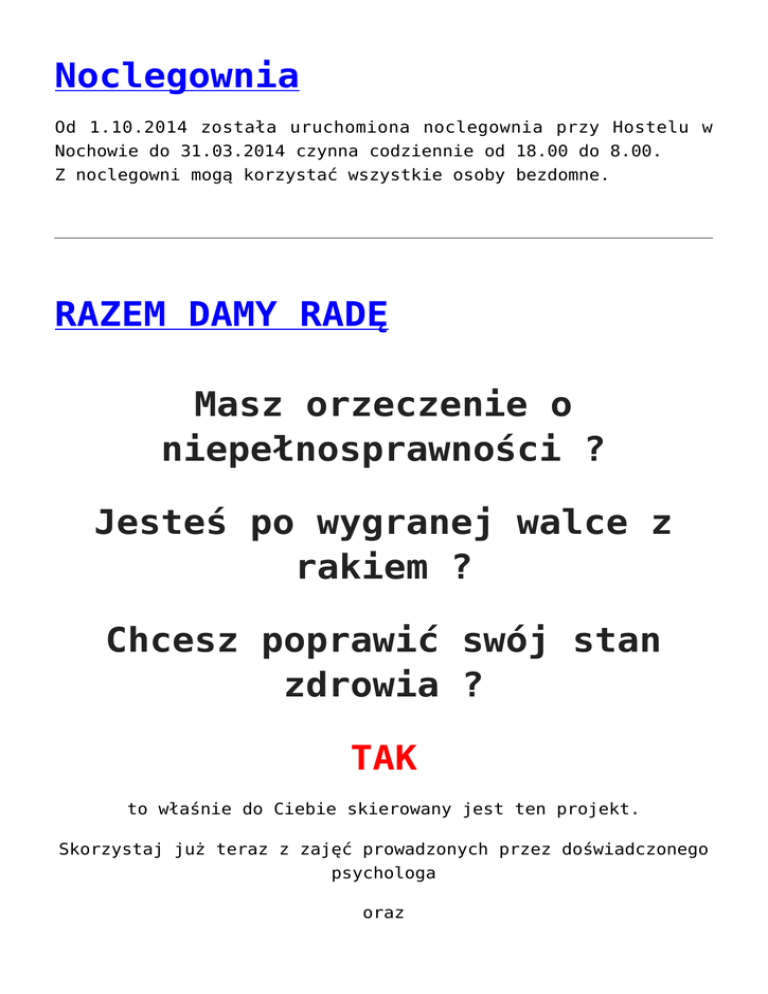 Noclegownia Od 1.10.2014 została uruchomiona noclegownia przy Hostelu w Nochowie do 31.03.2014 czynna codziennie od 18.00 do 8.00. Z noclegowni mogą korzystać wszystkie osoby bezdomne. RAZEM DAMY RADĘ Masz orzeczenie o niepełnosprawności ? Jesteś po wygranej walce z rakiem ? Chcesz poprawić swój stan zdrowia ? TAK to właśnie do Ciebie skierowany jest ten projekt. Skorzystaj już teraz z zajęć prowadzonych przez doświadczonego psychologa oraz profesjonalną rehabilitantkę. Zadzwoń i zapisz się już dziś . Decyduje kolejność zgłoszeń Tel. 61 28 30 798 Tel. 881 201 435 „Sprawni razem” „Sprawni razem” to kolejny projekt skierowany do osób niepełnosprawnych. W ramach realizacji projektu prowadzone są zajęcia indywidualne jak i grupowe mające na celu poprawę stanu zdrowia uczestników. Uczestnicy projektu nie tylko poprawią swój stan zdrowia, ale także swoje samopoczucie poprzez rehabilitację w rytmie muzyki zespołu ABBA. Projekt realizowany jest od 18.08.14 do 30.11.14, zadanie współfinansowane jest ze środków PERON będących w dyspozycji Samorządu Województwa Wielkopolskiego. BYLIŚMY OBECNI W dniu 26.09.2014 Fundacja uczestniczyła w VII FORUM ORGANIZACJI POZARZĄDOWYCH organizowanym przez Starostwo Powiatowe w Śremie, Fundację reprezentowała Maria Stefaniak. Stoisko wystawiennicze przygotowały Dzieci Koła „ Smoki”. Były to wyroby rękodzielnicze, które po wystawie przekazane zostały Fundacji dr Lucy. Za udział w Forum otrzymaliśmy okazjonalną statuetkę oraz Certyfikat. Transport z Wielkopolskiego Banku Żywności 07 Lipca 2014r. dotarł transport z Wielkopolskiego Banku Żywności Fundacja otrzymała niżej wymienione produkty: Ser twarogowy 1kg Mull Jokurt 1kg Coca Cola 1l 672 kg 307,2 kg 112 szt Ser Almette 1kg Ser Brie 1 kg Ser Camembert 1 kg Fasola Pudliszki 400g Filet śledziowy 1 kg 3,6 kg 3 kg 12,9 kg 100 179,2 szt kg IX Gala Wolontariatu Informujemy również, że IX Gala Wolontariatu Odbędzie się w dniu 05.12.2014 r. Szczegóły dot.organizacji Gali omówione zostały wstępnie na spotkaniu koordynatorów. Obecnie trwają już prace organizacyjne.O szczegółach powiadomimy po wakacjach. Na zorganizowanie Gali otrzymaliśmy wsparcie z Powiatu Śremskiego. z wolontariackim pozdrowieniem Koordynator Lokalnego Centrum Dzień dziecka Z okazji dnia dziecka Zarząd Fundacji ufundował upominki dla każdego dziecka które mieszka w domu przy ul. Dutkiewicza 8a w Śremie. Jako rozrywkę zorganizowaliśmy dzieciom wspólnie z swymi mamami, udział w spotkaniu integracyjnym, organizowane przez Caritas przy kościele Ducha Św. Dzień ten dzieci wspominają miło. Rodzinne świętowanie Członkowie „ KOŁA SMOKI” wraz z rodzicami w sobotę 31.05.2014 obchodzili Międzynarodowy Dzień Rodziny w Świetlicy w Psarskiem. Z tej okazji dzieci zaprezentowały krótki program artystyczny dla swoich mam i ojców. Rodzice natomiast przygotowali” Koszyk piknikowy” ( ciasto, napoje, chleb ze smalcem i ogórkiem). Dzieci wraz z rodzicami rywalizowali w konkurencjach sportowo- rekreacyjnych. Spotkanie zakończone było biesiadowaniem przy ognisku z pieczeniem kiełbasek. Rodzice obdarowani zostali upominkami wykonanymi przez dzieci – mamy otrzymały od swoich pociech piękne kwiatki, a ojcowie serduszka. Z okazji Dnia Dziecka wszystkie dzieci otrzymały słodycze. Dzieci uczęszczające na warsztaty świetlicowe otrzymały podziękowania. Sobotnie spotkanie było gwarne i radosne. Na zakończenie uzgodniono następny termin pikniku rodzinnego „ Święto Pyry”. Do zobaczenia we wrześniu, zapraszamy bardzo serdecznie do wspólnej zabawy w dniu 13.09.2014r o godz. 14. 00 do Świetlicy Socjoterapeutycznej Centrum Edukacji , Sportu i Kultury „ ISKRA” w Psarskiem. Zaproszenie Zaproszenie Zapraszamy członków „KOŁA SMOKI” i dzieci ze wsi Psarskie do Świetlicy Socjoterapeutycznej – Centrum Edukacji, Sportu i Kultury ”ISKRA” w Psarskiem w dniu 11.09.2014 o godz. 16 30 na występ artystyczny młodzieży z Gimnazjum nr 1 w Śremie Program przygotowała młodzież z okazji DNIA DZIECKA. Serdecznie zapraszamy , gwarantujemy dobrą zabawę i miłą atmosferę. W imieniu Gimnazjalistów Maria Stefaniak ŚWIAT BAJKOLANDII ŚWIAT BAJKOLANDII 2014 „ WESOŁA DWUDZIESTKA” W środę (28.05) na terenie Domu Pomocy Społecznej w Psarskiem zorganizowano majówkę dla dzieci niepełnosprawnych. Tegoroczna impreza miała szczególny charakter, ponieważ organizowana jest już po raz dwudziesty przez Fundację na Rzecz Rewaloryzacji Miasta Śrem i DPS Psarskie. Głównym sponsorem jest PSS SPOŁEM w Śremie oraz Państwowy Fundusz Rehabilitacji Osób Niepełnosprawnych w dyspozycji Powiatowego Centrum Pomocy Rodzinie w Śremie . W realizację zadania włączyły się dwa szkolne kluby wolontariatu działające przy Zespole Szkół Politechnicznych i Zespole Szkół Ogólnokształcących w Śremie. Z okazji Jubileuszu dzieci złożyły honorowe dyplomy przedstawicielom Pani Marii Stefaniak i Hieronimowi Bartkowiakowi. Pomimo złej pogody dzieci zdążyły zaprezentować imponujący program artystyczny oraz uczestniczyły w 10 konkurencjach sportowych. Dodatkowymi atrakcjami były: pokazy strażaków, policjantów, przejażdżki bryczką, jazda rykszą kącik artystyczny w którym wolontariusze ZSP zorganizowały stoisko wizażu , zrobili wymyślne fryzury i makijaże. Główny sponsor PSS SPOŁEM ufundował uczestnikom nagrody za zajęcie I, II, II miejsca w konkurencjach oraz słodycze z upominkami z okazji Międzynarodowego Dnia Dziecka . Mimo deszczu jak co roku było wiele radości i uśmiechu. Serdecznie dziękujemy naszym darczyńcom za pomoc w zorganizowaniu jubileuszowej majówki Świat Bajkolandii. Dzięki Państwa ogromnego zaangażowania nie zawiedliśmy 170 dzieci niepełnosprawnych, które co roku czekają na wspólną zabawę . Szczególne podziękowanie kierujemy dla Pani Danuty Szafrańskiej – Prezes PSS PSOŁEM w 