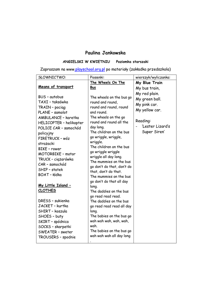 Paulina Jankowska ANGIELSKI W KWIETNIU Poziomka starszaki Zapraszam na www.playschool.org.pl po materiały (zakładka przedszkola) SŁOWNICTWO: Means of transport BUS – autobus TAXI – taksówka TRAIN – pociąg PLANE – samolot AMBULANCE – karetka HELICOPTER – helikopter POLICE CAR – samochód policyjny FIRETRUCK – wóz strażacki BIKE – rower MOTORBIKE – motor TRUCK – ciężarówka CAR – samochód SHIP – statek BOAT – łódka My Little Island – CLOTHES DRESS – sukienka JACKET – kurtka SHIRT – koszula SHOES – buty SKIRT – spódnica SOCKS – skarpetki SWEATER – sweter TROUSERS – spodnie Piosenki: The Wheels On The Bus wierszyk/wyliczanka: My Blue Train My bus train, My red plain. The wheels on the bus go My green ball. round and round, My pink car. round and round, round My yellow car. and round. The wheels on the go round and round all the day long. The children on the bus go wriggle, wriggle, wriggle. The children on the bus go wriggle wriggle wriggle all day long. The mummies on the bus go don’t do that, don’t do that, don’t do that. The mummies on the bus go don’t do that all day long. The daddies on the bus go read read read. The daddies on the bus go read read read all day long. The babies on the bus go wah wah wah, wah, wah, wah. The babies on the bus go wah wah wah all day long . Reading: - ‘Lester Lizard’s Super Siren’