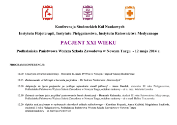 Konferencja Studenckich Kół Naukowych Instytutu Fizjoterapii, Instytutu Pielęgniarstwa, Instytutu Ratownictwa Medycznego PACJENT XXI WIEKU Podhalańska Państwowa Wyższa Szkoła Zawodowa w Nowym Targu - 12 maja 2014 r. PROGRAM KONFERENCJI: 11.00 Uroczyste otwarcie konferencji - Prorektor ds. nauki PPWSZ w Nowym Targu dr Maciej Hodorowicz 11.05 Zastosowanie krioterapii w leczeniu pacjentów - Dr Tadeusz Narkiewicz „Kriomedpol” 12.00 Adaptacja do życia pacjentów po zabiegu wyłonienia stomii jelitowej – Anna Burdek, studentka III roku Pielęgniarstwa, Podhalańska Państwowa Wyższa Szkoła Zawodowa w Nowym Targu, opiekun naukowy – dr n. med. Wioletta Ławska 12.10 Zatrucie sarinem jako przykład zastosowania broni chemicznej – Dominik Gałuszka, student III roku Ratownictwa Medycznego, Podhalańska Państwowa Wyższa Szkoła Zawodowa w Nowym Targu, opiekun naukowy – dr n med. Halina Traczewska 12.20 Opieka nad pacjentem w wybranych chorobach układu oddechowego – Karolina Frączek, Anna Koźbiał, Magdalena Bachleda, studentki II roku Pielęgniarstwa, Podhalańska Państwowa Wyższa Szkoła Zawodowa w Nowym Targu, opiekun naukowy – dr Jadwiga Piotrowicz 12.30 Znaczenie profilaktyki chorób pacjenta XXI wieku w kontekście refleksoterapii bólów migrenowych – Wojciech Kobza, student I roku Uniwersytet Jagielloński CM; Centrum Kosmetyki i Pielęgnacji Ciała w Żywcu 12.40 Zastosowanie kinezyterapii w chorobie poszczepienne zapalenie mózgu – studium przypadku – Katarzyna Warzeszak, Artur Pustułka, studenci II roku Fizjoterapii, Podhalańska Państwowa Wyższa Szkoła Zawodowa w Nowym Targu, opiekun naukowy – dr Halina Zięba 12.50 Oczekiwania pacjentów wobec pielęgniarki związane z komunikowaniem się – Sabina Irzyk, Sylwia Nawara, Karolina Piwowarczyk, studentki II roku Pielęgniarstwa, Podhalańska Państwowa Wyższa Szkoła Zawodowa w Nowym Targu, opiekun naukowy – dr n. med. Wioletta Ławska 13.00 Neuromobilizacje w dysfunkcjach nerwów obwodowych – Agnieszka Starzec, Natalia Wacław, Magdalena Walencik, studentki II roku Fizjoterapii, Podhalańska Państwowa Wyższa Szkoła Zawodowa w Nowym Targu, opiekun naukowy – dr Halina Zięba 13.10 Kompleksowa terapia pacjentki z dyskopatią odcinka lędźwiowego kręgosłupa – studium przypadku – Patrycja Perełka, Aneta Podgórni, Natalia Wikar, studentki II roku Fizjoterapii, Podhalańska Państwowa Wyższa Szkoła Zawodowa w Nowym Targu, opiekun naukowy – dr Halina Zięba 13.20 Resuscytacja krążeniowo-oddechowa, pierwsza pomoc przedmedyczna – RKO, AED, pozycja bezpieczna – Maciej Bulanda, Beata Gaborek, Renata Tokarz, Angelika Sęk, studentki I roku Fizjoterapii, Podhalańska Państwowa Wyższa Szkoła Zawodowa w Nowym Targu, opiekun naukowy – dr Bogumiła Lubińska-Żądło 13.30 Usprawnianie pacjenta po udarze niedokrwiennym mózgu – Monika Kapera, Paulina Kudła, studentki II roku Fizjoterapii, Podhalańska Państwowa Wyższa Szkoła Zawodowa w Nowym Targu, opiekun naukowy – dr Halina Zięba 13.40 Zakres ruchomości kręgosłupa studentów PPWSZ – Justyna Kapturkiewicz, Sylwia Kolasa, Paulina Stanisławczyk, studentki I roku Fizjoterapii, Podhalańska Państwowa Wyższa Szkoła Zawodowa w Nowym Targu, opiekun naukowy – dr Piotr Kurzeja 13.50 Elektrostymulacja TENS w terapii przeciwbólowej – Agnieszka Starzec, Natalia Wacław, studentki II roku Fizjoterapii, Podhalańska Państwowa Wyższa Szkoła Zawodowa w Nowym Targu, opiekun naukowy – dr Halina Zięba 14.00 - 14.30 Przerwa kawowa 14.30 Wpływ wibracji na ciśnienie skurczowe i rozkurczowe krwi – Dawid Mucha, student II roku Fizjoterapii, Podhalańska Państwowa Wyższa Szkoła Zawodowa w Nowym Targu, Akademia Wychowania Fizycznego im. Bronisława Czecha w Krakowie, opiekun naukowy – prof. nadzw. dr hab. Dariusz Mucha 14.40 Nawyki żywieniowe a ryzyko otyłości wśród młodzieży gimnazjalnej z terenu Zubrzycy Dolnej – Beata Joniak, studentka Pielęgniarstwa, Podhalańska Państwowa Wyższa Szkoła Zawodowa w Nowym Targu, opiekun naukowy – dr Maria Zięba 14.50 Wiedza kobiet w wieku rozrodczym na temat Alkoholowego Zespołu Płodowego – Dorota Cholewa, studentka Pielęgniarstwa, Podhalańska Państwowa Wyższa Szkoła Zawodowa w Nowym Targu, opiekun naukowy – dr Maria Zięba 15.00 Zastosowanie fali uderzeniowej w terapii ostrogi piętowej – Paulina Dul, studentka II roku Fizjoterapii, Podhalańska Państwowa Wyższa Szkoła Zawodowa w Nowym Targu 15.10 Zwalczanie bólu w ostrym zespole wieńcowym. Postępowanie ratownika medycznego – prezentacja własnego materiału – Marcin Bystrowski, student Biologii, Uniwersytet Jagielloński, absolwent Instytutu Ratownictwa Medycznego Podhalańskiej Państwowej Wyższej Szkoły Zawodowej w Nowym Targu, opiekun naukowy – dr n. med. Halina Traczewska 15.20 Potrzeby i problemy rodziców dziecka niepełnosprawnego – Sylwia Jamro, studentka Pielęgniarstwa, studentka Pielęgniarstwa, Podhalańska Państwowa Wyższa Szkoła Zawodowa w Nowym Targu, opiekun naukowy – dr Grażyna Dębska 15.30 Zjawisko nadużywania alkoholu przez studentki Podhalańskiej Państwowej Wyższej Szkoły Zawodowej w Nowym Targu – Katarzyna Piszczek, opiekun naukowy – dr n. med. Wioletta Ławska 15.40 Destrukcyjny wpływ osteoporozy na organizm człowieka – studium przypadku – Agata Banaszczak, Agnieszka Diurczak, studentki II roku Fizjoterapii, Podhalańska Państwowa Wyższa Szkoła Zawodowa w Nowym Targu, opiekun naukowy – dr Halina Zięba 15.50 – 16.30 Obrady Komitetu Naukowego 16.30 Wręczenie certyfikatów i wyróżnień; zakończenie konferencji