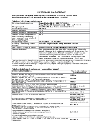 INFORMACJA DLA RODZICÓW Ubezpieczenie następstw nieszczęśliwych wypadków uczniów w Zespole Szkół Ponadgimnazjalnych nr 2 w Chojnicach w roku szkolnym 2016/2017 Tabela nr 1: Podstawowe informacje Nr polisy ubezpieczeniowej Przy składce 32 zł – EDU-A/P 035544 Przy składce 35 zł (absolwenci) – EDU – A/P 035546 Ubezpieczyciel InterRisk TU S.A. Vienna Insurance Group Suma ubezpieczenia 16 000 zł Składka od ucznia 32 zł Składka od ucznia (absolwenta) 35 zł Składka od ucznia/absolwenta 40 zł (wyczynowo uprawiającego sport w ramach poza szkolnych klubów sportowych)* Okres ubezpieczenia 01.09.2016 r. – 31.08.2017 r. Czasowy i terytorialny zakres Ochrona 24 godziny na dobę, na całym świecie ochrony Wyczynowe uprawianie sportu Objęte ochroną, bez zwyżki składki dla ucznia* Wypłata świadczeń Bez powoływania komisji lekarskiej, na podstawie zgłoszenia szkody i dokumentacji medycznej oraz innych dokumentów (np. rachunków za leczenie). Stopień uszczerbku na zdrowiu jest ustalany zaocznie przez lekarza zaufania**. Świadczenie ustalane na podstawie OWU i warunków szczególnych oraz tabeli norm uszczerbku na zdrowiu InterRisk TU S.A. VIG *wyższa składka tylko dla osób biorących udział w treningach, zawodach, zgrupowaniach i obozach kondycyjnych lub szkoleniowych w ramach pozaszkolnych klubów, związków i organizacji sportowych. ** lekarz medycyny lub stomatologii, z którym InterRisk podpisał umowę o współpracy w zakresie oceny stanu zdrowia i podjętego leczenia. Tabela nr 2: Zakres ubezpieczenia i wysokość świadczeń ZAKRES UBEZPIECZENIA ŚMIERĆ NA SKUTEK NIESZCZĘŚLIWEGO WYPADKU (w tym w wyniku zawału serca lub udaru mózgu) ŚMIERĆ NA SKUTEK NIESZCZĘŚLIWEGO WYPADKU KOMUNIKACYJNEGO lub ŚMIERĆ NA TERENIE PLACÓWKI OŚWIATOWEJ ŚWIADCZENIE Z TYTUŁU ŚMIERCI RODZICA (OPIEKUNA PRAWNEGO) W NASTĘPSTWIE NW ŚWIADCZENIE Z TYTUŁU 100% USZCZERBKU NA ZDROWIU USZCZERBEK NA ZDROWIU W WYNIKU NW, w tym w wyniku zawału serca i udaru mózgu (ustalany zgodnie z tabelą norm uszczerbku na zdrowiu) ŚWIADCZENIE Z TYTUŁU ZDIAGNOZOWANIA U UBEZPIECZ. SEPSY ŚWIADCZENIE Z TYTUŁU USZCZERBKU NA ZDROWIU W WYNIKU ATAKU PADACZKI ŚWIADCZENIE ZA WSTRZĄŚNIENIE MÓZGU 1) Wysokość świadczeń (odszkodowania) 16 000 zł 24 000 zł 1 600 zł 16 000 zł 1% SU (160 zł) za 1% uszczerbku jednorazowo 1 600 zł jednorazowo 160 zł od 160 zł do 800 zł w zależności od długości pobytu w szpitalu ŚWIADCZENIE ZA OPARZENIA / ODMROŻENIA 2) od 160 zł do 8 000 zł w zależności od stopnia poparzenia i powierzchni ciała ZWROT KOSZTÓW NABYCIA WYROBÓW MEDYCZNYCH I ŚRODKÓW POMOCNICZYCH ZWROT KOSZTÓW LECZENIA W WYNIKU NNW NA TERENIE RP: - koszty z tytułu wizyt lekarskich - zabiegów ambulatoryjnych, za wyjątkiem rehabilitacji - badań zleconych przez lekarza prowadzącego leczeniu - pobytu w szpitalu - operacji za wyjątkiem operacji plastycznych - zakupu środków opatrunkowych przepisanych przez lekarza ZWROT KOSZTÓW LECZENIA STOMATOLOGICZNEGO W WYNIKU NNW NA TERENIE RP do 3 200 zł do 1 600 zł do 1 600 zł ZWROT KOSZTÓW PRZESZKOLENIA ZAWODOWEGO OSOBY NIEPEŁNOSPRAWNEJ ŚWIADCZENIE SZPITALNE Z TYTUŁU NW (dziennie, za każdy dzień pobytu w szpitalu, płatne od 3 dnia pobytu w szpitalu, maksymalnie za 90 dni) SWIADCZENIE Z TYTUŁU RAN WYMAGAJĄCYCH ZSZYCIA ŚWIADCZENIE ZA POGRYZIENIA PRZEZ PSA I INNE ZWIERZĘ, UKĄSZENIA PRZEZ OWADY ŚWIADCZENIE Z TYTUŁU ZDIAGNOZOWANIA POWAŻNEGO ZACHOROWANIA 3) ŚWIADCZENIE ASSISTANCE (pomoc medyczna, indywidualne korepetycje, pomoc rehabilitacyjna) ŚWIADCZENIE Z TYTUŁU NIEZDOLNOŚCI DO NAUKI LUB PRACY KLAUZULA ZADOŚĆUCZYNIENIA ZA BÓL4) 1) 40 zł za dzień pobytu 320 zł, jeżeli 1 do 2 szwów; 480 zł, jeżeli 3 lub więcej szwów od 240 zł do 800 zł w zależności czy był pobyt w szpitalu i jego długości 3 200 zł SU do 5 000 zł 0,05 % SU za każdy dzień, jeżeli niezdolność pow.14 dni 1% SU (160 zł) Wypłata świadczeń zgodnie z Tabelą nr A: Liczba dni pobytu w szpitalu od 3 do 4 dni od 5 do 6 dni od 7 do 8 dni od 9 do 10 dni powyżej 10 dni 2) do 4 000 zł Wysokość świadczenia wyrażona jako wartość procentowa (%) sumy ubezpieczenia 1 2 3 4 5 Wypłata świadczeń zgodnie z Tabelą nr 6 i 7: Stopień oparzenia / odmrożenia Oparzenie II st. do 1 % powierzchni ciała Oparzenie II st. powyżej 1% do 15% powierzchni ciała Oparzenie II st. powyżej 15% do 30% powierzchni ciała Oparzenie II st. powyżej 30% powierzchni ciała Oparzenie III st. do 5% powierzchni ciała Oparzenie III st. powyżej 5% do 10% powierzchni ciała Oparzenie III st. powyżej 10% do 30% powierzchni ciała Oparzenie III st. powyżej 30% powierzchni ciała Oparzenie IV st. Oparzenie dróg oddechowych z pobytem w szpitalu Odmrożenie II st. albo wyższy - jednego palca ręki lub stopy Odmrożenie II st. albo wyższy - więcej niż jednego palca ręki lub palca stopy, odmrożenie nosa lub ucha Wysokość świadczenia wyrażona jako wartość procentowa (%) sumy ubezpieczenia określonej w umowie ubezpieczenia 1 4 7 20 4 10 20 50 50 20 1 4 nowotwór złośliwy, paraliż, niewydolność nerek, transplantacja głównych organów, poliomyelitis, utrata mowy, utrata słuchu, utrata wzroku, anemia aplastyczna, stwardnienie rozsiane, wrodzona wada serca. 3) 4) Klauzula zadośćuczynienia za ból – zakres świadczeń zostaje rozszerzony o świadczenie z tytułu urazu ciała w wyniku nieszczęśliwego wypadku lub zdarzenia objętego umową, które wymagało interwencji lekarskiej i wymagającej co najmniej jednej wizyty kontrolnej, a nie zostało zakwalifikowane do poważnego uszkodzenia ciała lub był brak uszczerbku na zdrowiu. Limit odpowiedzialności dla tego świadczenia wynosi 1% sumy ubezpieczenia. Świadczenie wypłacane jest niezależnie od świadczeń wypłaconych z innego tytułu, za wyjątkiem świadczenia z tytułu uszczerbku na zdrowiu lub trwałego inwalidztwa częściowego. INFORMACJE DOTYCZĄCE ZGŁOSZENIA SZKODY Szkod