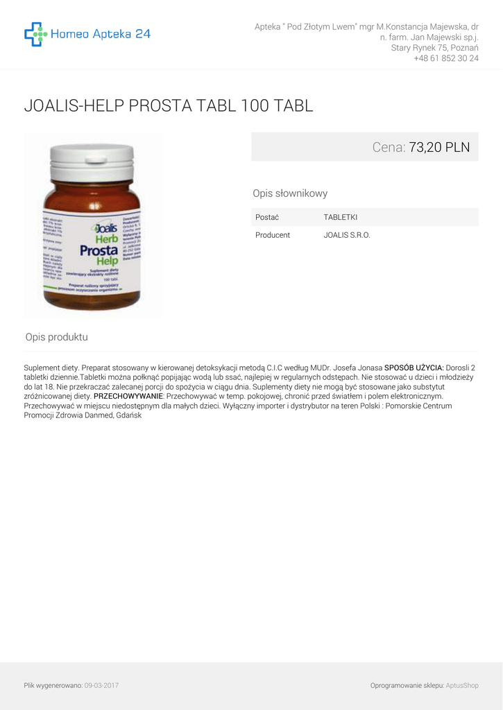 Apteka " Pod Złotym Lwem" mgr M.Konstancja Majewska, dr n. farm. Jan Majewski sp.j. Stary Rynek 75, Poznań +48 61 852 30 24 JOALIS-HELP PROSTA TABL 100 TABL Cena: 73,20 PLN Opis słownikowy Postać TABLETKI Producent JOALIS S.R.O. Opis produktu Suplement diety. Preparat stosowany w kierowanej detoksykacji metodą C.I.C według MUDr. Josefa Jonasa SPOSÓB UŻYCIA: Dorosli 2 tabletki dziennie.Tabletki można połknąć popijając wodą lub ssać, najlepiej w regularnych odstępach. Nie stosować u dzieci i młodzieży do lat 18. Nie przekraczać zalecanej porcji do spożycia w ciągu dnia. Suplementy diety nie mogą być stosowane jako substytut zróżnicowanej diety. PRZECHOWYWANIE: Przechowywać w temp. pokojowej, chronić przed światłem i polem elektronicznym. Przechowywać w miejscu niedostępnym dla małych dzieci. Wyłączny importer i dystrybutor na teren Polski : Pomorskie Centrum Promocji Zdrowia Danmed, Gdańsk Plik wygenerowano: 09-03-2017 Powered by TCPDF (www.tcpdf.org) Oprogramowanie sklepu: AptusShop