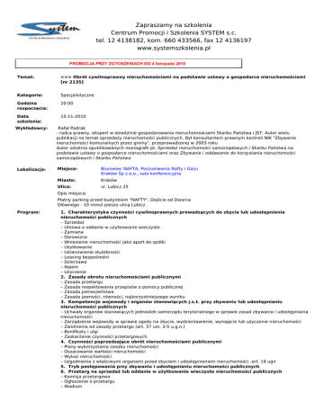 Zapraszamy na szkolenia Centrum Promocji i Szkolenia SYSTEM s.c. tel. 12 4138182, kom. 660 433566, fax 12 4136197 www.systemszkolenia.pl PROMOCJA PRZY ZG?OSZENIACH DO 4 listopada 2010 Temat: >>> Obrót cywilnoprawny nieruchomościami na podstawie ustawy o gospodarce nieruchomościami [nr 2135] Kategoria: Specjalistyczne Godzina rozpoczęcia: 10:00 Data szkolenia: 15-11-2010 Wykładowcy: Lokalizacja: Rafał RafałPadrak Padrak - -radca radcaprawny, prawny,ekspert ekspertwwdziedzinie dziedziniegospodarowania gospodarowanianieruchomościami nieruchomościamiSkarbu SkarbuPaństwa Państwai iJST. JST.Autor Autorwielu wielu publikacji publikacjina natemat tematsprzedaży sprzedażynieruchomości nieruchomościpublicznych. publicznych.Był Byłkonsultantem konsultantemprawnym prawnymkontroli kontroliNIK NIK"Zbywanie "Zbywanie nieruchomości nieruchomościkomunalnych komunalnychprzez przezgminy", gminy",przeprowadzonej przeprowadzonejww2003 2003roku roku Autor Autorostatnio ostatnioopublikowanych opublikowanychmonografii monografiipt. pt.Sprzedaż Sprzedażnieruchomości nieruchomościsamorządowych samorządowychi iSkarbu SkarbuPaństwa Państwana na podstawie podstawieustawy ustawyoogospodarce gospodarcenieruchomościami nieruchomościamioraz orazZbywanie Zbywaniei ioddawanie oddawaniedo dokorzystania korzystanianieruchomości nieruchomości samorządowych samorządowychi iSkarbu SkarbuPaństwa Państwa Miejsce: Miejsce: Biurowiec NAFTA, Poszukiwania Nafty i Gazu Biurowiec NAFTA, Poszukiwania Nafty i Gazu Kraków SpSp z o.o., sala konferencyjna Kraków z o.o., sala konferencyjna Miasto: Miasto: Ulica: Ulica: Kraków Kraków ul.ul. Lubicz 2525 Lubicz Opis miejsca: Opis miejsca: Płatny parking przed budynkiem "NAFTY". Dojście odod Dworca Płatny parking przed budynkiem "NAFTY". Dojście Dworca Głównego - 10 minut pieszo ulicą Lubicz. Głównego - 10 minut pieszo ulicą Lubicz. Program: 1. Charakterystyka czynności cywilnoprawnych prowadzących do zbycia lub udostępnienia nieruchomości publicznych – Sprzedaż – Umowa o oddanie w użytkowanie wieczyste – Zamiana – Darowizna – Wniesienie nieruchomości jako aport do spółki – Użytkowanie – Ustanowienie służebności – Leasing bezpośredni – Dzierżawa – Najem – Użyczenie 2. Zasady obrotu nieruchomościami publicznymi – Zasada przetargu – Zasada respektowania przepisów o pomocy publicznej – Zasada pierwszeństwa – Zasada jawności, równości, najkorzystniejszego wyniku 3. Kompetencje wojewody i organów stanowiących j.s.t. przy zbywaniu lub udostępnianiu nieruchomości publicznych – Uchwały organów stanowiących jednostek samorządu terytorialnego w sprawie zasad zbywania i udostępniania nieruchomości – Zarządzenie wojewody w sprawie zgody na zbycie, wydzierżawienie, wynajęcie lub użyczenie nieruchomości – Zwolnienia od zasady przetargu (art. 37 ust. 3-5 u.g.n.) – Bonifikaty i ulgi – Zaskarżanie czynności przetargowych 4. Czynności poprzedzające obrót nieruchomościami publicznymi – Plany wykorzystania zasobu nieruchomości – Oszacowanie wartości nieruchomości – Wykaz nieruchomości – Uzgodnienia z właściwymi organami przed zbyciem i udostępnieniem nieruchomości -art. 19 ugn 5. Tryb postępowania przy zbywaniu i udostępnianiu nieruchomości publicznych 6. Przetarg na sprzedaż lub oddanie w użytkowanie wieczyste nieruchomości publicznych – Komisja przetargowa – Ogłoszenie o przetargu – Wadium – Oferta i oferenci – Przebieg przetargu pisemnego nieograniczonego – Przebieg przetargu ustnego nieograniczonego – Przetarg ograniczony (art. 40 ust. 2a u.g.n.) – Przetarg zakończony wynikiem negatywnym – Zawiadomienie oferentów o wyniku przetargu – Zaskarżanie czynności przetargowych – Protokół z przeprowadzonego przetargu – Informowanie o wyniku przetargu 7. Bezprzetargowe zbywanie nieruchomości publicznych – Pierwszeństwo nabycia nieruchomości publicznej – Zbycie w drodze zamiany lub darowizny (art. 37 ust. 2 pkt 4 u.g.n.) – Sprzedaż nieruchomości na polepszenie warunków zagospodarowania (art. 37 ust. 2 pkt 6 u.g.n.) – Wniesienie nieruchomości jako wkładu niepieniężny (aport) do spółki albo wyposażenie nowo tworzonej państwowej lub samorządowej osoby prawnej, lub majątek tworzonej fundacji (art. 37 ust. 2 pkt 7 u.g.n.) – Sprzedaż udziału w nieruchomości na rzecz współwłaścicieli (art. 37 ust. 2 pkt 9 u.g.n.) – Sprzedaż nieruchomości na rzecz kościołów i związków wyznaniowych (art. 37 ust. 2 pkt 10 u.g.n.) – Protokół z rokowań prowadzonych na podstawie art. 37 ust. 2 i 3 ustawy – Zawiadamianie o wyniku rokowań prowadzonych na podstawie art. 37 ust. 2 i 3 ustawy 8. Rokowania po drugim przetargu na sprzedaż lub oddanie w użytkowanie wieczyste nieruchomości publicznych (art. 39 ust. 2 u.g.n.) – Ogłoszenie o rokowaniach – Zgłoszenie do rokowań – Przebieg rokowań – Protokół z rokowań po drugim przetargu – Informowanie o wyniku rokowań po drugim przetargu – Zaskarżanie wyników rokowań po drugim przetargu 9. Tryb postępowania przy oddawaniu do korzystania nieruchomości publicznych – Uwagi ogólne – Procedura przetargowa – Negocjacje o nabycie prawa – Tryb ofertowy. Metodologia: Wykład z wykorzystaniem technik audiowizualnych oraz autorskich materiałów szkoleniowych, analiza przypadków, dyskusja Certyfikaty: tak Cena: Cena zawiera: Warunki uczestnictwa: CENA DATA REJESTRACJI 290.00 netto zł./osobę (356.70 zł. brutto) do: 04-11-2010 330.00 netto zł./osobę (405.90 zł. brutto) od: 05-11-2010 RABAT 40.00 zł./osobę materiały szkoleniowe, poczęstunek w przerwie kawowej, lunch, imienne zaświadczenie uczestnictwa Zgłoszenia uczestnictwa można dokonać przez: - formularz elektroniczny na dole tej strony (zalecane) - lub telefonicznie (012) 413-81-82 - lub pisemnie, faksem (012) 413-61-97 - lub przez e-mail: [email protected] • Ogólna „Karta zgłoszenia 