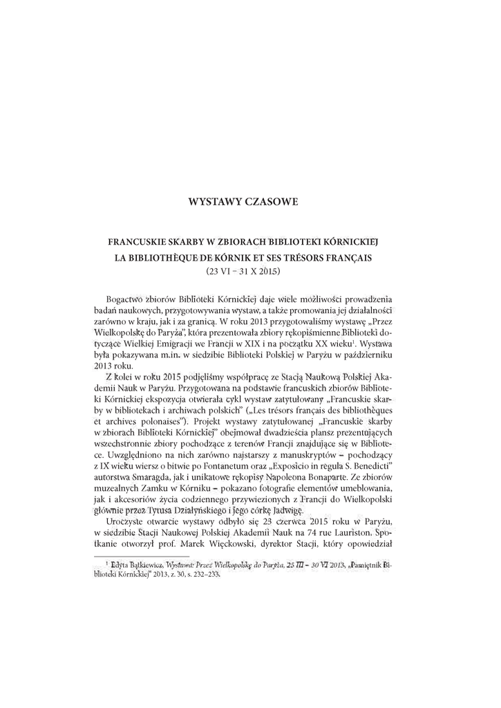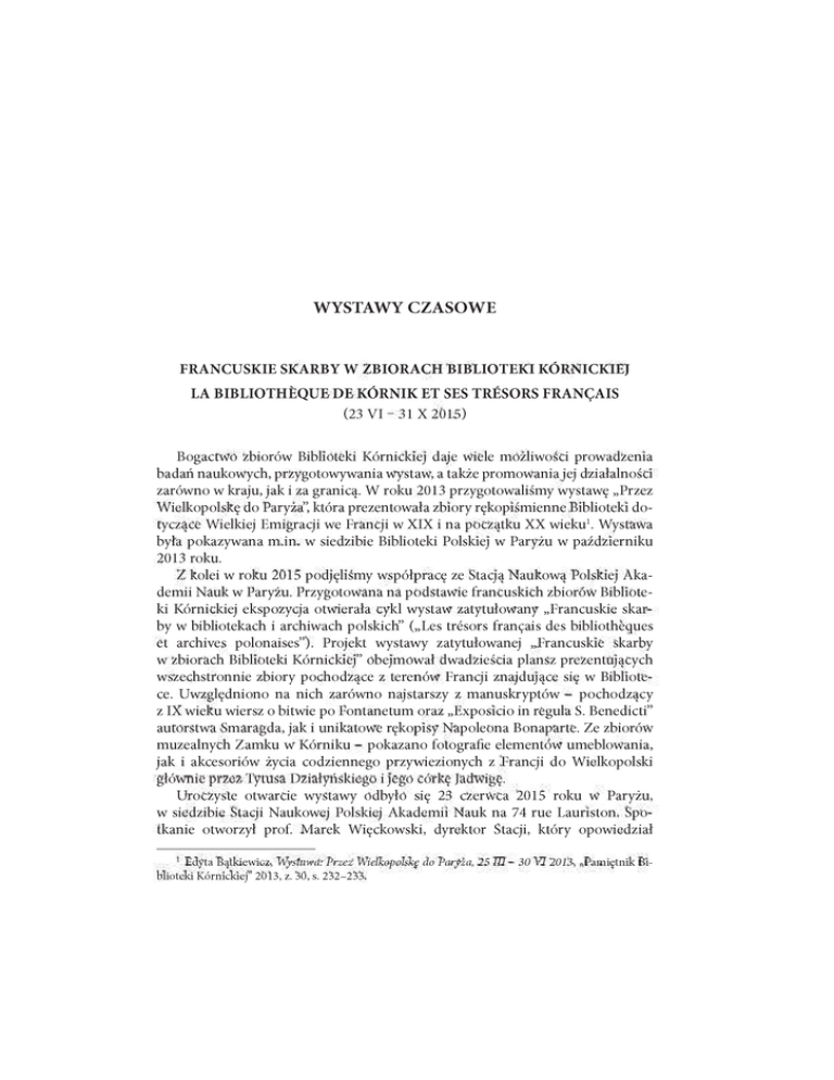 WYSTAWY CZASOWE FRANCUSKIE SKARBY W ZBIORACH BIBLIOTEKI KÓRNICKIEJ LA BIBLIOTHÈQUE DE KÓRNIK ET SES TRÉSORS FRANÇAIS (23 VI - 31 X 2015) Bogactwo zbiorów Biblioteki Kórnickiej daje wiele możliwości prowadzenia badań naukowych, przygotowywania wystaw, a także promowania jej działalności zarówno w kraju, jak i za granicą. W roku 2013 przygotowaliśmy wystawę „Przez Wielkopolskę do Paryża", która prezentowała zbiory rękopiśmienne Biblioteki dotyczące Wielkiej Emigracji we Francji w XIX i na początku XX wieku1. Wystawa była pokazywana m.in. w siedzibie Biblioteki Polskiej w Paryżu w październiku 2013 roku. Z kolei w roku 2015 podjęliśmy współpracę ze Stacją Naukową Polskiej Akademii Nauk w Paryżu. Przygotowana na podstawie francuskich zbiorów Biblioteki Kórnickiej ekspozycja otwierała cykl wystaw zatytułowany „Francuskie skarby w bibliotekach i archiwach polskich" („Les trésors français des bibliothèques et archives polonaises"). Projekt wystawy zatytułowanej „Francuskie skarby w zbiorach Biblioteki Kórnickiej" obejmował dwadzieścia plansz prezentujących wszechstronnie zbiory pochodzące z terenów Francji znajdujące się w Bibliotece. Uwzględniono na nich zarówno najstarszy z manuskryptów - pochodzący z IX wieku wiersz o bitwie po Fontanetum oraz „Exposicio in regula S. Benedicti" autorstwa Smaragda, jak i unikatowe rękopisy Napoleona Bonaparte. Ze zbiorów muzealnych Zamku w Kórniku - pokazano fotografie elementów umeblowania, jak i akcesoriów życia codziennego przywiezionych z Francji do Wielkopolski głównie przez Tytusa Działyńskiego i jego córkę Jadwigę. Uroczyste otwarcie wystawy odbyło się 23 czerwca 2015 roku w Paryżu, w siedzibie Stacji Naukowej Polskiej Akademii Nauk na 74 rue Lauriston. Spotkanie otworzył prof. Marek Więckowski, dyrektor Stacji, który opowiedział 1 Edyta Bątkiewicz, Wystawa: Przez Wielkopolskę do Paryża, 25 III - 30 VI2013, „Pamiętnik Biblioteki Kórnickiej" 2013, z. 30, s. 232-233. 270 WYSTAWY CZASOWE 0 wieloletnich stosunkach kulturalnych łączących Polskę z Francją. Następnie prezentacje i wykłady dotyczące zbiorów francuskich w polskich bibliotekach 1 archiwach przedstawili: Magdalena Biniaś-Szkopek i Magdalena Marcinkowska, La Bibliothèque de Kórnik et ses trésors français; Agnieszka Jakuboszcza, Teofila z Działyńskich Szołdrska-Potulicka, portrait d'une dame mondaine à travers les archives francophones de Kórnik; Jérémie Fischer, Les différents visages de la noblesse polonaise dans les „Mémoires" de l'abbé Pochard (1796-1833). Po wystąpieniach i dyskusji Magdalena Biniaś-Szkopek oprowadzała gości, prezentując wystawę i opisując prezentowane zbiory. Wernisaż zgromadził ponad sto osób, głównie ze środowisk naukowych związanych ze współpracą polsko-francuską. Wystawa została umieszczona w holu głównym Stacji Naukowej Polskiej Akademii Nauk i była otwarta dla zwiedzających od 23 czerwca do 31 października 2015 roku. Magdalena Biniaś-Szkopek W 90. ROCZNICĘ POWSTANIA FUNDACJI „ZAKŁADY KÓRNICKIE" (1-31 VII 2015) W 2015 roku minęło 90 lat od uchwalenia ustawy, na mocy której powołano Fundację „Zakłady Kórnickie". Stało się to inspiracją do zorganizowania specjalnej wystawy. Ekspozycja zaplanowana na cały lipiec, w Sali Czarnej kórnickiego Zamku, została otwarta już wcześniej - w ostatni weekend maja (30-31) w Klaudynówce. Majową inaugurację uatrakcyjnił występ artystyczny, ucharakteryzowanego na hr. Władysława Zamoyskiego, Tomasza Raczkiewicza. Na uroczystym otwarciu obecny był dyrektor Biblioteki Kórnickiej prof. dr hab. Tomasz Jasiński i prezes Fundacji Zakłady Kórnickie Kazimierz Grzesiak. Na wystawie obiekty przedstawione były w siedmiu gablotach, których zawartość ułożono według klucza tematycznego. W pierwszych gablotach prezentowano materiały związane z twórcami Fundacji „Zakłady Kórnickie" - Jadwigą, Władysławem i Marią Zamoyskimi. Z bogatego zbioru pamiątek po hr. Jadwidze Zamoyskiej wybrano m.in. jej paszport oraz „Notatkę mającą pomóc w ewentualnej beatyfikacji Jadwigi Zamoyskiej", napisaną prawdopodobnie przez jedną z nauczycielek lub uczennic Szkoły Domowej Pracy Kobiet. Kolejna grupa materiałów związana była ze śmiercią syna Jadwigi Zamoyskiej. Władysław hr. Zamoyski zmarł 3 października 1924 roku, a jego pogrzeb odbył się w Kórniku 6 października. Mowę żałobną przy zwłokach WYSTAWY CZASOWE wygłosił ks. Arkadiusz Lisiecki, późniejszy biskup diecezji katowickiej. W imieniu pracowników mowę wygłosił bliski współpracownik hrabiego, dyrektor dóbr kórnickich, ojciec późniejszej noblistki, Wincenty Szymborski. Została ona powielona i wydana jako broszura. Śmierć hr. Władysława Zamoyskiego była szeroko komentowana w kraju. Na ręce jego siostry, Marii Zamoyskiej, spłynęły liczne depesze kondolencyjne składane przez najważniejsze osoby w państwie (m.in. prezydenta Stanisława Wojciechowskiego, marszałka Senatu Wojciecha Trąmpczyńskiego, premiera Władysława Grabskiego, gen. Władysława Sikorskiego, arcybiskupa gnieźnieńskiego i poznańskiego kardynała Edmunda Dalbora), a także przez luminarzy nauki i kultury (m.in. Oswalda Balzera i Stanisława Ignacego Witkiewicza). Gablotę uzupełniły rękopisy wspomnień Marii Zamoyskiej, niezwykle bogate w informacje dotyczące życia codziennego mieszkańców Zamku w Kórniku wraz z opisem ostatnich dni hrabiego i informacją o przyjęciu przez niego szkaplerza. Władysław Zamoyski, w obliczu swej bezpotomnej śmierci, podjął wraz z matką i siostrą decyzję o darowaniu swych dóbr narodowi polskiemu. W lutym 1924 roku Władysław i Maria Zamoyscy złożyli na ręce prezydenta RP Stanisława Wojciechowskiego akt donacyjny. 20 lipca 1925 roku mocą ustawy Sejmu RP została utworzona Fundacja Zakłady Kórnickie, objęta patronatem Prezydenta i Prymasa Polski. Jej utwor