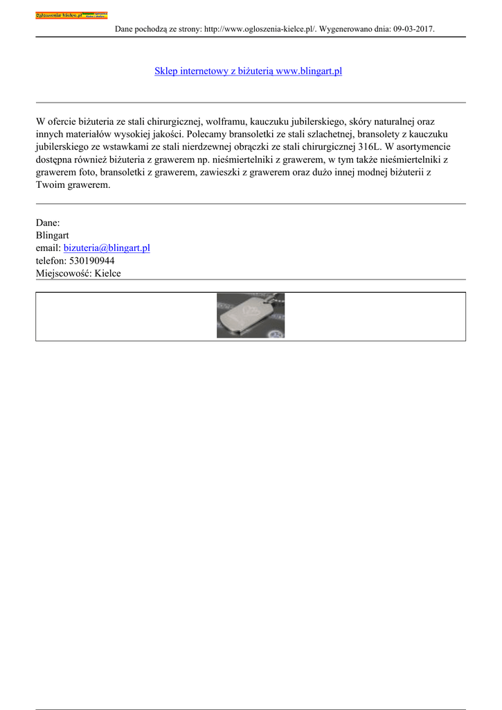 Dane pochodzą ze strony: http://www.ogloszenia-kielce.pl/. Wygenerowano dnia: 09-03-2017. Sklep internetowy z biżuterią www.blingart.pl W ofercie biżuteria ze stali chirurgicznej, wolframu, kauczuku jubilerskiego, skóry naturalnej oraz innych materiałów wysokiej jakości. Polecamy bransoletki ze stali szlachetnej, bransolety z kauczuku jubilerskiego ze wstawkami ze stali nierdzewnej obrączki ze stali chirurgicznej 316L. W asortymencie dostępna również biżuteria z grawerem np. nieśmiertelniki z grawerem, w tym także nieśmiertelniki z grawerem foto, bransoletki z grawerem, zawieszki z grawerem oraz dużo innej modnej biżuterii z Twoim grawerem. Dane: Blingart email: [email protected] telefon: 530190944 Miejscowość: Kielce
