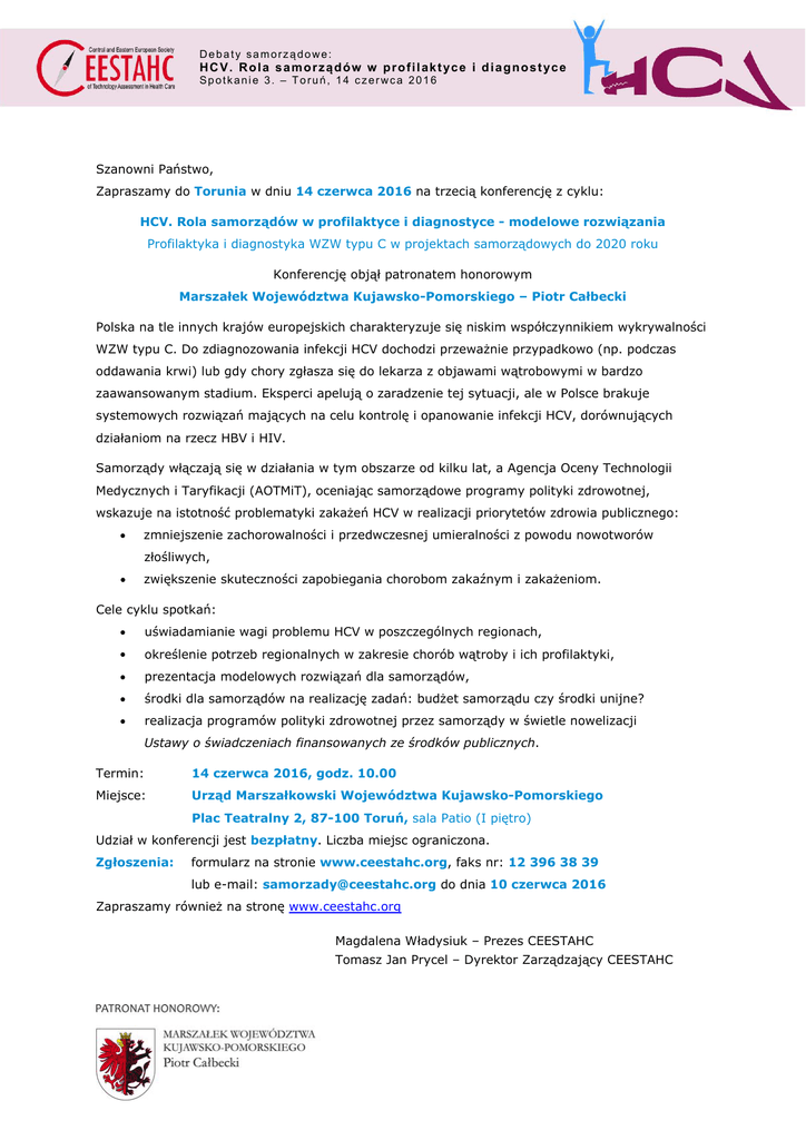 Debaty samorządowe: HCV. Rola samorządów w profilaktyce i diagnostyce Spotkanie 3. – Toruń, 14 czerwca 2016 Szanowni Państwo, Zapraszamy do Torunia w dniu 14 czerwca 2016 na trzecią konferencję z cyklu: HCV. Rola samorządów w profilaktyce i diagnostyce - modelowe rozwiązania Profilaktyka i diagnostyka WZW typu C w projektach samorządowych do 2020 roku Konferencję objął patronatem honorowym Marszałek Województwa Kujawsko-Pomorskiego – Piotr Całbecki Polska na tle innych krajów europejskich charakteryzuje się niskim współczynnikiem wykrywalności WZW typu C. Do zdiagnozowania infekcji HCV dochodzi przeważnie przypadkowo (np. podczas oddawania krwi) lub gdy chory zgłasza się do lekarza z objawami wątrobowymi w bardzo zaawansowanym stadium. Eksperci apelują o zaradzenie tej sytuacji, ale w Polsce brakuje systemowych rozwiązań mających na celu kontrolę i opanowanie infekcji HCV, dorównujących działaniom na rzecz HBV i HIV. Samorządy włączają się w działania w tym obszarze od kilku lat, a Agencja Oceny Technologii Medycznych i Taryfikacji (AOTMiT), oceniając samorządowe programy polityki zdrowotnej, wskazuje na istotność problematyki zakażeń HCV w realizacji priorytetów zdrowia publicznego: zmniejszenie zachorowalności i przedwczesnej umieralności z powodu nowotworów złośliwych, zwiększenie skuteczności zapobiegania chorobom zakaźnym i zakażeniom. Cele cyklu spotkań: uświadamianie wagi problemu HCV w poszczególnych regionach, określenie potrzeb regionalnych w zakresie chorób wątroby i ich profilaktyki, prezentacja modelowych rozwiązań dla samorządów, środki dla samorządów na realizację zadań: budżet samorządu czy środki unijne? realizacja programów polityki zdrowotnej przez samorządy w świetle nowelizacji Ustawy o świadczeniach finansowanych ze środków publicznych. Termin: 14 czerwca 2016, godz. 10.00 Miejsce: Urząd Marszałkowski Województwa Kujawsko-Pomorskiego Plac Teatralny 2, 87-100 Toruń, sala Patio (I piętro) Udział w konferencji jest bezpłatny. Liczba miejsc ograniczona. Zgłoszenia: formularz na stronie www.ceestahc.org, faks nr: 12 396 38 39 lub e-mail: [email protected] do dnia 10 czerwca 2016 Zapraszamy również na stronę www.ceestahc.org Magdalena Władysiuk – Prezes CEESTAHC Tomasz Jan Prycel – Dyrektor Zarządzający CEESTAHC Debaty samorządowe: HCV. Rola samorządów w profilaktyce i diagnostyce Spotkanie 3. – Toruń, 14 czerwca 2016 Termin: 14 czerwca 2016, godz. 10.00 Miejsce: Urząd Marszałkowski Województwa Kujawsko-Pomorskiego Plac Teatralny 2, 87-100 Toruń, sala Patio (I piętro) Powitanie oraz wystąpienie Przedstawiciela Urzędu Marszałkowskiego 10 min. Problematyka wirusowego zapalenia wątroby 20 min. Epidamiologia, diagnostyka, terapia w świetle aktualnych standardów postępowania prof. dr hab. n. med. Waldemar Halota – Kierownik Katedry Chorób Zakaźnych i Hepatologii, Collegium Medicum im. L. Rydygiera w Bydgoszczy Aspekt społeczny HCV, koszty pośrednie, w tym aktywność zawodowa i powroty do pracy 15 min. Magdalena Władysiuk – Prezes Stowarzyszenia CEESTAHC Koszty terapii wirusowych chorób wątroby z perspektywy płatnika * 15 min. Dyrektor Elżbieta Kasprowicz - Narodowy Fundusz Zdrowia, Kujawsko-Pomorski Oddział Wojewódzki w Bydgoszczy Niezdolność do pracy z powodu WZW typu C * 10 min. Krzysztof Bułkowski – Dyrektor Oddziału ZUS w Bydgoszczy Podstępne WZW * 15 min. dr n. o zdr. inż. Jerzy Kasprzak - Państwowy Wojewódzki Inspektor Sanitarny, Dyrektor Wojewódzkiej Stacji Sanitarno-Epidemiologicznej w Bydgoszczy Wykrywanie WZW typu C w badaniach przesiewowych na przykładzie województwa kujawsko-pomorskiego* 15 min. dr n. med. Krzysztof Gierlotka – Katedra Chorób Zakaźnych i Hepatologii, Uniwersytet Mikołaja Kopernika; Collegium Medicum im. Ludwika Rydygiera w Bydgoszczy Modelowe rozwiązania dla samorządów 15 min. Tomasz Jan Prycel – Dyrektor Zarządzający Stowarzyszenia CEESTAHC Dyskusja z udziałem decydentów nt. możliwych rozwiązań i działań w regionie wczesna diagnostyka samoświadomość pacjentów terapia i rehabilitacja rola samorządów i innych instytucji publicznych i organizacji pozarządowych rola ubezpieczyciela Podsumowanie Poczęstunek Planowany łączny czas trwania konferencji: ok. 2 godz. 45 min. * w trakcie uzgadniania 30 min. 10min. Debaty samorządowe: HCV. Rola samorządów w profilaktyce i diagnostyce Spotkanie 3. – Toruń, 14 czerwca 2016 FORMULARZ ZGŁOSZENIOWY na cykl konferencji HCV. Rola samorządów w profilaktyce i diagnostyce Spotkanie 3. – Toruń, 14 czerwca 2016 Zgłoszenia można dokonać na kilka sposobów: wypełnić formularz elektroniczny na stronie www.ceestahc.org przesyłać dane potrzebne do zgłoszenia na e-mail: [email protected] przesłać faksem zamieszczony poniżej formularz na nr faks: 12 396 38 39 Ostateczny termin nadsyłania formularza zgłoszeń: 10 czerwca 2016 (decyduje data rejestracji w systemie, wysłania wiadomości e-mail lub faksu). PROSIMY O CZYTELNE WYPEŁNIENIE PONIŻSZEGO FORMULARZA DANE OSOBOWE Imię i nazwisko Stanowisko / Funkcja Reprezentowana instytucja Adres instytucji Telefon kontaktowy Adres e-mail