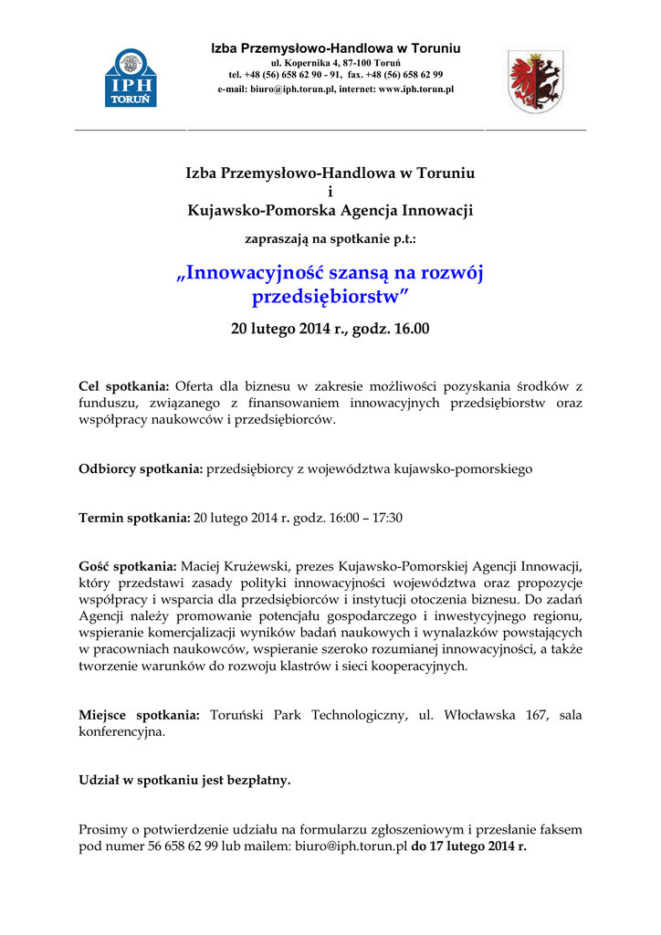 Izba Przemysłowo-Handlowa w Toruniu ul. Kopernika 4, 87-100 Toruń tel. +48 (56) 658 62 90 - 91, fax. +48 (56) 658 62 99 e-mail: [email protected], internet: www.iph.torun.pl Izba Przemysłowo-Handlowa w Toruniu i Kujawsko-Pomorska Agencja Innowacji zapraszają na spotkanie p.t.: „Innowacyjność szansą na rozwój przedsiębiorstw” 20 lutego 2014 r., godz. 16.00 Cel spotkania: Oferta dla biznesu w zakresie moŜliwości pozyskania środków z funduszu, związanego z finansowaniem innowacyjnych przedsiębiorstw oraz współpracy naukowców i przedsiębiorców. Odbiorcy spotkania: przedsiębiorcy z województwa kujawsko-pomorskiego Termin spotkania: 20 lutego 2014 r. godz. 16:00 – 17:30 Gość spotkania: Maciej KruŜewski, prezes Kujawsko-Pomorskiej Agencji Innowacji, który przedstawi zasady polityki innowacyjności województwa oraz propozycje współpracy i wsparcia dla przedsiębiorców i instytucji otoczenia biznesu. Do zadań Agencji naleŜy promowanie potencjału gospodarczego i inwestycyjnego regionu, wspieranie komercjalizacji wyników badań naukowych i wynalazków powstających w pracowniach naukowców, wspieranie szeroko rozumianej innowacyjności, a takŜe tworzenie warunków do rozwoju klastrów i sieci kooperacyjnych. Miejsce spotkania: Toruński Park Technologiczny, ul. Włocławska 167, sala konferencyjna. Udział w spotkaniu jest bezpłatny. Prosimy o potwierdzenie udziału na formularzu zgłoszeniowym i przesłanie faksem pod numer 56 658 62 99 lub mailem: [email protected] do 17 lutego 2014 r.