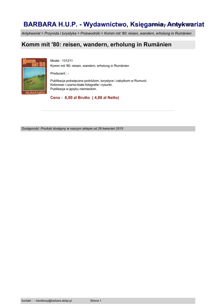 Utworzono Antykwariat : 09 marzec 2017 BARBARA H.U.P. - Wydawnictwo, Księgarnia, Antykwariat > Przyroda i turystyka > Przewodniki > Komm mit '80: reisen, wandern, erholung in Rumänien Komm mit '80: reisen, wandern, erholung in Rumänien Model : 131211 Komm mit '80: reisen, wandern, erholung in Rumänien Producent : Publikacja poświęcona podróżom, turystyce i zabytkom w Rumunii. Kolorowe i czarno-białe fotografie i rysunki. Publikacja w języku niemieckim. Cena : 6,00 zł Brutto ( 4,88 zł Netto) Dostępność: Produkt dostępny w naszym sklepie od 28 kwiecień 2015 kontakt : - [email protected] Strona 1