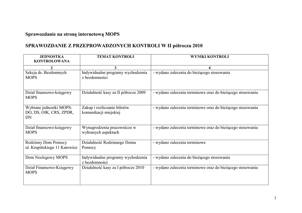 Sprawozdanie na stronę internetową MOPS SPRAWOZDANIE Z PRZEPROWADZONYCH KONTROLI W II półroczu 2010 JEDNOSTKA KONTROLOWANA 2 TEMAT KONTROLI WYNIKI KONTROLI 3 4 Sekcja ds. Bezdomnych MOPS Indywidualne programy wychodzenia z bezdomności - wydano zalecenia do bieżącego stosowania Dział finansowo-księgowy MOPS Działalność kasy za II półrocze 2009 - wydano zalecenia terminowe oraz do bieżącego stosowania Wybrane jednostki MOPS: DO, DS, OIK, CRS, ZPDR, DN Zakup i rozliczanie biletów komunikacji miejskiej - wydano zalecenia terminowe oraz do bieżącego stosowania Dział finansowo-księgowy MOPS Wynagrodzenia pracownicze w wybranych aspektach - wydano zalecenia terminowe oraz do bieżącego stosowania Rodzinny Dom Pomocy ul. Krupińskiego 11 Katowice Działalność Rodzinnego Domu Pomocy - wydano zalecenia terminowe Dom Noclegowy MOPS Indywidualne programy wychodzenia z bezdomności Działalność kasy za I półrocze 2010 - wydano zalecenia do bieżącego stosowania Dział Finansowo-Księgowy MOPS - wydano zalecenia terminowe oraz do bieżącego stosowania 1 Centrum Poradnictwa Specjalistycznego, Metodyki i Strategii MOPS Wykorzystanie czasu pracy oraz jego dokumentowanie przez pracowników - wydano zalecenia terminowe oraz do bieżącego stosowania Centrum Rehabilitacji Społecznej Wykorzystanie czasu pracy oraz jego dokumentowanie przez pracowników - wydano zalecenia do bieżącego stosowania Rodzinny Dom Pomocy ul. Krupińskiego 11 Katowice Działalność Rodzinnego Domu Pomocy - brak zaleceń pokontrolnych Dom Dziecka „Stanica” Działalność Domu Dziecka „Stanica” w wybranych aspektach - rekontrola - wydano zalecenia do bieżącego stosowania Ośrodek Wypoczynkowy „SABAT” Zakres kontroli zgodny z warunkami umowy (kolonie w Międzygórzu) - wydano zalecenia do bieżącego stosowania Agencja TurystycznoUsługowa „BAWDIM” Zakres kontroli zgodny z warunkami umowy (kolonie w Iwoniczu Zdrój) - wydano zalecenia terminowe Agencja TurystycznoUsługowa „BAWDIM” Zakres kontroli zgodny z warunkami umowy (kolonie w Ustrzykach Dolnych) - wydano zalecenia terminowe Agencja TurystycznoUsługowa „BAWDIM” Zakres kontroli zgodny z warunkami umowy (kolonie w Tarnawie Dolnej) - wydano zalecenia do bieżącego stosowania Agencja TurystycznoUsługowa „BAWDIM” Zakres kontroli zgodny z warunkami umowy (kolonie w Ustrzykach Dolnych) Agencja TurystycznoUsługowa „BAWDIM” Zakres kontroli zgodny z warunkami umowy (kolonie w Tarnawie Dolnej) - brak zaleceń pokontrolnych - wydano zalecenia terminowe 2 Ośrodek Wypoczynkowy „SABAT” Zakres kontroli zgodny z warunkami umowy (kolonie w Międzygórzu) - brak zaleceń pokontrolnych Biuro Podróży Gold Ravel Zakres kontroli zgodny z warunkami umowy (kolonie w Zakopanym) - wydano zalecenia terminowe Dzienny Dom Pomocy Społecznej Nr 6 ul. Oblatów 24 Zgodność wykorzystania przedmiotu użyczenia i najmu z umowami - brak zaleceń pokontrolnych Dzienny Dom Pomocy Społecznej Nr 1 ul. Czecha 2 Zgodność wykorzystania przedmiotu użyczenia i najmu z umowami - wydano zalecenia do bieżącego stosowania Dzienny Dom Pomocy Społecznej Nr 2 ul. Głogowska 23 Zgodność wykorzystania przedmiotu użyczenia i najmu z umowami - brak zaleceń pokontrolnych Dzienny Dom Pomocy Społecznej Nr 5 ul. Świdnicka 35a Zgodność wykorzystania przedmiotu użyczenia i najmu z umowami - brak zaleceń pokontrolnych Poradnia Psychologiczno Pedagogiczna Nr 2 ul. Łętowskiego 6a Zgodność wykorzystania przedmiotu użyczenia i najmu z umowami - brak zaleceń pokontrolnych Katowicka Fundacja Pomocy Dzieciom Kalekim (Niepełnosprawnym) Rekontrola realizacji umowy w zakresie opracowywania indywidualnych programów rehabilitacyjnych, świadczenia poradnictwa psychologicznego i prowadzenia grup wsparcia - brak zaleceń pokontrolnych 3 Katowicka Fundacja Pomocy Dzieciom Kalekim (Niepełnosprawnym) Śląskie Stowarzyszenie Pomocy Dzieciom Specjalnej Troski i Osobom z Upośledzeniem Umysłowym Oddział Odrodzenie Dzienny Dom Pomocy Społecznej nr 1 ul. Czecha 2 Polskie Stowarzyszenie na Rzecz Osób z Upośledzeniem Umysłowym Koło w Katowicach – Giszowcu Zarząd Okręgowy Polskiego Komitetu Pomocy Społecznej Niepubliczny Zakład Opieki Zdrowotnej Zespół Medyczno-Opiekuńczy Alicja Kluczna Polskie Stowarzyszenie na Rzecz Osób z Upośledzeniem Umysłowym Koło w Katowicach - Giszowcu Kontrola realizacji umowy - brak zaleceń pokontrolnych świadczenie usług w formie dziennego pobytu dzieci powyżej 7 roku życia i młodzieży niepełnosprawnej Zakres zgodny z warunkami umowy - brak zaleceń pokontrolnych Zakres zgodny z warunkami umowy - brak zaleceń pokontrolnych Zakres zgodny z warunkami umowy - wydano zalecenia do bieżącego stosowania Zakres zgodny z warunkami umowy - brak zaleceń pokontrolnych Rekontrola kwalifikacji opiekunek i terminowości przekazywania informacji ze wskazaniem konkretnej opiekunki, dni tygodnia i godzin świadczenia usług do właściwej jednostki Zakres zgodny z warunkami umowy - brak zaleceń pokontrolnych - wydano zalecenia terminowe 4 Śląski Zarząd Okręgowy Polskiego Czerwonego Krzyża Rekontrola kwalifikacji opiekunek, przekazywania informacji o opiekunkach, dniach tygodnia i godzinach świadczenia usług, przekazywania wstrzymań usług Warsztat Terapii Zajęciowej UNIKAT, ul. Kotlarza 10 B w Katowicach – prowadzony przez Stowarzyszenie Wspierania Działań Twórczych UNIKAT ul. Kotlarza 10 B w Katowicach Kontrola w zakresie działalności warsztatu zgodnie z Rozporządzeniem Ministra Gospodarki, Pracy i Polityki Społecznej z dnia 25 marca 2004 w sprawie warsztatów terapii zajęciowej (Dz.U.04.63.587) Warsztat Terapii Zajęciowej „Promyk”, ul. Ociepki 8a w Katowicach – prowadzony przez Fundację Pomocy Dzieciom i Młodzieży Niepełnosprawnej im. Św. Stanisława Kostki ul. Ociepki 8a w Katowicach Kontrola w zakresie działalności warsztatu zgodnie z Rozporządzeniem Ministra Gospodarki, Pracy i Po