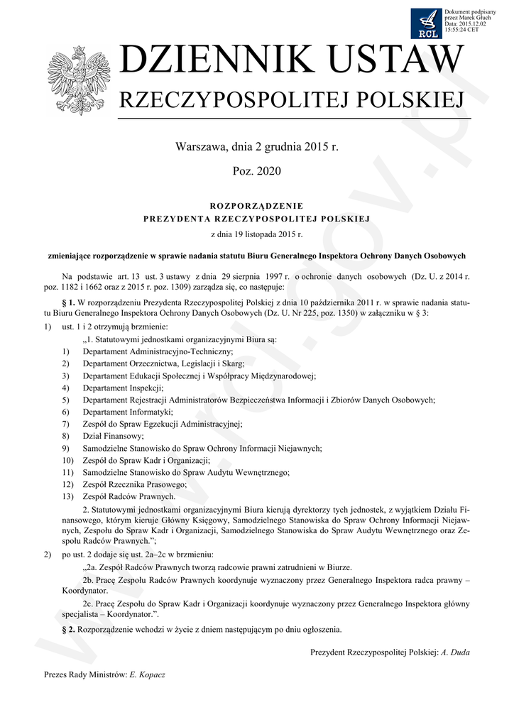 Dokument podpisany przez Marek Głuch Data: 2015.12.02 15:55:24 CET l.g ov .pl DZIENNIK USTAW RZECZYPOSPOLITEJ POLSKIEJ Warszawa, dnia 2 grudnia 2015 r. Poz. 2020 RO ZP O R ZĄ D ZE N I E P R E ZY D EN T A R ZE C ZYP O SP O L I T EJ P O L S K I EJ z dnia 19 listopada 2015 r. zmieniające rozporządzenie w sprawie nadania statutu Biuru Generalnego Inspektora Ochrony Danych Osobowych Na podstawie art. 13 ust. 3 ustawy z dnia 29 sierpnia 1997 r. o ochronie danych osobowych (Dz. U. z 2014 r. poz. 1182 i 1662 oraz z 2015 r. poz. 1309) zarządza się, co następuje: § 1. W rozporządzeniu Prezydenta Rzeczypospolitej Polskiej z dnia 10 października 2011 r. w sprawie nadania statutu Biuru Generalnego Inspektora Ochrony Danych Osobowych (Dz. U. Nr 225, poz. 1350) w załączniku w § 3: 1) ust. 1 i 2 otrzymują brzmienie: „1. Statutowymi jednostkami organizacyjnymi Biura są: Departament Administracyjno-Techniczny; Departament Orzecznictwa, Legislacji i Skarg; Departament Edukacji Społecznej i Współpracy Międzynarodowej; Departament Inspekcji; Departament Rejestracji Administratorów Bezpieczeństwa Informacji i Zbiorów Danych Osobowych; Departament Informatyki; Zespół do Spraw Egzekucji Administracyjnej; Dział Finansowy; Samodzielne Stanowisko do Spraw Ochrony Informacji Niejawnych; Zespół do Spraw Kadr i Organizacji; Samodzielne Stanowisko do Spraw Audytu Wewnętrznego; Zespół Rzecznika Prasowego; Zespół Radców Prawnych. w. rc 1) 2) 3) 4) 5) 6) 7) 8) 9) 10) 11) 12) 13) ww 2. Statutowymi jednostkami organizacyjnymi Biura kierują dyrektorzy tych jednostek, z wyjątkiem Działu Finansowego, którym kieruje Główny Księgowy, Samodzielnego Stanowiska do Spraw Ochrony Informacji Niejawnych, Zespołu do Spraw Kadr i Organizacji, Samodzielnego Stanowiska do Spraw Audytu Wewnętrznego oraz Zespołu Radców Prawnych.”; 2) po ust. 2 dodaje się ust. 2a–2c w brzmieniu: „2a. Zespół Radców Prawnych tworzą radcowie prawni zatrudnieni w Biurze. 2b. Pracę Zespołu Radców Prawnych koordynuje wyznaczony przez Generalnego Inspektora radca prawny – Koordynator. 2c. Pracę Zespołu do Spraw Kadr i Organizacji koordynuje wyznaczony przez Generalnego Inspektora główny specjalista – Koordynator.”. § 2. Rozporządzenie wchodzi w życie z dniem następującym po dniu ogłoszenia. Prezes Rady Ministrów: E. Kopacz Prezydent Rzeczypospolitej Polskiej: A. Duda