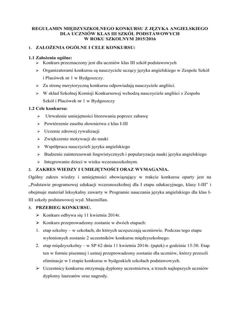 REGULAMIN MIĘDZYSZKOLNEGO KONKURSU Z JĘZYKA ANGIELSKIEGO DLA UCZNIÓW KLAS III SZKÓŁ PODSTAWOWYCH W ROKU SZKOLNYM 2015/2016 1. ZAŁOŻENIA OGÓLNE I CELE KONKURSU: 1.1 Założenia ogólne: Konkurs przeznaczony jest dla uczniów klas III szkół podstawowych Organizatorami konkursu są nauczyciele uczący języka angielskiego w Zespole Szkół Za stronę merytoryczną konkursu odpowiadają nauczyciele angliści. i Placówek nr 1 w Bydgoszczy. W skład Szkolnej Komisji Konkursowej wchodzą nauczyciele angliści z Zespołu Szkół i Placówek nr 1 w Bydgoszczy 1.2 Cele konkursu: Powtórzenie zasobu słownictwa z klas I-III Zwiększenie motywacji do nauki 2. Utrwalenie umiejętności literowania poprzez zabawę Uczenie zdrowej rywalizacji Współpraca nauczycieli języka angielskiego Budzenie zainteresowań lingwistycznych i popularyzacja nauki języka angielskiego Integrowanie dzieci w wieku wczesnoszkolnym. ZAKRES WIEDZY I UMIEJĘTNOŚCI ORAZ WYMAGANIA. Ogólny zakres wiedzy i umiejętności obowiązujący w trakcie konkursu oparty jest na „Podstawie programowej edukacji wczesnoszkolnej dla I etapu edukacyjnego, klasy I-III” i obejmuje materiał leksykalny zawarty w Programie nauczania języka angielskiego dla klas IIII szkoły podstawowej wyd. Macmillan. 3. PRZEBIEG KONKURSU. Konkurs odbywa się 11 kwietnia 2014r. Konkurs przeprowadzony zostanie w dwóch etapach: 1. etap szkolny – w szkołach, do których uczęszczają uczniowie. Podczas tego etapu wyłonionych zostanie 2 uczestników konkursu międzyszkolnego. 2. etap międzyszkolny – w SP 62 dnia 11 kwietnia 2014r. (pątek) o godzinie 15:30. Etap ten w formie pisemnej i ustnej przeprowadzony zostanie dla uczniów, którzy przeszli eliminacje w I etapie konkursu w bydgoskich szkołach podstawowych. Uczestnicy konkursu otrzymują dyplomy uczestnictwa, a trzech najlepszych uczniów dyplomy laureatów oraz nagrody.