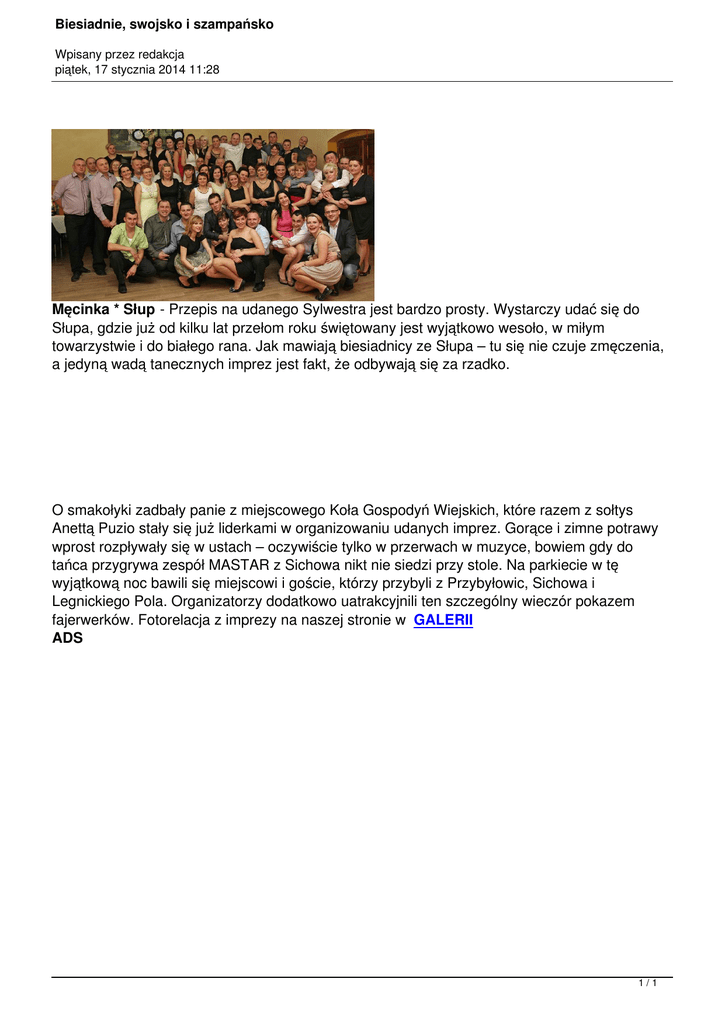 Biesiadnie, swojsko i szampańsko Wpisany przez redakcja piątek, 17 stycznia 2014 11:28 Męcinka * Słup - Przepis na udanego Sylwestra jest bardzo prosty. Wystarczy udać się do Słupa, gdzie już od kilku lat przełom roku świętowany jest wyjątkowo wesoło, w miłym towarzystwie i do białego rana. Jak mawiają biesiadnicy ze Słupa – tu się nie czuje zmęczenia, a jedyną wadą tanecznych imprez jest fakt, że odbywają się za rzadko. O smakołyki zadbały panie z miejscowego Koła Gospodyń Wiejskich, które razem z sołtys Anettą Puzio stały się już liderkami w organizowaniu udanych imprez. Gorące i zimne potrawy wprost rozpływały się w ustach – oczywiście tylko w przerwach w muzyce, bowiem gdy do tańca przygrywa zespół MASTAR z Sichowa nikt nie siedzi przy stole. Na parkiecie w tę wyjątkową noc bawili się miejscowi i goście, którzy przybyli z Przybyłowic, Sichowa i Legnickiego Pola. Organizatorzy dodatkowo uatrakcyjnili ten szczególny wieczór pokazem fajerwerków. Fotorelacja z imprezy na naszej stronie w GALERII ADS 1/1