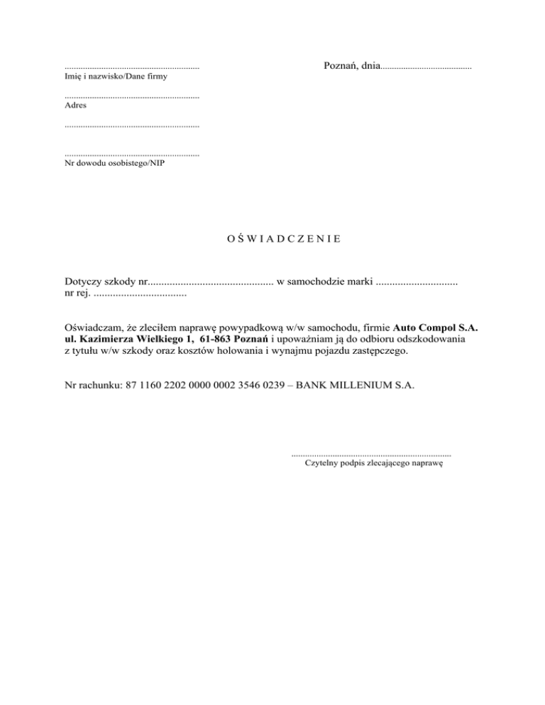 ........................................................... Imię i nazwisko/Dane firmy Poznań, dnia........................................ ........................................................... Adres ........................................................... ........................................................... Nr dowodu osobistego/NIP OŚWIADCZENIE Dotyczy szkody nr.............................................. w samochodzie marki .............................. nr rej. .................................. Oświadczam, że zleciłem naprawę powypadkową w/w samochodu, firmie Auto Compol S.A. ul. Kazimierza Wielkiego 1, 61-863 Poznań i upoważniam ją do odbioru odszkodowania z tytułu w/w szkody oraz kosztów holowania i wynajmu pojazdu zastępczego. Nr rachunku: 87 1160 2202 0000 0002 3546 0239 – BANK MILLENIUM S.A. ...................................................................... Czytelny podpis zlecającego naprawę