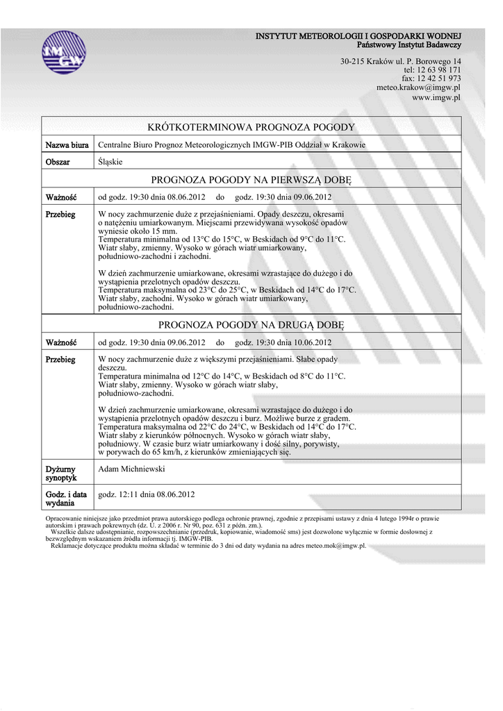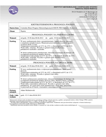 INSTYTUT METEOROLOGII I GOSPODARKI WODNEJ Państwowy Instytut Badawczy 30-215 Kraków ul. P. Borowego 14 tel: 12 63 98 171 fax: 12 42 51 973 [email protected] www.imgw.pl KRÓTKOTERMINOWA PROGNOZA POGODY Nazwa biura Centralne Biuro Prognoz Meteorologicznych IMGW-PIB Oddział w Krakowie Obszar Śląskie PROGNOZA POGODY NA PIERWSZĄ DOBĘ Ważność od godz. 19:30 dnia 08.06.2012 do godz. 19:30 dnia 09.06.2012 Przebieg W nocy zachmurzenie duże z przejaśnieniami. Opady deszczu, okresami o natężeniu umiarkowanym. Miejscami przewidywana wysokość opadów wyniesie około 15 mm. Temperatura minimalna od 13°C do 15°C, w Beskidach od 9°C do 11°C. Wiatr słaby, zmienny. Wysoko w górach wiatr umiarkowany, południowo-zachodni i zachodni. W dzień zachmurzenie umiarkowane, okresami wzrastające do dużego i do wystąpienia przelotnych opadów deszczu. Temperatura maksymalna od 23°C do 25°C, w Beskidach od 14°C do 17°C. Wiatr słaby, zachodni. Wysoko w górach wiatr umiarkowany, południowo-zachodni. PROGNOZA POGODY NA DRUGĄ DOBĘ Ważność od godz. 19:30 dnia 09.06.2012 do godz. 19:30 dnia 10.06.2012 Przebieg W nocy zachmurzenie duże z większymi przejaśnieniami. Słabe opady deszczu. Temperatura minimalna od 12°C do 14°C, w Beskidach od 8°C do 11°C. Wiatr słaby, zmienny. Wysoko w górach wiatr słaby, południowo-zachodni. W dzień zachmurzenie umiarkowane, okresami wzrastające do dużego i do wystąpienia przelotnych opadów deszczu i burz. Możliwe burze z gradem. Temperatura maksymalna od 22°C do 24°C, w Beskidach od 14°C do 17°C. Wiatr słaby z kierunków północnych. Wysoko w górach wiatr słaby, południowy. W czasie burz wiatr umiarkowany i dość silny, porywisty, w porywach do 65 km/h, z kierunków zmieniających się. Dyżurny synoptyk Adam Michniewski Godz. i data wydania godz. 12:11 dnia 08.06.2012 Opracowanie niniejsze jako przedmiot prawa autorskiego podlega ochronie prawnej, zgodnie z przepisami ustawy z dnia 4 lutego 1994r o prawie autorskim i prawach pokrewnych (dz. U. z 2006 r. Nr 90, poz. 631 z późn. zm.). Wszelkie dalsze udostępnianie, rozpowszechnianie (przedruk, kopiowanie, wiadomość sms) jest dozwolone wyłącznie w formie dosłownej z bezwzględnym wskazaniem źródła informacji tj. IMGW-PIB. Reklamacje dotyczące produktu można składać w terminie do 3 dni od daty wydania na adres [email protected].