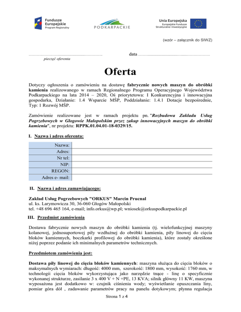 (wzór – załącznik do SIWZ) data ……….....................................…........………………… ……………………….................................…………….. pieczęć oferenta Oferta Dotyczy ogłoszenia o zamówieniu na dostawę fabrycznie nowych maszyn do obróbki kamienia realizowanego w ramach Regionalnego Programu Operacyjnego Województwa Podkarpackiego na lata 2014 – 2020, Oś priorytetowa: I Konkurencyjna i innowacyjna gospodarka, Działanie: 1.4 Wsparcie MŚP, Poddziałanie: 1.4.1 Dotacje bezpośrednie, Typ: 1 Rozwój MŚP. Zamówienie realizowane jest w ramach projektu pn. "Rozbudowa Zakładu Usług Pogrzebowych w Głogowie Małopolskim przez zakup innowacyjnych maszyn do obróbki kamienia", nr projektu: RPPK.01.04.01-18-0329/15. I. Nazwa i adres oferenta: Nazwa: Adres: Nr tel: NIP: REGON: Adres e- mail: II. Nazwa i adres zamawiającego: Zakład Usług Pogrzebowych "ORKUS" Marcin Prucnal ul. ks. Larymowicza 30, 36-060 Głogów Małopolski tel. +48 696 465 164, e-mail; [email protected]; [email protected] III. Przedmiot zamówienia Dostawa fabrycznie nowych maszyn do obróbki kamienia (tj. wielofunkcyjnej maszyny kolanowej, jednosuportowej piły wzdłużnej do obróbki kamienia, piły linowej do cięcia bloków kamiennych, boczkarki profilowej do obróbki kamienia), które zostały określone niżej poprzez podanie ich minimalnych parametrów technicznych. Przedmiotem zamówienia jest: Dostawa piły linowej do cięcia bloków kamiennych: maszyna służąca do cięcia bloków o maksymalnych wymiarach: długość: 4000 mm, szerokość: 1800 mm, wysokość: 1760 mm, w technologii cięcia bloków wykorzystująca jako narzędzie tnące - linę o specyficznie wykonanej strukturze, zasilanie 3 x 400 V + N +PE, 13 KVA; silnik główny 11 KW, maszyna wyposażona jest dodatkowo w: czujnik ciśnienia wody; wyświetlanie opuszczania liny, pomiar góra dół , zadawanie parametrów pracy na panelu dotykowym; płynna regulacja Strona 1 z 4 wysokości podajnika wody; kłonice do wózka zabezpieczające blok; kotwy do mocowania maszyny; wózek ze stołem obrotowym; tory dłuższe 6m; napęd kół do wózka. Dostawa boczkarki profilowej do obróbki kamienia: służąca do obróbki kamienia i posiada następujące parametry: długość obrabianego materiału 3 mb, grubość max.100mm, 1800 mm; szerokość: 2000 mm; długość: 3500 mm, maszyna wyposażona jest w: dodatkowy uchwyt 130; dodatkowy siłownik docisku płyty; dodatkowy zawór na każdy siłownik docisku płyty; bezpieczną zabudowę (ogrodzenie) stanowiska pracy. Dostawa wielofunkcyjnej maszyny kolanowej: zasilanie 3 x 400 V + N +PE; moc zasilania (max) - 12 kWA; silnik napędzający wrzeciono - 9.2 kW; silnik napędzający posuw pionowy - 0,7 kW; silnik napędzający posuw wzdłużny - 1,1 kW; ciśnienie w układzie pneumatycznym - 0,6 do 0,8 MPa; prędkość obrotowa wrzeciona - 150 do 10000 obr./min (regulacja płynna); posuw pionowy (oś Z) - do 500 mm; ruch oscylacyjny (oś Z) - do 200 mm; zużycie wody chłodzącej - 20-30 1/min; powierzchnia wózka stołu - 2000 X 1000 mm; posuw wózka stołu (oś X) - 2500 mm; długość maszyny - 3410mm; szerokość wraz ze stołem - 3620 mm; wysokość maszyny - 2030 mm; masa - 2500 kg. Dostawa jednosuportowej piły wzdłużnej do obróbki kamienia: maszyna służąca do cięcia i formatowania płyt o grubościach zależnie od średnicy dysku i mocy silnika głównego; pole pracy maszyny - 3000 x 3000 mm; posiada panel dotykowy do wybierania funkcji maszyny oraz wizualizacji procesów np. przesuwów w osiach X ,Y, Z i inne; wykonuje cięcie pojedyncze w cyklu automatycznym, posiada kontrolowane ruchy w osiach X , Y przez falownik. IV. Warunki gwarancyjne i serwisowe Minimalna gwarancja [miesiące] Maszyna piła linowa do cięcia bloków kamiennych 12 boczkarka profilowa do obróbki kamienia 12 wielofunkcyjna maszyna kolanowa 12 jednosuportowa piła wzdłużna do obróbki kamienia 12 Wartości średnie (Ofg - średnia liczba miesięcy gwarancji) 12 Oferowana gwarancja [miesiące] (wypełnić ww. pola) minimalna 12 miesięczna gwarancja, licząc od daty sporządzenia końcowego protokołu odbioru. naprawa i czas usunięcia uznanej usterki w czasie trwania okresu gwarancji, realizowana w terminie nie przekraczającym 14 dni od daty zgłoszenia reklamacji. V. Określenie oferowanej maszyny piła linowa do cięcia bloków kamiennych: …………………………………………………………………………………………………………………………………………….. (podać nazwę producenta, model, symbol oferowanej maszyny) Strona 2 z 4 boczkarka profilowa do obróbki kamienia: …………………………………………………………………………………………………………………………………………….. (podać nazwę producenta, model, symbol oferowanej maszyny) wielofunkcyjna maszyna kolanowa: …………………………………………………………………………………………………………………………………………….. (podać nazwę producenta, model, symbol oferowanej maszyny) jednosuportowa piła wzdłużna do obróbki kamienia: …………………………………………………………………………………………………………………………………………….. (podać nazwę producenta, model, symbol oferowanej maszyny) VI. Oświadczenia oferenta Oświadczam, że jestem uprawnionym do występowania w obrocie prawnym, zgodnie z wymaganiami ustawowymi, posiadam uprawnienia niezbędne do wykonania przedmiotu zamówienia, posiadam niezbędną wiedzę i doświadczenie, dysponuję potencjałem ekonomicznym i technicznym, a także pracownikami zdolnymi do wykonania zamówienia, znajduję się w dobrej sytuacji ekonomicznej i finansowej zapewniającej wykonanie zamówienia. Uprzedzony o odpowiedzialności karnej za fałszywe zeznania oświa