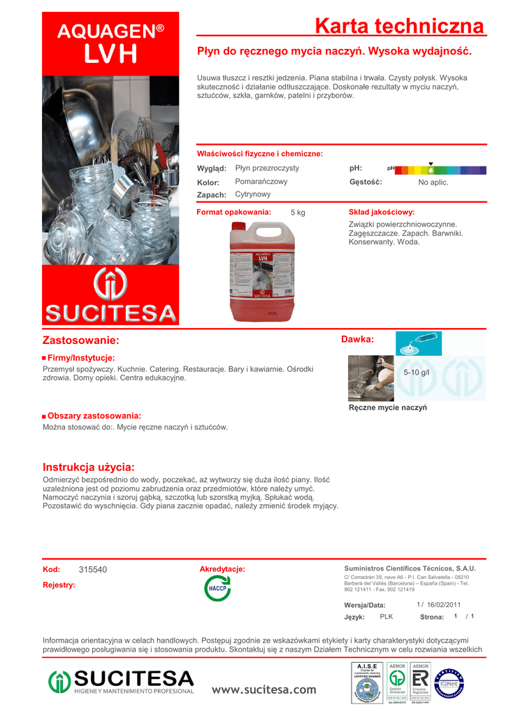 Karta techniczna Płyn do ręcznego mycia naczyń. Wysoka wydajność. Usuwa tłuszcz i resztki jedzenia. Piana stabilna i trwała. Czysty połysk. Wysoka skuteczność i działanie odtłuszczające. Doskonałe rezultaty w myciu naczyń, sztućców, szkła, garnków, patelni i przyborów. Właściwości fizyczne i chemiczne: Płyn przezroczysty pH: Kolor: Pomarańczowy Gęstość: Zapach: Cytrynowy Wygląd: Format opakowania: 5 kg No aplic. Skład jakościowy: Związki powierzchniowoczynne. Zagęszczacze. Zapach. Barwniki. Konserwanty. Woda. Dawka: Zastosowanie: Firmy/Instytucje: Przemysł spożywczy. Kuchnie. Catering. Restauracje. Bary i kawiarnie. Ośrodki zdrowia. Domy opieki. Centra edukacyjne. 5-10 g/l Ręczne mycie naczyń Obszary zastosowania: Można stosować do:. Mycie ręczne naczyń i sztućców. Instrukcja użycia: Odmierzyć bezpośrednio do wody, poczekać, aż wytworzy się duża ilość piany. Ilość uzależniona jest od poziomu zabrudzenia oraz przedmiotów, które należy umyć. Namoczyć naczynia i szoruj gąbką, szczotką lub szorstką myjką. Spłukać wodą. Pozostawić do wyschnięcia. Gdy piana zacznie opadać, należy zmienić środek myjący. Kod: 315540 Akredytacje: Suministros Científicos Técnicos, S.A.U. C/ Comadrán 39, nave A6 - P.I. Can Salvatella - 08210 Barberà del Vallés (Barcelona) – España (Spain) - Tel. 902 121411 - Fax. 902 121419 Rejestry: Wersja/Data: Język: PLK 1 / 16/02/2011 Strona: 1 / 1 Informacja orientacyjna w celach handlowych. Postępuj zgodnie ze wskazówkami etykiety i karty charakterystyki dotyczącymi prawidłowego posługiwania się i stosowania produktu. Skontaktuj się z naszym Działem Technicznym w celu rozwiania wszelkich www.sucitesa.com