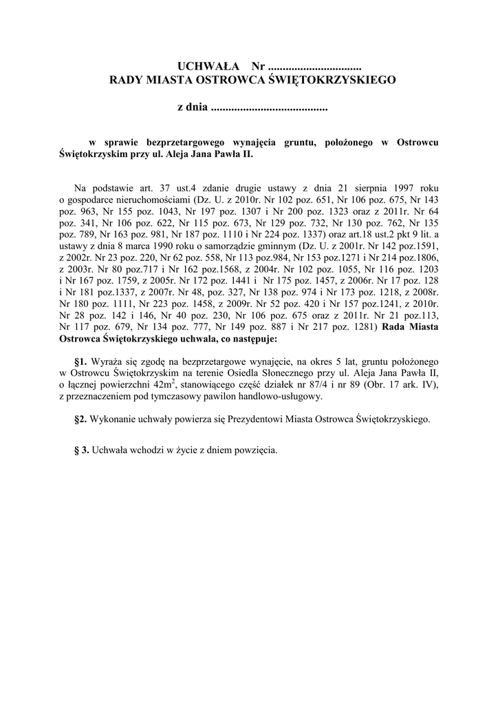 UCHWAŁA Nr ................................ RADY MIASTA OSTROWCA ŚWIĘTOKRZYSKIEGO z dnia ........................................ w sprawie bezprzetargowego wynajęcia gruntu, połoŜonego w Ostrowcu Świętokrzyskim przy ul. Aleja Jana Pawła II. Na podstawie art. 37 ust.4 zdanie drugie ustawy z dnia 21 sierpnia 1997 roku o gospodarce nieruchomościami (Dz. U. z 2010r. Nr 102 poz. 651, Nr 106 poz. 675, Nr 143 poz. 963, Nr 155 poz. 1043, Nr 197 poz. 1307 i Nr 200 poz. 1323 oraz z 2011r. Nr 64 poz. 341, Nr 106 poz. 622, Nr 115 poz. 673, Nr 129 poz. 732, Nr 130 poz. 762, Nr 135 poz. 789, Nr 163 poz. 981, Nr 187 poz. 1110 i Nr 224 poz. 1337) oraz art.18 ust.2 pkt 9 lit. a ustawy z dnia 8 marca 1990 roku o samorządzie gminnym (Dz. U. z 2001r. Nr 142 poz.1591, z 2002r. Nr 23 poz. 220, Nr 62 poz. 558, Nr 113 poz.984, Nr 153 poz.1271 i Nr 214 poz.1806, z 2003r. Nr 80 poz.717 i Nr 162 poz.1568, z 2004r. Nr 102 poz. 1055, Nr 116 poz. 1203 i Nr 167 poz. 1759, z 2005r. Nr 172 poz. 1441 i Nr 175 poz. 1457, z 2006r. Nr 17 poz. 128 i Nr 181 poz.1337, z 2007r. Nr 48, poz. 327, Nr 138 poz. 974 i Nr 173 poz. 1218, z 2008r. Nr 180 poz. 1111, Nr 223 poz. 1458, z 2009r. Nr 52 poz. 420 i Nr 157 poz.1241, z 2010r. Nr 28 poz. 142 i 146, Nr 40 poz. 230, Nr 106 poz. 675 oraz z 2011r. Nr 21 poz.113, Nr 117 poz. 679, Nr 134 poz. 777, Nr 149 poz. 887 i Nr 217 poz. 1281) Rada Miasta Ostrowca Świętokrzyskiego uchwala, co następuje: §1. WyraŜa się zgodę na bezprzetargowe wynajęcie, na okres 5 lat, gruntu połoŜonego w Ostrowcu Świętokrzyskim na terenie Osiedla Słonecznego przy ul. Aleja Jana Pawła II, o łącznej powierzchni 42m2, stanowiącego część działek nr 87/4 i nr 89 (Obr. 17 ark. IV), z przeznaczeniem pod tymczasowy pawilon handlowo-usługowy. §2. Wykonanie uchwały powierza się Prezydentowi Miasta Ostrowca Świętokrzyskiego. § 3. Uchwała wchodzi w Ŝycie z dniem powzięcia. UZASADNIENIE Gmina Ostrowiec Świętokrzyski jest właścicielem działek nr 87/4 i nr 89 (Obr. 17 ark. IV ) połoŜonych w Ostrowcu Świętokrzyskim na terenie Osiedla Słonecznego przy ul. Aleja Jana Pawła II, na części których usytuowany jest pawilon handlowo-usługowy. Grunt pod pawilonem wynajmowany był na rzecz właściciela pawilonu. Umowa najmu wygasła z dniem 31.12.2011 roku. W związku z wnioskiem o dalsze udostępnienie gruntu z przeznaczeniem pod tymczasowy pawilon handlowo-usługowy, proponuje się wynajęcie na wskazany cel gruntu Gminy na okres 5 lat. Zawarcie umowy wpłynie na realizację budŜetu Gminy z uwagi na pozyskiwanie dochodów poprzez wpływy z tytułu czynszu najmu i podatku od nieruchomości. W załączeniu przedkładamy stosowny projekt uchwały. Szczegółowe warunki najmu określone zostaną w umowie najmu.