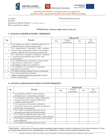 ROZWÓJ POTENCJAŁU DYDAKTYCZNO-NAUKOWEGO MŁODEJ KADRY AKADEMICKIEJ POLITECHNIKI WROCŁAWSKIEJ Uczelnia Wydział Doktorant/Młody Doktor1 ( podkreślić właściwe) Data wypełnienia ankiety Politechnika Wrocławska ……………………….. ………………………. UWAGA! Przy wybranej odpowiedzi zaznacz X. I. ANALIZA ADEKWATNOŚCI PROJEKTU Lp. Pytanie Odpowiedź Trudno Nie powiedzieć Tak Nie dotyczy Czy uważasz, że udział w projekcie pomoże Ci w realizacji Twoich potrzeb naukowych? Czy proponowany w projekcie okres wsparcia finansowego (stypendium) będzie wystarczający z punktu widzenia Twoich potrzeb naukowych? Czy dotychczas dostępne możliwości kontaktu z wybitnymi specjalistami spoza PWr były zadowalające? Czy zaproponowana w projekcie forma kursów zaproszonych profesorów ( wykład + konsultacje) wydaje Ci się właściwa ? Czy zakładasz, że uczestnictwo w projekcie przyniesie Ci korzyści? Czy Biuro Projektu spełnia Twoje oczekiwania? Czy strona internetowa projektu (http://doktoranci.pwr.wroc.pl/pokl/) spełnia Twoje oczekiwania? 1. 2. 3. 4. 5. 6. 7. II. ANALIZA ZAKŁADANYCH REZULTATÓW PROJEKTU Lp. 1. 2. 3. 4. 5. 6. 7. Pytanie Tak Odpowiedź Trudno Nie powiedzieć Nie dotyczy Czy planujesz udział w stażu naukowodydaktycznym w ramach tego projektu? Czy planujesz skorzystać z oferty edukacyjnej przygotowanej dla „interdyscyplinarnych studiów doktoranckich”? Czy zamierzasz skorzystać z wykładów i konsultacji naukowych wybitnych specjalistówprofesorów wizytujących? Czy udział w projekcie przyczyni się do przygotowania zgłoszenia patentowego? Czy udział w projekcie przyczyni się do przygotowania zgłoszenia wniosku o grant własny? Czy udział w projekcie przyczyni się do wydania innej publikacji? Czy udział w projekcie przyczyni się do 1 Młody doktor – należy przez to rozumieć osobę posiadającą stopień naukowy doktora nie dłużej niż 5 lat, która nie ukończy 35 roku życia przed zakończeniem okresu stypendialnego i jest zatrudniona w Uczelni na etacie naukowo-dydaktycznym PROJEKT WSPÓŁFINANSOWANY PRZEZ UNIĘ EUROPEJSKĄ W RAMACH EUROPEJSKIEGO FUNDUSZU SPOŁECZNEGO ROZWÓJ POTENCJAŁU DYDAKTYCZNO-NAUKOWEGO MŁODEJ KADRY AKADEMICKIEJ POLITECHNIKI WROCŁAWSKIEJ 8. 9. 10. 11 12 13 opracowania nowych metod badawczych lub zaprojektowania nowych urządzeń badawczych? Czy udział w projekcie przyczyni się do wydania monografii naukowej (rozprawy doktorskiej lub habilitacyjnej)? Jak oceniasz swoją sytuację materialną? Czy stypendium, które otrzymasz w projekcie poprawi Twoja sytuację materialną? Jak oceniasz propozycję oferty edukacyjnej? Czy w Twoim odczuciu wprowadzenie nowych kursów w ramach studiów interdyscyplinarnych da Ci podstawy do lepszej dalszej pracy naukowej? Na ile jesteś zadowolony z wybranej ścieżki kariery zawodowej. bardzo zła tak bardzo zła zła dobra nie zła tak bardzo niezadowolony niezadowolony zadowolony bardzo zadowolony dobra nie bardzo dobra nie dotyczy bardzo dobra nie dotyczy PROJEKT WSPÓŁFINANSOWANY PRZEZ UNIĘ EUROPEJSKĄ W RAMACH EUROPEJSKIEGO FUNDUSZU SPOŁECZNEGO