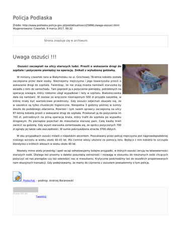 Policja Podlaska Źródło: http://www.podlaska.policja.gov.pl/pod/aktualnosci/25896,Uwaga-oszusci.html Wygenerowano: Czwartek, 9 marca 2017, 00:32 Strona znajduje się w archiwum. Uwaga oszuści !!! Oszuści zaczepiali na ulicy starszych ludzi. Prosili o wskazanie drogi do szpitala i pożyczenie pieniędzy na operację. Znikali z wyłudzoną gotówką. W miniony czwartek rano w Białymstoku na ul. Grochowej 78-letnia kobieta została zaczepiona przez dwie osoby. Nieznajomy mężczyzna i jego towarzyszka prosili o wskazanie drogi do szpitala. Twierdząc, że nie znają miasta namówili staruszkę by wsiadła z nimi do samochodu. Tam poprosili ją o pożyczenie pieniędzy, potrzebnych na operację szwagra, który rzekomo uległ wypadkowi i leży w szpitalu. Białostoczanka dała się namówić. W zastaw za wręczone nieznajomym 500 zł przyjęła saszetkę, w której miały być wartościowe przedmioty. Gdy oszuści odjechali okazało się, że w saszetce są tylko chusteczki higieniczne. Niespełna 3 godziny później w Łomży doszło do podobnego zdarzenia. Również i tym razem sprawcy zaczepioną na ulicy 87-letnią kobietę prosili o wskazanie drogi do szpitala. Przekonali ją do pożyczenia im 700 zł, potrzebnych na pilną operację brata, który trafił do szpitala po wypadku drogowym. Po pieniądze pojechali do mieszkania starszej pani. Całą kwotę mieli zwrócić za godzinę. Gdy wyszli staruszka zorientowała się, że oprócz pożyczonych 700 zł zginęły jej także całe oszczędności. W sumie pokrzywdzona straciła 3700 złotych. W obu przypadkach oszuści mówili z niepolskim akcentem. Poszukiwany przez policję mężczyzna jest najprawdopodobniej niskiego wzrostu w wieku około 40-45 lat. Ma ciemne włosy ułożone za pomocą żelu. Będąca z nim kobieta to szczupła blondynka o krótkich włosach w wieku około 40 lat. Niestety mimo wielu przestróg i apeli wciąż odnotowujemy kolejne przypadki, w których oszuści żerują na łatwowierności starszych osób. Dlatego też prosimy o daleko posuniętą ostrożność i rozwagę w stosunku do nieznanych osób chcących pożyczyć od nas pieniądze czy też odwiedzić nas w mieszkaniu. Krytycznie podchodźmy też do wszelkich proponowanych nam okazyjnych transakcji. Gdy podejrzewamy, że mamy do czynienia z oszustem powiadommy o tym policję. Posłuchaj - podinsp. Andrzej Baranowski Ocena: 0/5 (0) Tweetnij