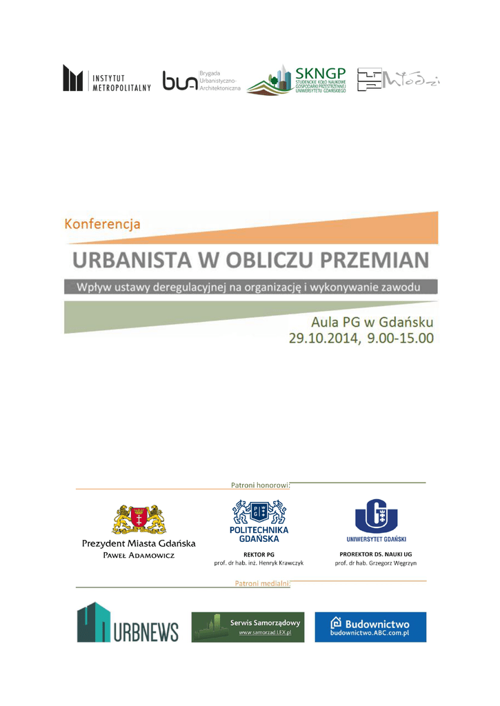 1 PRZEDMIOT________________________________________________________________________ Z inicjatywy rządu opracowany został projekt tzw. ustawy deregulacyjnej, który dotyczy m.in. zawodu urbanisty. Projekt ustawy zakłada likwidację samorządu zawodowego urbanistów, co może prowadzić do pauperyzacji samego zawodu, który wraz z wejściem w życie ustawy utraci status zawodu zaufania publicznego. Jednocześnie otworzy to dostęp do zawodu, likwidując wymóg odbycia dodatkowych praktyk. W obliczu rosnącej prywatyzacji i delegacji realizacji zadań administracji publicznej, w tym planowania przestrzennego, deregulacja budzi pytania o formułę wykonywania zawodu. Pytanie dotyczy zwłaszcza mechanizmów zabezpieczenia standardów jakościowych jego wykonywania, mechanizmów dyscyplinarnych i ochrony interesów zawodowych (np. wycen i kosztów wykonania opracowań i zwalczania dumpingu cenowego). Są to istotne zmiany, do których należy się odnieść. Osoby wykonujące zawód urbanisty będą musiały się odnaleźć w nowych uwarunkowaniach prawnych. Wejście w życie ustawy deregulacyjnej oznacza bowiem uchylenie obowiązujących dotychczas przepisów prawa administracyjnego i zastąpienie ich – co jest naturalną konsekwencją powyższej reformy – przepisami prawa prywatnego (cywilnego). Tym samym to przepisy prawa prywatnego staną się źródłem regulacji tak organizacji/zrzeszeń urbanistów, jak i zasad wykonywania tego zawodu. Konferencja pozwoli na przyjrzenie się możliwym modelom dalszego działania i umożliwi analizę ich konsekwencji - np. regulacji zawodu/certyfikacji jakościowej przez prywatne podmioty takie jak stowarzyszenia zrzeszające urbanistów. Pojawi się także bardzo istotne zagadnienie wpływu omawianych zmian na proces planistyczny w Polsce. UCZESTNICTWO_____________________________________________________________________ Konferencja jest otwarta i bezpłatna. Każda osoba zainteresowana – po uprzednim zgłoszeniu koordynatorowi zamiaru udziału w konferencji – może wziąć w niej udział. RAMOWA STRUKTURA_______________________________________________________________ 29 października 2014 r., środa Aula Politechniki Gdańskiej, Gmach Główny PG Gdańsk, ul. Narutowicza 11/12 9.00-9.30 – otwarcie konferencji i powitanie gości 9.30-10.00 – wykład inauguracyjny 10.00-11.45 – panel dyskusyjny: „Samorząd zawodowy urbanistów – refleksje po deregulacji” 11.45-12.00 – przerwa kawowa 12.00-13.45 – panel dyskusyjny: „Urbanista w nowych realiach – samoorganizacja, prywatyzacja i wpływ na otoczenie” 13.45-14.00 – przerwa kawowa 14.00-15.00 – podsumowanie konferencji 2 PUBLIKACJA________________________________________________________________________ Planowane jest wydanie publikacji pokonferencyjnej. Publikacja ta przybierze postać specjalnego numeru periodyku „Metropolitan”. Zostaną w niej opublikowane wywiady, artykułu i komunikaty uczestników konferencji. Szczegółowe informacje w tej sprawie zostaną przesłane pocztą elektroniczną. ORGANIZATORZY PROJEKTU___________________________________________________________ Organizatorami konferencji są cztery trójmiejskie organizacje, które zajmują się w swej działalności m.in. tematyką zagospodarowania przestrzennego: Instytut Metropolitalny, Brygada UrbanistycznoArchitektoniczna, SKN Gospodarki Przestrzennej UG oraz Koło Studenckie TUP Młodzi: Instytut Metropolitalny to organizacja ekspercka (think tank) integrująca reprezentantów różnych dyscyplin naukowych (prawa, administracji, urbanistyki), jak i profesji (prawników, urzędników) i pasji (działaczy społecznych, wolontariuszy). Jest to fundacja, organizacja pozarządowa i pozasamorządowa, której przyznano status organizacji pożytku publicznego. Prowadzi badania podstawowe i prace koncepcyjne w zakresie spraw metropolitalnych (polityk miejskich, systemów zarządzania, gospodarki przestrzennej). Brygada Urbanistyczno-Architektoniczna to grupa studentów zaangażowanych w kreację przestrzeni miejskiej. BUA przygotowuje projekty koncepcyjne, lansując ideę projektowania partycypacyjnego. Członkowie BUA w swej działalności wykorzystują wykształcenie architektoniczne i urbanistyczne. Studenckie Koło Naukowe Gospodarki Przestrzennej UG to organizacja działająca przy Instytucie Geografii UG, która skupia studentów szczególnie zainteresowanych m.in. tematyką planowania przestrzennego, urbanistyki, architektury krajobrazu, regionalistyki czy marketingu miejskiego. Do zadań Koła należy m.in. organizacja i udział w seminariach, konferencjach czy obozach naukowych, a także podejmowanie prac naukowo-badawczych i działalności popularyzatorskiej. Koło Studenckie TUP Młodzi to organizacja działająca pod patronatem Towarzystwa Urbanistów Polskich, zrzeszająca głównie studentów zainteresowanych tematyką planowania przestrzennego w szerokim znaczeniu, formami efektywnego zarządzania przestrzenią, mediacją społeczną oraz modelami planowania w różnych krajach. Członkowie Koła są zaangażowani w różne akcje oddolne, ruchy miejskie, jak również prowadzą czynną działalność seminaryjno-naukową. KONTAKT__________________________________________________________________________ Koordynator: Damian Zelewski (Instytut Metropolitalny) T: +48 514 372 055 M: [email protected] 3