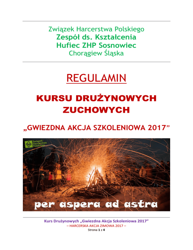 Związek Harcerstwa Polskiego Zespół ds. Kształcenia Hufiec ZHP Sosnowiec Chorągiew Śląska REGULAMIN KURSU DRUŻYNOWYCH ZUCHOWYCH „GWIEZDNA AKCJA SZKOLENIOWA 2017” Kurs Drużynowych „Gwiezdna Akcja Szkoleniowa 2017” – HARCERSKA AKCJA ZIMOWA 2017 – Strona 1 z 4 KURS DRUŻYNOWYCH ZUCHOWYCH „Gwiezdna Akcja Szkoleniowa 2017” Terminy: Termin rozpoczęcia: 13 Styczeń, 2017 - 18:00 Termin zakończenia: 19 Styczeń, 2017 - 15:00 Zgłoszenia do: 30 Listopad, 2016 (Cały dzień) Komendant: hm. Ariana Bejma-Woźniczka HR BOKK 715/2014 Organizator: HZKK Dąbrowa Górnicza, Mysłowice, Sosnowiec Miejsce: HBO Hufca Rybnik w Wapienicy Odpłatność: 600,00 zł Uczestnicy: członkowie ZHP, którzy ukończyli kurs przewodnikowski lub posiadają stopień przewodnika. Ukończone 16 lat (rocznikowo) Opis: W cenę wliczono: 1. 3 posiłki dziennie. 2. Nocleg. 3. Materiały programowe. 4. Ubezpieczenie NNW. 5. Zajęcia prowadzone przez wykwalifikowaną kadrę instruktorską, specjalistów z danych metodyk. 6. Wycieczka na Szyndzielnię (kolejka). 7. Tor saneczkowy. 8. Plakietka. Kurs Drużynowych „Gwiezdna Akcja Szkoleniowa 2017” – HARCERSKA AKCJA ZIMOWA 2017 – Strona 2 z 4 KOMENDANT Komendant kursu - hm. Ariana Bejma-Woźniczka Komendant formy kształceniowej: hm. Anna Gandyk-Piszczek - BOKK 725/2014 Zajęcia prowadzone są przez wieloletnich instruktorów , którzy powadzą swoje jednostki w hufcach Dąbrowa Górnicza, Mysłowice i Sosnowiec. ZGŁOSZENIA Zgłoszenie + skan karty uczestnika na adres mailowy [email protected] do dn. 30-11-2016 r. oraz wpłaty za kurs na konto: Hufiec ZHP Mysłowice 40 1240 4315 1111 0000 5302 4798 z dopiskiem: dodatkowa składka zadaniowa kurs drużynowych zuchowych - (imię i nazwisko) WARUNKI UCZESTNICTWA do pobrania: https://www.dropbox.com/s/b2owppbotas2dcj/HAZ-2017-Warunki-uczestnictwa_KURSANT.pdf?dl=0# Terminy: 1) Przesłanie zgłoszenia + skanu karty uczestnika do dnia 30.11.2016r. ( na adres [email protected] ) 2) Zadatek w wysokości 100,00 płatny do dnia 30.11.2016 3) Pozostała wpłata do dnia 31.12.2016 4) Przesłanie oryginałów karty i zgłoszenia do dnia 10.12.2016 na adres Hufca Mysłowice: Komenda Hufca Mysłowice ul. Mikołowska 3 41-400 Mysłowice lub osobiście na dyżur w każdą środę w godzinach 18:00-20:00 Kurs Drużynowych „Gwiezdna Akcja Szkoleniowa 2017” – HARCERSKA AKCJA ZIMOWA 2017 – Strona 3 z 4 UCZESTNICY Uczestnikiem kursu może zostać osoba, która: 1) jest członkiem ZHP (ma opłacone składki członkowskie oraz wpis do systemu ewidencji ZHP), 2) ukończyła kurs przewodnikowski lub posiada stopień przewodnika, 3) ukończyła 16 rok życia (rocznikowo), 4) dokonała terminowego zgłoszenia i odpłatności za kurs, 5) posiada pozytywną opinię komendanta hufca na udział w kursie. 6) posiada wypełnioną kartę uczestnika zimowiska. Opinię komendanta (wydrukowaną i podpisaną) należy zabrać ze sobą na kurs. ZASADY ZALICZENIA KURSU 1) Aktywny udział w zajęciach 2) Prezentowanie postawy instruktorskiej 3) Przygotowanie zadań zleconych przez komendę – przed i w trakcie kursu 4) Uzyskanie pozytywnej opinii komendy kursu W związku z tym, że jest to kurs łączony (metodyka zuchowa i harcerska) łączna ilość osób to 40. w imieniu Międzyhufcowej Koalicji ds. Kształcenia: hm. Ariana Bejma – Woźniczka Przewodnicząca HZKK Dąbrowa Górnicza hm. Anna Gandyk - Piszczek Przewodnicząca HZK Mysłowice phm. Tomasz Paweł Bujarski Przewodniczący HZK Sosnowiec Kurs Drużynowych „Gwiezdna Akcja Szkoleniowa 2017” – HARCERSKA AKCJA ZIMOWA 2017 – Strona 4 z 4