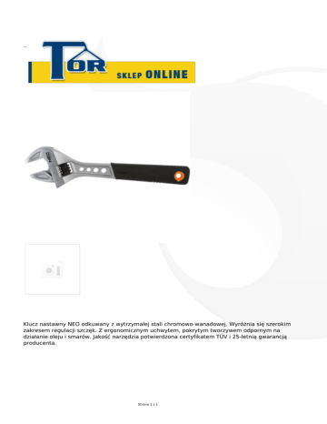 Klucz nastawny NEO odkuwany z wytrzymałej stali chromowo-wanadowej. Wyróżnia się szerokim zakresem regulacji szczęk. Z ergonomicznym uchwytem, pokrytym tworzywem odpornym na działanie oleju i smarów. Jakość narzędzia potwierdzona certyfikatem TÜV i 25-letnią gwarancją producenta. Strona 1 z 1