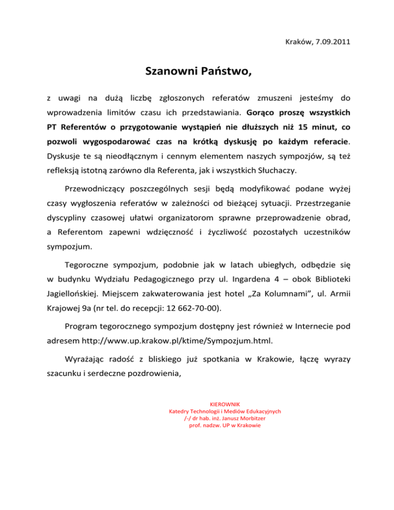 Kraków, 7.09.2011 Szanowni Paostwo, z uwagi na dużą liczbę zgłoszonych referatów zmuszeni jesteśmy do wprowadzenia limitów czasu ich przedstawiania. Gorąco proszę wszystkich PT Referentów o przygotowanie wystąpieo nie dłuższych niż 15 minut, co pozwoli wygospodarować czas na krótką dyskusję po każdym referacie. Dyskusje te są nieodłącznym i cennym elementem naszych sympozjów, są też refleksją istotną zarówno dla Referenta, jak i wszystkich Słuchaczy. Przewodniczący poszczególnych sesji będą modyfikowad podane wyżej czasy wygłoszenia referatów w zależności od bieżącej sytuacji. Przestrzeganie dyscypliny czasowej ułatwi organizatorom sprawne przeprowadzenie obrad, a Referentom zapewni wdzięcznośd i życzliwośd pozostałych uczestników sympozjum. Tegoroczne sympozjum, podobnie jak w latach ubiegłych, odbędzie się w budynku Wydziału Pedagogicznego przy ul. Ingardena 4 – obok Biblioteki Jagiellooskiej. Miejscem zakwaterowania jest hotel „Za Kolumnami”, ul. Armii Krajowej 9a (nr tel. do recepcji: 12 662-70-00). Program tegorocznego sympozjum dostępny jest również w Internecie pod adresem http://www.up.krakow.pl/ktime/Sympozjum.html. Wyrażając radośd z bliskiego już spotkania w Krakowie, łączę wyrazy szacunku i serdeczne pozdrowienia, KIEROWNIK Katedry Technologii i Mediów Edukacyjnych /-/ dr hab. inż. Janusz Morbitzer prof. nadzw. UP w Krakowie Szanowni Paostwo, przekazujemy aktualną informację o możliwościach dotarcia z Dworca Głównego PKP do miejsca obrad i hotelu. Dojazd z Dworca Głównego PKP do miejsca obrad ul. Ingardena 4 – z przystanku Dworzec Główny (skrzyżowanie ul. Lubicz z ul. Basztową) tramwaje nr 15 (kierunek: Cichy Kącik, wysiadad przy ul. Oleandry) lub autobus nr 152 (kierunek: Olszanica, wysiadad przy hotelu „Cracovia”). Dojazd z Dworca Głównego PKP do miejsca zakwaterowania – tramwaje linii 4 lub 20 (z przystanku Dworzec Główny na skrzyżowaniu ul. Lubicz z ul. Basztową), tramwaje linii 13 lub 24 (z przystanku Dworzec Główny na ul. Westerplatte) – kierunek: Bronowice Nowe, przesiadka przy Pl. Inwalidów na autobus nr 139 (kierunek: Mydlniki /Bronowice Małe/, wysiadad przy ul. Armii Krajowej) lub na autobus nr 501 (kierunek: Mydlniki, wysiadad przy ul. Armii Krajowej). Dojazd z miejsca zakwaterowania do miejsca obrad ul. Ingardena 4 – z przystanku Armii Krajowej autobus nr 173 (kierunek: Bieżanów Nowy, wysiadad na przystanku AGH). Informacja o komunikacji MPK w Krakowie dostępna jest pod adresem http://www.mpk.krakow.pl/ lub tel. 12 19150 (czynny całą dobę). Radio-Taxi – tel. 12 19629, 12 19622 lub 12 19688 – orientacyjny koszt przejazdu do hotelu – 25-35 zł. Prosimy nie korzystad z usług przewoźników występujących jako „przewóz osób”, nie oznaczonych znakiem „taxi”.