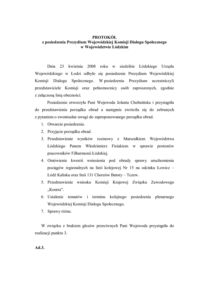 PROTOKÓŁ z posiedzenia Prezydium Wojewódzkiej Komisji Dialogu Społecznego w Województwie Łódzkim Dnia 23 kwietnia 2008 roku w siedzibie Łódzkiego Urzędu Wojewódzkiego w Łodzi odbyło się posiedzenie Prezydium Wojewódzkiej Komisji Dialogu Społecznego. W posiedzeniu Prezydium uczestniczyli przedstawiciele Komisji oraz pełnomocnicy osób zaproszonych, zgodnie z załączoną listą obecności. Posiedzenie otworzyła Pani Wojewoda Jolanta Chełmińska i przystąpiła do przedstawienia porządku obrad a następnie zwróciła się do zebranych z pytaniem o ewentualne uwagi do zaproponowanego porządku obrad. 1. Otwarcie posiedzenia. 2. Przyjęcie porządku obrad. 3. Przedstawienie Łódzkiego wyników Panem rozmowy z Włodzimierz Marszałkiem Fisiakiem w Województwa sprawie protestów pracowników Filharmonii Łódzkiej. 4. Omówienie kwestii wniesienia pod obrady sprawy uruchomienia pociągów regionalnych na linii kolejowej Nr 15 na odcinku Łowicz – Łódź Kaliska oraz linii 131 Chorzów Batory – Tczew. 5. Przedstawienie wniosku Komisji Krajowej Związku Zawodowego „Kontra”. 6. Ustalenie tematów i terminu kolejnego posiedzenia plenarnego Wojewódzkiej Komisji Dialogu Społecznego. 7. Sprawy różne. W związku z brakiem głosów przeciwnych Pani Wojewoda przystąpiła do realizacji punktu 3. Ad.3. Pani Wojewoda Jolanta Chełmińska przystąpiła do realizacji punktu trzeciego porządku obrad informując zebranych o wynikach spotkania, które odbyło się 22 kwietnia br. z Marszałkiem Województwa Łódzkiego Włodzimierzem Fisiakiem oraz z przedstawicielami orkiestry Filharmonii Łódzkiej. Pan Marszałek podczas rozmowy stwierdził, że nie może ręcznie sterować Filharmonia Łódzką i wchodzić w kompetencje dyrektora placówki. Jest prawdopodobne, że Pan Wojciechowski odejdzie pod koniec sezonu, natomiast Dyrektor Filharmonii Pan Andrzej Sułek z determinacją stoi na stanowisku, że przesłuchanie powinno się odbyć. Pani Wojewoda Jolanta Chełmińska podczas spotkania zasugerowała by przesłuchania członków zespołu zostały przesunięte na czas powołania nowego dyrektora artystycznego Filharmonii Łódzkiej. Natomiast Pan Marszałek popiera działania podejmowane przez Dyrektora Filharmonii, który pragnie powołać komisję oceniającą składającą się m.in. z prof. Antoniego Wierzbińskiego Rektora Akademii Muzycznej im. G. i K. Bacewiczów w Łodzi, oraz osób spoza Łodzi. Obecni na spotkaniu byli również koncertmistrze, którzy mówili o konfliktach występujących w innych orkiestrach, które prowadził Pan Tadeusz Wojciechowski oraz o programie przesłuchania muzyków, który nie uwzględnia roli, jaką poszczególni muzycy pełnią w zespole. Np. pierwsze skrzypce mają grać partie drugich skrzypiec, itp., nie odzwierciedli to faktycznych kompetencji muzyków. Spotkanie to nie przyniosło żadnych rezultatów. Pan Andrzej Sułek Dyrektor Filharmonii jest bardzo zdeterminowany by przeprowadzić przesłuchanie, natomiast muzycy stwierdzili, że mają już poparcia z innych zespołów m.in. zagranicznych. Pani Wojewoda stwierdziła, że wszystko, co mogła zrobić w tej sprawie zostało już zrobione. Dalej nadmieniła, że jak poinformował Pan Marszałek Pan Tadeusz Wojciechowski był zaakceptowany i wybierany w sposób uzgodniony z zespołem, nie był osobą narzuconą. Pani Edyta Sancewicz nadmieniła, że przyjęcie Pana Andrzeja Sułka, bez konkursu, na stanowisko dyrektora naczelnego Filharmonii Łódzkiej wiązało się z odejściem i problemami pozostawionymi przez Pana Zbigniewa Lasockiego byłego dyrektora naczelnego Filharmonii Łódzkiej. Jakkolwiek, Pan Marszałek zanim zaangażował obecnego dyrektora naczelnego konsultował tę kandydaturę z zespołem, który poparł tę propozycję. Pani Wojewoda dodała, że przesłuchania orkiestry Filharmonii Łódzkiej mają się odbywać w drugiej połowie maja br. Nadmieniła, że w chwili obecnej sytuacja jest bardzo trudna i wykracza poza kompetencje Wojewody. Członkowie orkiestry oczekują, że przesłuchanie będzie prowadzić dyrektor artystyczny, odpowiadający za poziom orkiestry. Nie może to jednak być Pan Tadeusz Wojciechwski, z którym muzycy są w konflikcie. Pani Edyta Sancewicz stwierdziła, ze nie ma zapisu formalnego obligującego Filharmonię Łódzka do angażowania dyrektora artystycznego. Urząd Marszałkowski w Łodzi jest organem założycielskim dla wielu placówek, ale są to jednostki autonomiczne, przedsiębiorstwa, które posiadają własnego managera. Dalej dodała, że były dyrektor naczelny Filharmoni Łódzkiej Pan Tadeusz Lasocki został odwołany na wniosek samych muzyków, w chwili obecnej należy wykazać wstrzemięźliwość w ocenie, a nowemu dyrektorowi naczelnemu należy dać czas na ułożenie zespołu zgodnie ze swoimi oczekiwaniami. Jeżeli warunkiem dobrego funkcjonowania orkiestry jest przeprowadzenie przesłuchania muzyków to powinno się ono odbyć. Pani Beata Ostrowska zwróciła się z pytaniem do Pani Edyty Sancewicz dlaczego konflikt nie był rozwiązywany na bieżąco, lecz dopuszczono do jego eskalacji. Pani Edyta Sancewicz nadmieniła, że we wrześniu br. minie rok odkąd Pan Andrzej Sułek jest dyrektorem naczelnym Filharmonii Łódzkiej i musiał mieć czas na poznanie instytucji oraz ocenę pracowników. Rok temu, gdy odwoływany był Pan Zbigniew Lasocki nie wpłynął żaden sprzeciw na kandydaturę Pana Andrzeja Sułka, pomimo iż padło pytanie dot. zarządzania Filharmonią. Dalej Pani Edyta Sancewicz nadmieniła, że miała okazję być z orkiestrą Filharmonii Łódzkiej w Brukseli, kiedy to orkiestra ta pod batutą Pana Tadeusza Wojciechowskiego dała niezwykły koncert z okazji 120 rocznicy urodzin Artura Rubinsteina. Wtedy też muzycy byli zachwyceni pracą Pana Tadeusza Wojciechowskiego. Należy zrobić wszystko by Łódź miała świetna operę i najlepszych filharmoników. Pan Waldemar Krec nadmienił, że zd