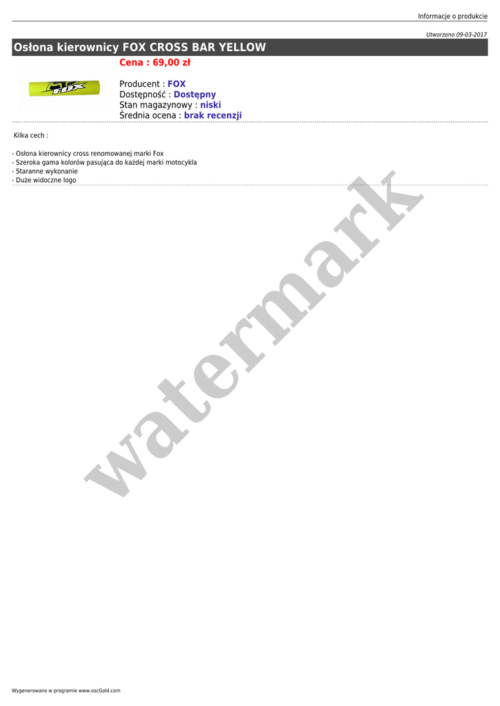 Informacje o produkcie Utworzono 09-03-2017 Osłona kierownicy FOX CROSS BAR YELLOW Cena : 69,00 zł Producent : FOX Dostępność : Dostępny Stan magazynowy : niski Średnia ocena : brak recenzji Kilka cech : w at er m ar k - Osłona kierownicy cross renomowanej marki Fox - Szeroka gama kolorów pasująca do każdej marki motocykla - Staranne wykonanie - Duże widoczne logo Wygenerowano w programie www.oscGold.com