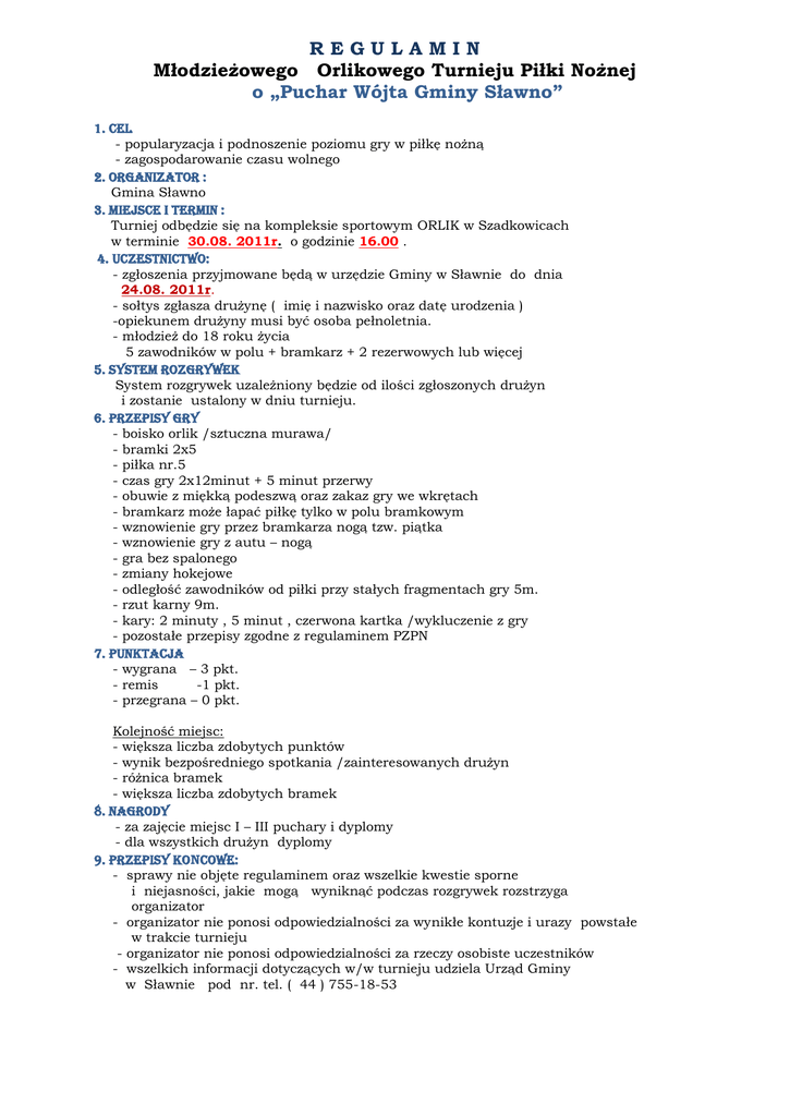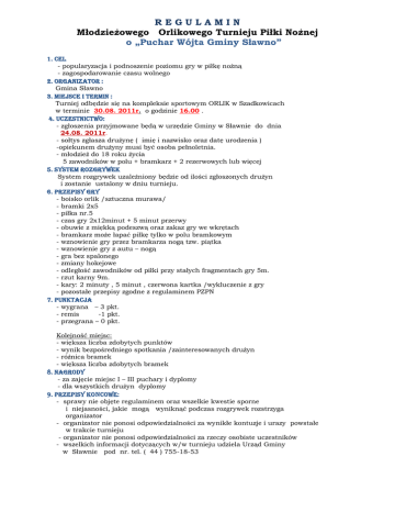 REGULAMIN Młodzieżowego Orlikowego Turnieju Piłki Nożnej o „Puchar Wójta Gminy Sławno” 1. Cel - popularyzacja i podnoszenie poziomu gry w piłkę nożną - zagospodarowanie czasu wolnego 2. Organizator : Gmina Sławno 3. Miejsce i termin : Turniej odbędzie się na kompleksie sportowym ORLIK w Szadkowicach w terminie 30.08. 2011r. o godzinie 16.00 . 4. Uczestnictwo: - zgłoszenia przyjmowane będą w urzędzie Gminy w Sławnie do dnia 24.08. 2011r. - sołtys zgłasza drużynę ( imię i nazwisko oraz datę urodzenia ) -opiekunem drużyny musi być osoba pełnoletnia. - młodzież do 18 roku życia 5 zawodników w polu + bramkarz + 2 rezerwowych lub więcej 5. System rozgrywek System rozgrywek uzależniony będzie od ilości zgłoszonych drużyn i zostanie ustalony w dniu turnieju. 6. Przepisy gry - boisko orlik /sztuczna murawa/ - bramki 2x5 - piłka nr.5 - czas gry 2x12minut + 5 minut przerwy - obuwie z miękką podeszwą oraz zakaz gry we wkrętach - bramkarz może łapać piłkę tylko w polu bramkowym - wznowienie gry przez bramkarza nogą tzw. piątka - wznowienie gry z autu – nogą - gra bez spalonego - zmiany hokejowe - odległość zawodników od piłki przy stałych fragmentach gry 5m. - rzut karny 9m. - kary: 2 minuty , 5 minut , czerwona kartka /wykluczenie z gry - pozostałe przepisy zgodne z regulaminem PZPN 7. Punktacja - wygrana – 3 pkt. - remis -1 pkt. - przegrana – 0 pkt. Kolejność miejsc: - większa liczba zdobytych punktów - wynik bezpośredniego spotkania /zainteresowanych drużyn - różnica bramek - większa liczba zdobytych bramek 8. Nagrody - za zajęcie miejsc I – III puchary i dyplomy - dla wszystkich drużyn dyplomy 9. Przepisy koNcowe: - sprawy nie objęte regulaminem oraz wszelkie kwestie sporne i niejasności, jakie mogą wyniknąć podczas rozgrywek rozstrzyga organizator - organizator nie ponosi odpowiedzialności za wynikłe kontuzje i urazy powstałe w trakcie turnieju - organizator nie ponosi odpowiedzialności za rzeczy osobiste uczestników - wszelkich informacji dotyczących w/w turnieju udziela Urząd Gminy w Sławnie pod nr. tel. ( 44 ) 755-18-53 KARTA ZGŁOSZENIA Drużyny ……………………………………………………………………..do Młodzieżowego Orlikowego Turnieju Piłki Nożnej „ O Puchar Wójta Gminy Sławno”, który odbędzie się w dniu 30 sierpnia 2011 r. na Kompleksie Boisk Sportowych „ORLIK” w Szadkowicach Lp. Imię i nazwisko Data urodzenia Miejsce zamieszkania 1. 2. 3. 4. 5. 6. 7. 8. Kapitan drużyny ……………………………………………………………………. telefon kontaktowy ……………………………………………………………… Poświadczam, iż w/w zawodnicy są mieszkaocami sołectwa …………………………....................... ________________________________ ( data, podpis sołtysa)