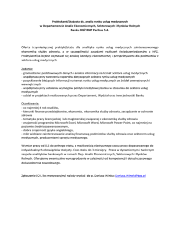 Praktykant/Stażysta ds. analiz rynku usług medycznych w Departamencie Analiz Ekonomicznych, Sektorowych i Rynków Rolnych Banku BGŻ BNP Paribas S.A. Oferta trzymiesięcznej praktyki/stażu dla analityka rynku usług medycznych zainteresowanego ekonomiką służby zdrowia, a w szczególności zasadami rozliczeń świadczeniodawców z NFZ. Praktykant\ka będzie zajmował się analizą kondycji ekonomicznej i perspektywami dla podmiotów z sektora usług medycznych. Zadania: - gromadzenie podstawowych danych i analiza informacji na temat sektora usług medycznych - współpraca przy tworzeniu raportów dotyczących sektora rynku usług medycznych - pozyskiwanie bieżących informacji na temat rynku usług medycznych ze źródeł zewnętrznych i wewnętrznych - współpraca przy ustalaniu wymogów polityki kredytowej banku w stosunku do sektora usług medycznych - udział w projektach realizowanych przez Departament, Wydział oraz inne jednostki Banku Oczekiwania: - co najmniej 4 rok studiów, - kierunki finanse przedsiębiorstw, ekonomia, ekonomika służby zdrowia, zarządzanie w ochronie zdrowia - tematyka pracy licencjackiej lub magisterskiej związanej z ekonomiką służby zdrowia - znajomość programów Microsoft Excel, Microsoft Word, Microsoft Power Point, co najmniej na poziomie średniozaawansowanym, - dobra znajomość języka angielskiego, - mile widziane zainteresowanie analizą finansową podmiotów służby zdrowia oraz sektorem usług medycznych, producentami sprzętu medycznego. Wymiar pracy od 0,5 do pełnego etatu, z możliwością elastycznego czasu pracy dopasowanego do indywidualnych obowiązków stażysty. Czas stażu do 3 miesięcy. Praca w dynamicznym i twórczym zespole analityków bankowych w ramach Dep. Analiz Ekonomicznych, Sektorowych i Rynków Rolnych. Oferujemy ewentualne wynagrodzenie w zależności od kompetencji i dotychczasowego doświadczenia zawodowego. Zgłoszenie (CV, list motywacyjny) należy wysłać do p. Dariusz Winka: [email protected]