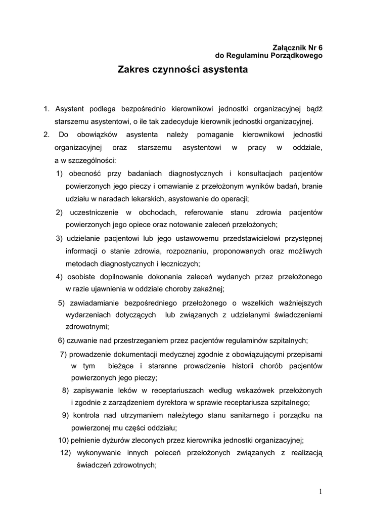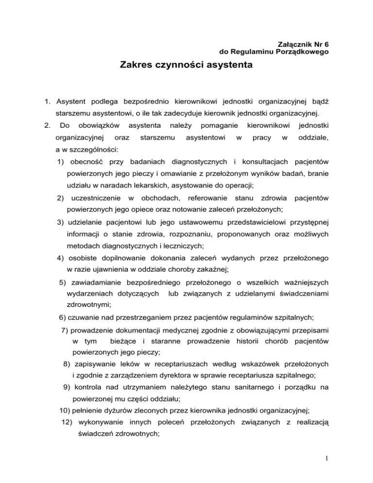 Załącznik Nr 6 do Regulaminu Porządkowego Zakres czynności asystenta 1. Asystent podlega bezpośrednio kierownikowi jednostki organizacyjnej bądź starszemu asystentowi, o ile tak zadecyduje kierownik jednostki organizacyjnej. 2. Do obowiązków organizacyjnej asystenta oraz należy starszemu pomaganie asystentowi w kierownikowi pracy w jednostki oddziale, a w szczególności: 1) obecność przy badaniach diagnostycznych i konsultacjach pacjentów powierzonych jego pieczy i omawianie z przełożonym wyników badań, branie udziału w naradach lekarskich, asystowanie do operacji; 2) uczestniczenie w obchodach, referowanie stanu zdrowia pacjentów powierzonych jego opiece oraz notowanie zaleceń przełożonych; 3) udzielanie pacjentowi lub jego ustawowemu przedstawicielowi przystępnej informacji o stanie zdrowia, rozpoznaniu, proponowanych oraz możliwych metodach diagnostycznych i leczniczych; 4) osobiste dopilnowanie dokonania zaleceń wydanych przez przełożonego w razie ujawnienia w oddziale choroby zakaźnej; 5) zawiadamianie bezpośredniego przełożonego o wszelkich ważniejszych wydarzeniach dotyczących lub związanych z udzielanymi świadczeniami zdrowotnymi; 6) czuwanie nad przestrzeganiem przez pacjentów regulaminów szpitalnych; 7) prowadzenie dokumentacji medycznej zgodnie z obowiązującymi przepisami w tym bieżące i staranne prowadzenie historii chorób pacjentów powierzonych jego pieczy; 8) zapisywanie leków w receptariuszach według wskazówek przełożonych i zgodnie z zarządzeniem dyrektora w sprawie receptariusza szpitalnego; 9) kontrola nad utrzymaniem należytego stanu sanitarnego i porządku na powierzonej mu części oddziału; 10) pełnienie dyżurów zleconych przez kierownika jednostki organizacyjnej; 12) wykonywanie innych poleceń przełożonych związanych z realizacją świadczeń zdrowotnych; 1 3. Asystentowi nie wolno zmienić zaleconego przez ordynatora sposobu leczenia z wyjątkiem wypadku , gdy w przebiegu choroby wystąpiły okoliczności wymagające natychmiastowej zmiany ordynacji, a porozumienie się z ordynatorem lub starszym asystentem byłoby niemożliwe. O takiej zmianie powinien asystent zawiadomić niezwłocznie bezpośredniego przełożonego. 4. W nagłych przypadkach zagrożenia dla zdrowia i życia w których powstają wątpliwości co do postępowania medycznego asystent porozumiewa się ze starszym asystentem lub kierownikiem jednostki organizacyjnej niezależnie od podjętych środków zaradczych. O nagłej śmierci pacjenta winien niezwłocznie powiadomić lekarza dyżurnego jednostki organizacyjnej. 5. Asystent powinien przybyć na wezwanie do oddziału w godzinach pozasłużbowych w przypadkach nadzwyczajnych, których nie można wcześniej przewidzieć, a jest to konieczne dla ratowania zdrowia i życia, zwłaszcza w przypadku klęsk żywiołowych oraz katastrof. 6. Asystent jest zobowiązany do podnoszenia kwalifikacji. 7. Asystent jest obowiązany przestrzegać zarządzeń i regulaminów szpitalnych oraz dyscypliny pracy. 8. Asystent uczestniczy w pracach badawczych realizowanych w ramach jednostki organizacyjnej oddziału. 9. Asystent podejmuje ciągłe działania w celu podnoszenia swoich kwalifikacji. 10. Asystent realizuje powierzone zadania zgodnie z obowiązującymi przepisami, w szczególności ustawą o zawodzie lekarza i lekarza dentysty z dnia 5 grudnia 1996 r. (tekst jednolity: Dz.U. Nr 226 poz. 1943 z 2005 r. z późn. zm) oraz ustawą o ochronie danych osobowych z dnia 29.08.1997 r. (tekst jednolity: Dz. U. 101 z 2002 r. poz. 926 z późn. zm.), przepisów bhp i p.poż. 11. Asystent wykonuje inne polecenia kierownika jednostki organizacyjnej związane z realizacją świadczeń zdrowotnych. 2 3