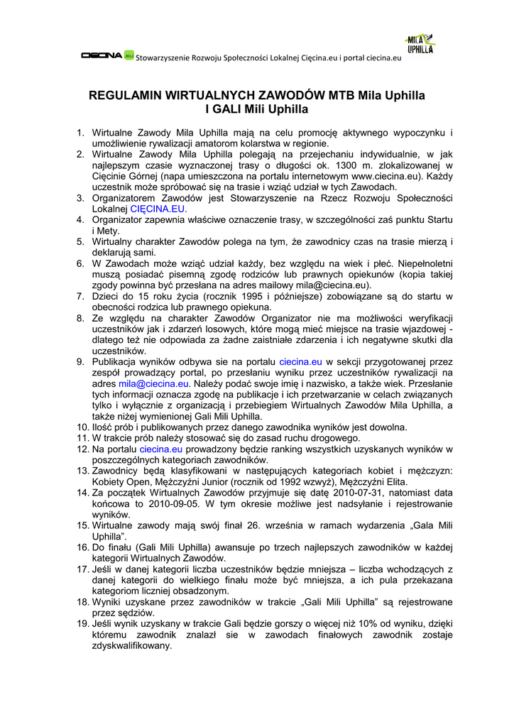 Stowarzyszenie Rozwoju Społeczności Lokalnej Cięcina.eu i portal ciecina.eu ciecina REGULAMIN WIRTUALNYCH ZAWODÓW MTB Mila Uphilla I GALI Mili Uphilla 1. Wirtualne Zawody Mila Uphilla mają na celu promocję aktywnego wypoczynku i umożliwienie rywalizacji walizacji amatorom kolarstwa w regionie. 2. Wirtualne Zawody Mila Uphilla polegają na przejechaniu indywidualnie, w jak najlepszym ajlepszym czasie wyznaczonej trasy o długości długo ci ok. 1300 m. zlokalizowanej w Cięcinie Górnej (napa napa umieszczona na portalu internetowym www.ciecina.eu). www.ciecina.eu Każdy uczestnik może e spróbować spróbowa się na trasie i wziąć udział w tych Zawodach. 3. Organizatorem Zawodów jest Stowarzyszenie na Rzecz Rozwoju Społeczności Społeczno Lokalnej CIĘCINA.EU. CINA.EU. 4. Organizator zapewnia właściwe wła oznaczenie trasy, w szczególności ści za zaś punktu Startu i Mety. rtualny charakter Zawodów polega na tym, że e zawodnicy czas na trasie mierzą mierz i 5. Wirtualny deklarują sami. 6. W Zawodach może że wziąć wzi udział każdy, bez względu du na wiek i płeć. płe Niepełnoletni muszą posiadać pisemn pisemną zgodę rodziców lub prawnych opiekunów (kopia takiej zgody powinna byćć przesłana na adres mailowy [email protected]). [email protected]). 7. Dzieci do 15 roku życia (rocznik 1995 i późniejsze) zobowiązane ązane są s do startu w obecności ci rodzica lub prawnego opiekuna. 8. Ze względu du na charakter Z Zawodów Organizator nie ma możżliwości weryfikacji uczestników ików jak i zdarzeń zdarze losowych, które mogą mieć miejsce na trasie wjazdowej dlatego też nie odpowiada za żadne adne zaistniałe zdarzenia i ich negatywne skutki dla uczestników. 9. Publikacja wyników odbywa sie na portalu ciecina.eu w sekcji przygotowanej przez zespół prowadzący cy portal, portal po przesłaniu wyniku przez uczestników rywalizacji na adres [email protected]. [email protected] Należy podać swoje imię i nazwisko, a takżże wiek. Przesłanie tych informacji oznacza zgodę zgod na publikacje i ich przetwarzanie w celach związanych zwi tylko i wyłącznie cznie z organizacją organizacj i przebiegiem Wirtualnych Zawodów Mila Uphilla, a także niżej ej wymienionej Gali Mili Uphilla. 10. Ilość prób i publikowanych przez danego zawodnika wyników jest dowolna. 11. W trakcie prób należy ży stosowa stosować się do zasad ruchu drogowego. 12. Na portalu ciecina.eu prowadzony będzie ranking wszystkich uzyskanych wyników w poszczególnych kategoriach zawodników. 13. Zawodnicy będą klasyfikowani w następujących nast kategoriach kobiet i mężczyzn: Kobiety Open, Mężczy czyźni Junior (rocznik od 1992 wzwyż), Mężczy czyźni Elita. 14. Za początek tek Wirtualnych Zawodów przyjmuje się si datę 2010-07-31 31, natomiast data końcowa to 2010-09--05. W tym okresie możliwe liwe jest nadsyłanie i rejestrowanie wyników. 15. Wirtualne zawody mają maj swój finał 26. września w ramach wydarzenia „Gala Mili Uphilla”. 16. Do finału (Gali Mili Uphilla) Uphilla) awansuje po trzech najlepszych zawodników w każdej kategorii Wirtualnych Zawodów. 17. Jeślili w danej kategorii liczba uczestników będzie b mniejsza – liczba wchodzących wchodz z danej kategorii do wielkiego finału może mo być mniejsza, a ich pula przekazana kategoriom liczniej obsadzonym. 18. Wyniki uzyskane przez zawodników w trakcie „Gali Mili Uphilla” Uphilla są rejestrowane przez sędziów. 19. Jeślili wynik uzyskany w trakcie Gali będzie b gorszy o więcej niż 10% od wyniku, dzięki któremu zawodnik odnik znalazł sie w zawodach finałowych zawodnik zostaje zdyskwalifikowany. Stowarzyszenie Rozwoju Społeczności Lokalnej Cięcina.eu i portal ciecina.eu ciecina 20. W trakcie przejazdów w trakcie „Gali Mili Uphilla”” zawodnik nie może mo wykonać więcej niż 5 m. prowadzącc rower. Nieprzestrzeganie tego wymogu będzie b skutkowało dyskwalifikacją. W Wirtualnych irtualnych Zawodach zasada ta nie może może być by weryfikowana, więc nie obowiązuje. 21. Uczestnicy przejazdów finałowych otrzymują otrzymuj upominki i medale. Zwycięzcy Zwyci w poszczególnych kategoriach otrzymują otrzymuj nagrodę finansowa w wysokości wysoko 100 zł. 22. Organizator zapewnia opiekę opiek medyczną w trakcie „Gali Mili Uphilla” Uphilla Zawodnicy startują na własne ryzyko i odpowiedzialność. odpowiedzialno 23. Organizator zaleca używanie ywanie podczas prób ochraniaczy i kasków. 24. Organizator nie ponosi odpowiedzialności odpowiedzialno ci za wypadki zaistniałe podczas prób, ani przejazdów w trakcie akcie „Gali Mili Uphilla” a także tak – zgodnie z punktem 7. – w trakcie prób w ramach Wirtualnych Zawodów Mila Uphilla (zasada odnosi się si również do zjazdów z Ficońki, ki, kiedy to zaleca si się szczególną ostrożność). 25. Wirtualne Zawody Mila Uphilla i „Gala Mili Uphilla” nie wiążą sie z uiszczaniem opłat wpisowych (startowych). 26. Organizator zastrzega sobie prawo do zmiany zapisów niniejszego regulaminu. regulaminu 27. Organizator zastrzega sobie prawo do zmiany terminu rozpoczę rozpoczęcia i zakończenia Wirtualnych Zawodów, a także tak terminu Gali Mili Uphilla bez podania przyczyny. przyczyny 28. Wszystkie sytuacje nie objęte obj niniejszym regulaminem podlegają rozpatrzeniu przez Organizatora. 29. Wniesienie protestu wiąże wi sie z uiszczeniem opłaty w wysokości ci 2 200 zł. W przypadku zasadności ci protestu opłata jest zwracana zgłaszającemu protest 30. Udział w zawodach oznacza akceptację akceptacj regulaminu.