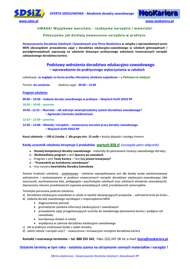 OFERTA SZKOLENIOWA - Akademia doradcy zawodowego www.sdsiz.pl www.neokariera.pl UWAGA! Wyjątkowe warsztaty - roz daj emy narzędzia i materi ały ! Pokazujemy jak działają nowoczesne narzędzia w praktyce. Stowarzyszenie Doradców Szkolnych i Zawodowych oraz firma NeoKariera w związku z wprowadzonym przez MEN obowiązkiem prowadzenia zajęć z doradztwa edukacyjno-zawodowego w szkołach gimnazjalnych i ponadgimnazjalnych zapraszają na szkolenie dotyczące praktycznego wdrożenia nowoczesnych narzędzi całożyciowego doradztwa kariery: Podstawy wdrożenia doradztwa edukacyjno-zawodowego – wprowadzenie do praktycznego wykorzystania w szkołach Lokalizacja: ze względu na liczne prośby oferujemy szkolenia wyjazdowe – u Państwa na miejscu! Termin: do ustalenia Godziny zajęć: 09.00 – 14.00 Program szkolenia: 09:00 – 10:30 – Zadania dorady zawodowego w praktyce – Wojciech Kreft SDSiZ RP 10:30 – 10:45 – przerwa 10:45– 12:15 – Warsztat – Jak wdrożyć wewnątrzszkolny system doradztwa zawodowego? – Agnieszka Ciereszko (webinarium) 12:15 – 12:30 – przerwa 12:30 – 14:00 – Metody i narzędzia – nowoczesny warsztat pracy doradcy zawodowego – Wojciech Kreft SDSiZ RP Koszt szkolenia – 190 zł./osobę / dla grupy min. 15 osób + koszty dojazdu i noclegu trenera Każdy uczestnik szkolenia otrzymuje 5 produktów wartych 858 zł (szczegóły patrz załącznik): a. - Rozwój kompetencji doradcy zawodowego - materiały do planowania rozwoju zawodowego doradcy b. - Multimedialny program z serii Spacery po zawodach, c. - Program z serii Testy Kariery – Test Czy jestem kreatywny? d. - "Przewodnik po kształceniu zawodowym" e. - trzy numery kwartalnika Doradca Zawodowy Poziom trudności szkolenia - podstawowy - szkolenie zaprojektowane jest dla każdej osoby zainteresowanej wdrożeniem i zastosowaniem w praktyce nowoczesnych narzędzi doradztwa edukacyjno-zawodowego (dla nauczycieli, wychowawców klas, pedagogów i psychologów szkolnych oraz szkolnych doradców zawodowych). Zapraszamy również przedstawicieli organów prowadzących szkół, przedstawicieli samorządów. Tematyka poruszana podczas szkolenia: a) Doradztwo edukacyjno-zawodowe w szkole w świetle obowiązujących przepisów - wdrożenie krok po kroku… b) Zadania dorady zawodowego wynikające z rozporządzenia MEN diagnozowanie potrzeb gromadzenie zasobów informacji edukacyjnych i zawodowych prowadzenie zajęć przygotowujących uczniów do świadomego planowania kariery i podjęcia roli zawodowej koordynacja działań w szkole współpraca w zakresie doradztwa edukacyjno-zawodowego c) Jak w praktyce zrealizować każde z zadań doradcy d) Jakich metod i narzędzi użyć? - nowoczesne i innowacyjne narzędzia doradztwa kariery Kontakt i rezerwacja terminów – tel. 888 355 342; Faks: (22) 247 28 14; e-mail: [email protected] Ostatnie terminy w tym roku - ostatnia szansa na otrzymanie cennych materiałów i narzędzi ! Oferta szkoleniowa - Stowarzyszenie Doradców Szkolnych i Zawodowych RP